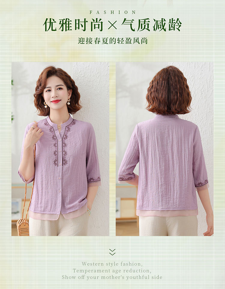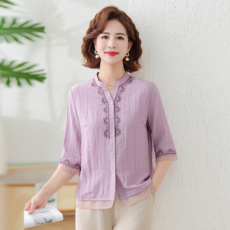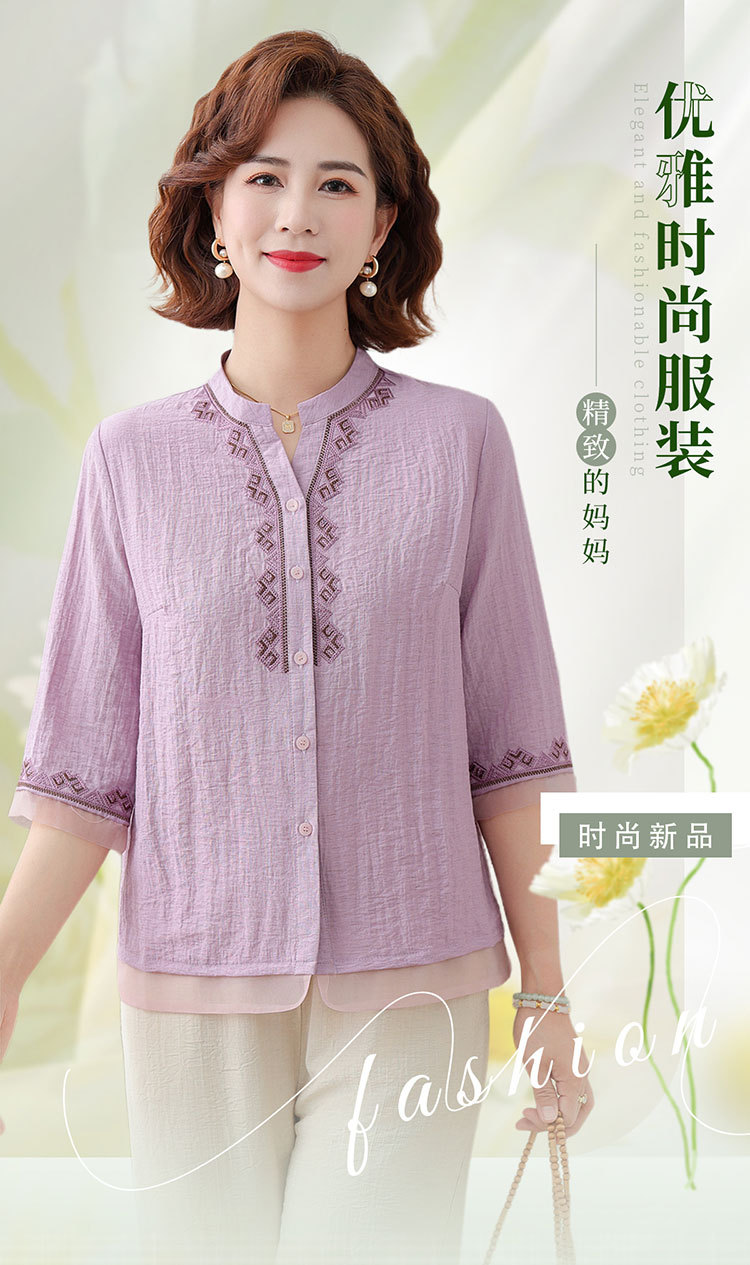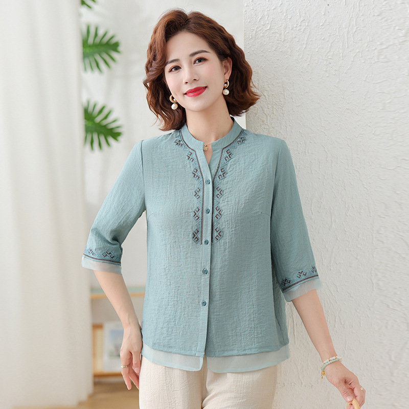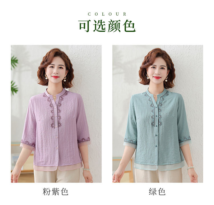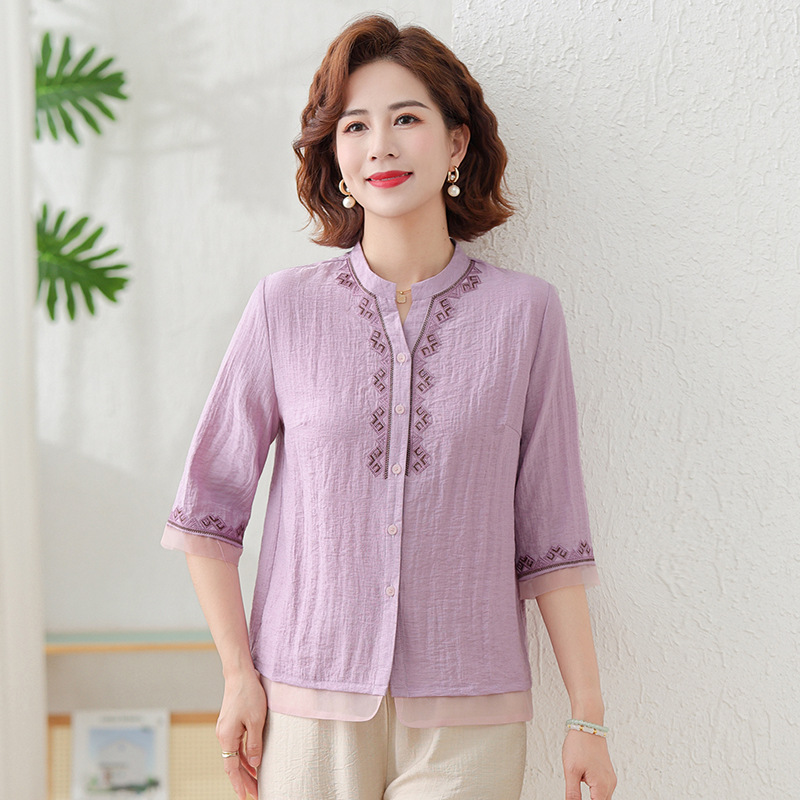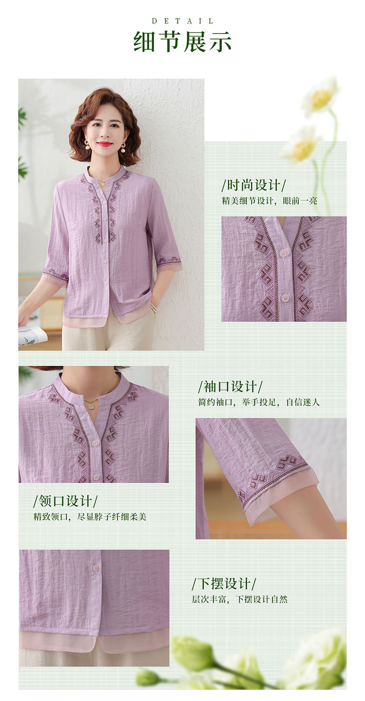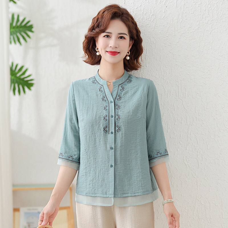 어머니의 여름 원피스 중간 소매 면화 및 리넨 티셔츠 중년 및 노인 여성 자수 오픈 버튼 단색 느슨한 플러스 사이즈 투피스 세트