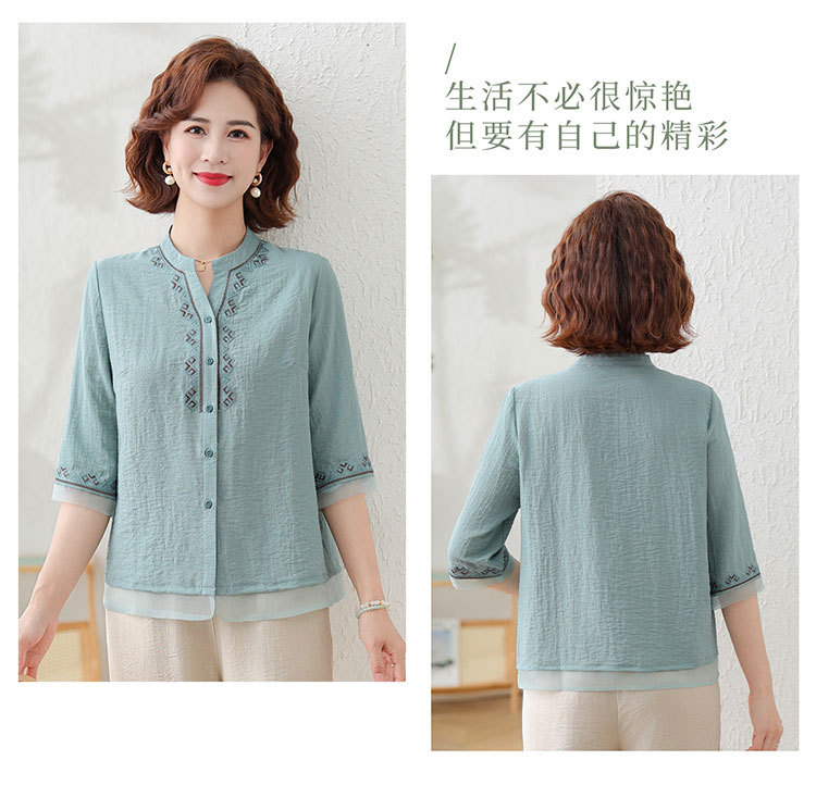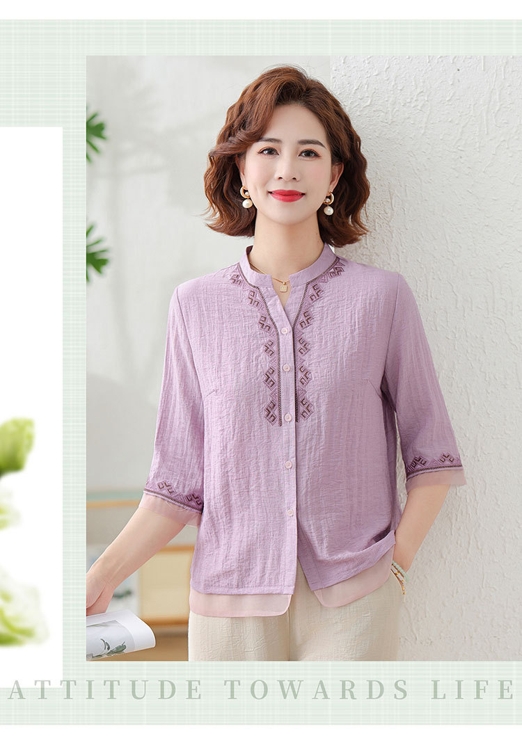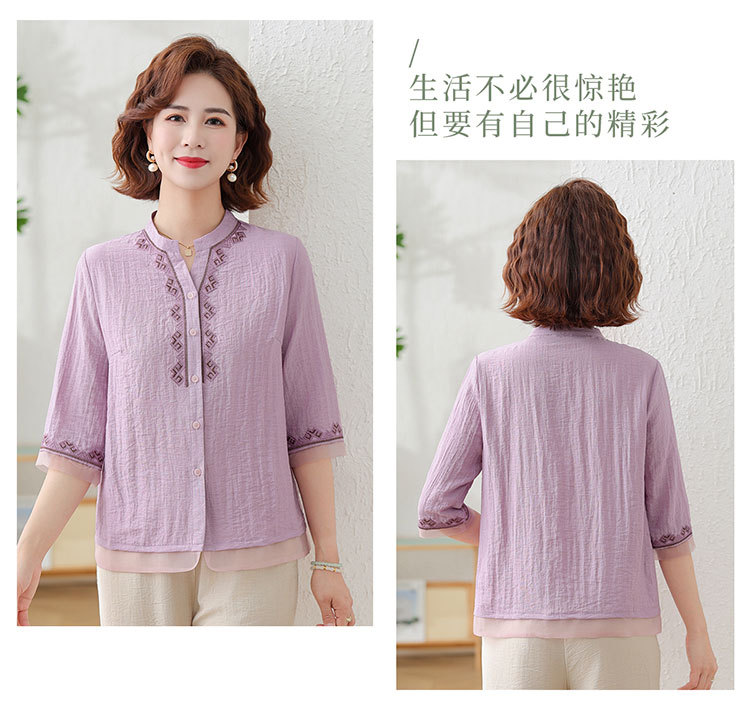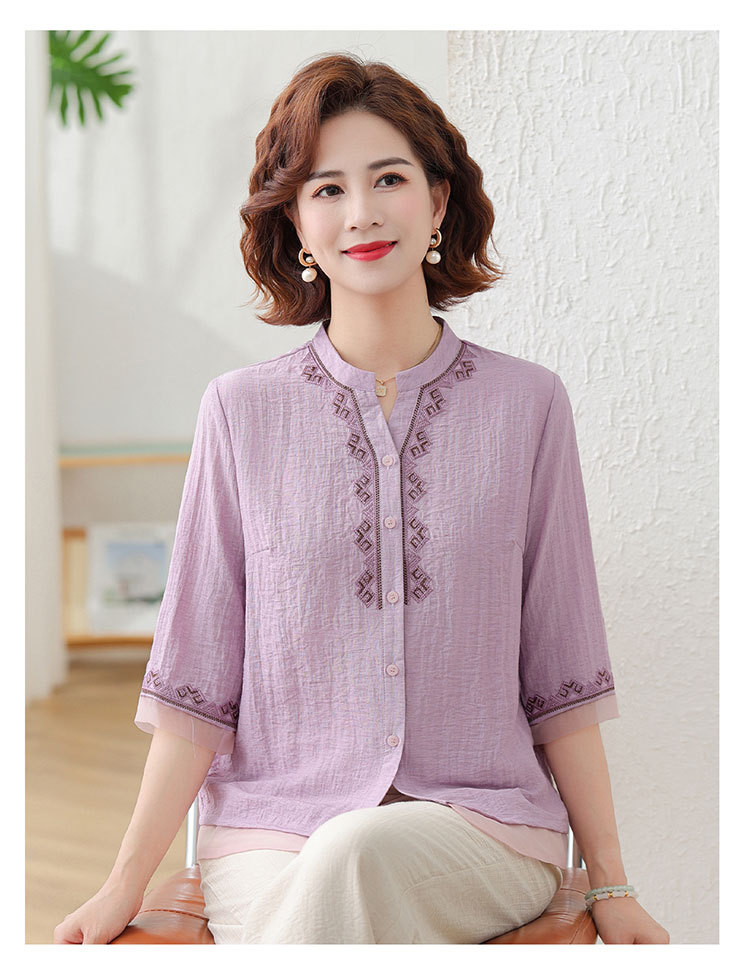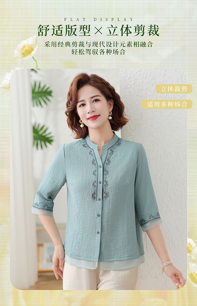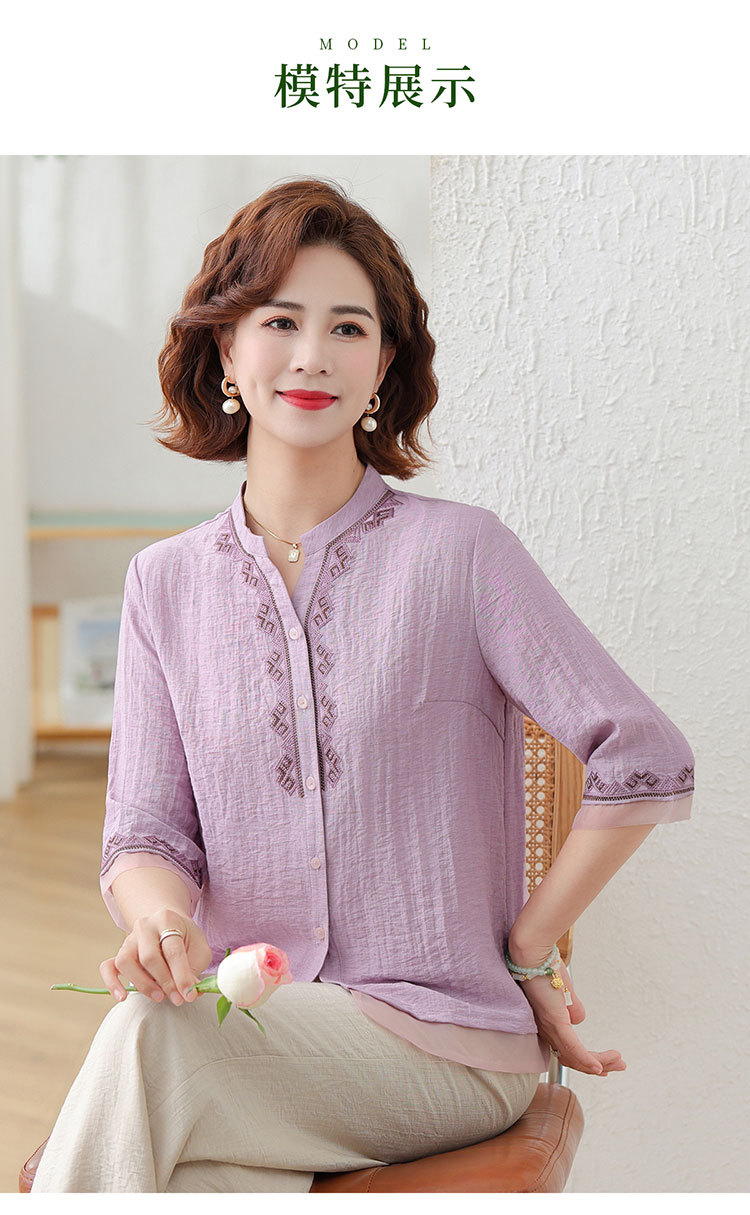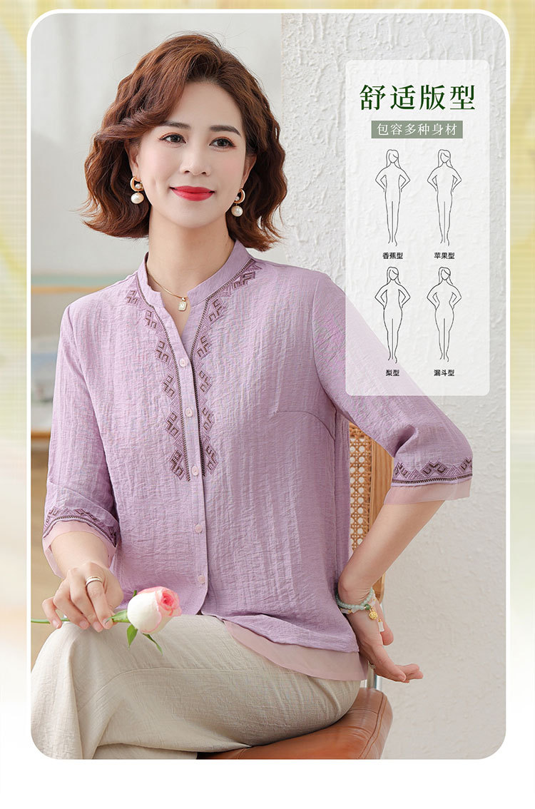 어머니의 여름 원피스 중간 소매 면화 및 리넨 티셔츠 중년 및 노인 여성 자수 오픈 버튼 단색 느슨한 플러스 사이즈 투피스 세트