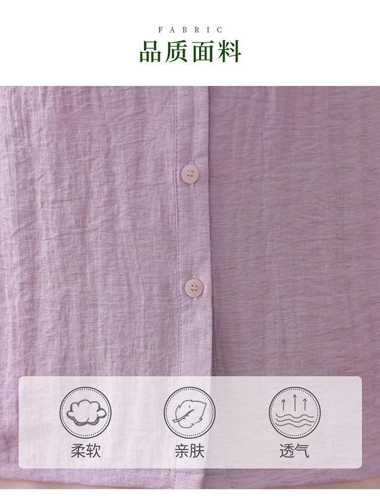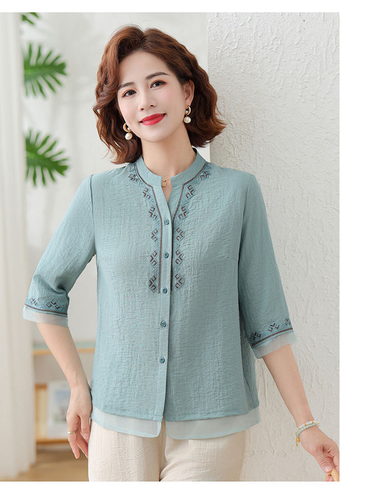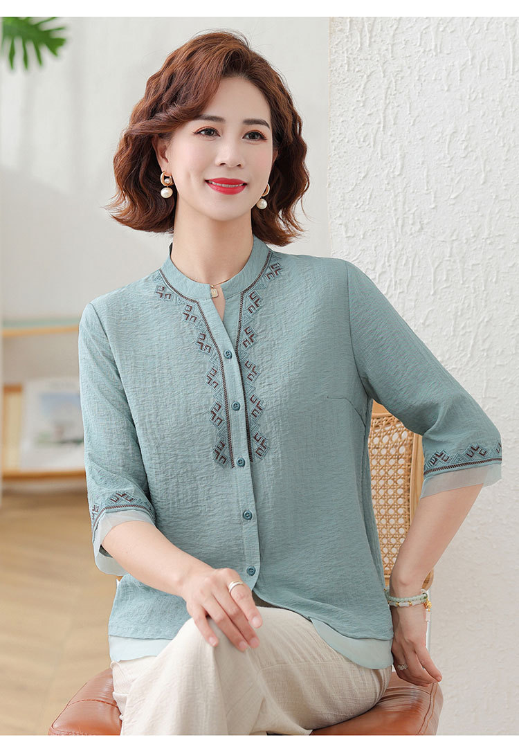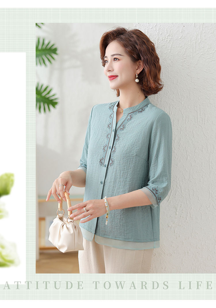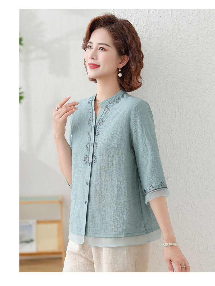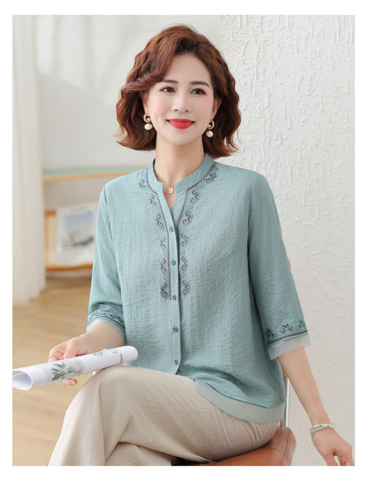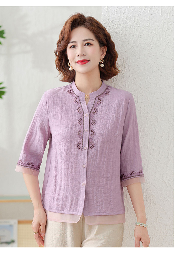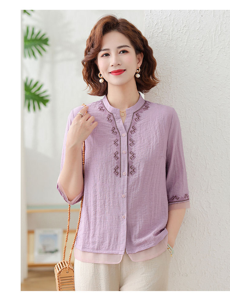 어머니의 여름 원피스 중간 소매 면화 및 리넨 티셔츠 중년 및 노인 여성 자수 오픈 버튼 단색 느슨한 플러스 사이즈 투피스 세트