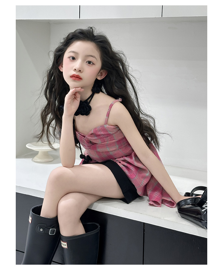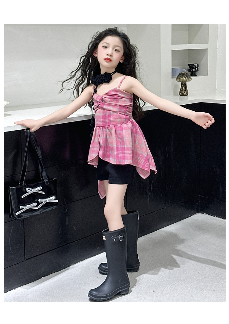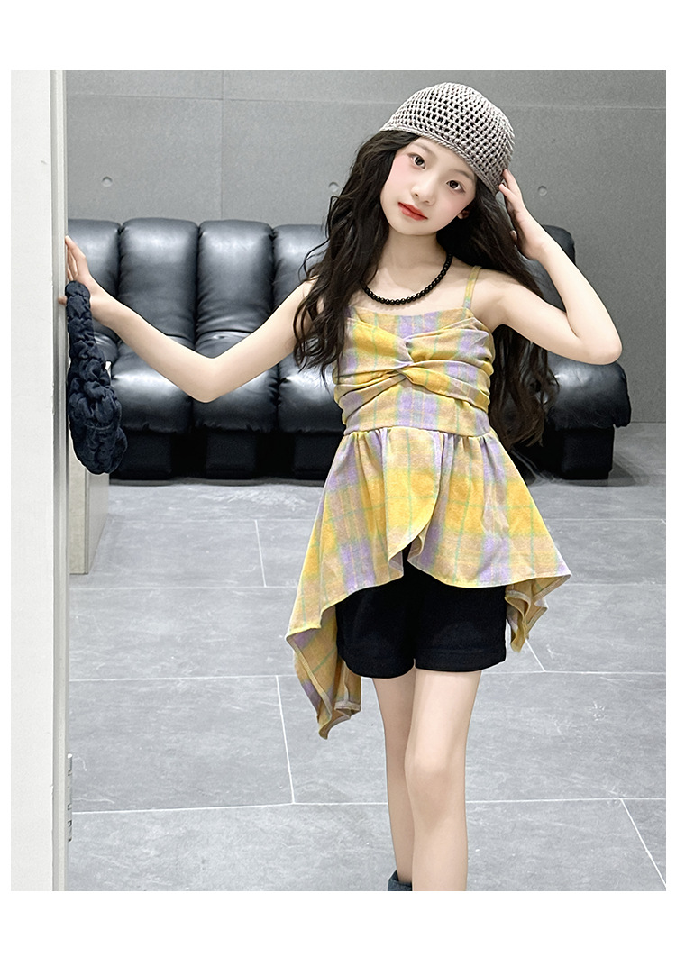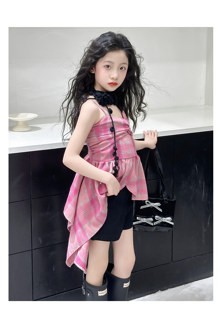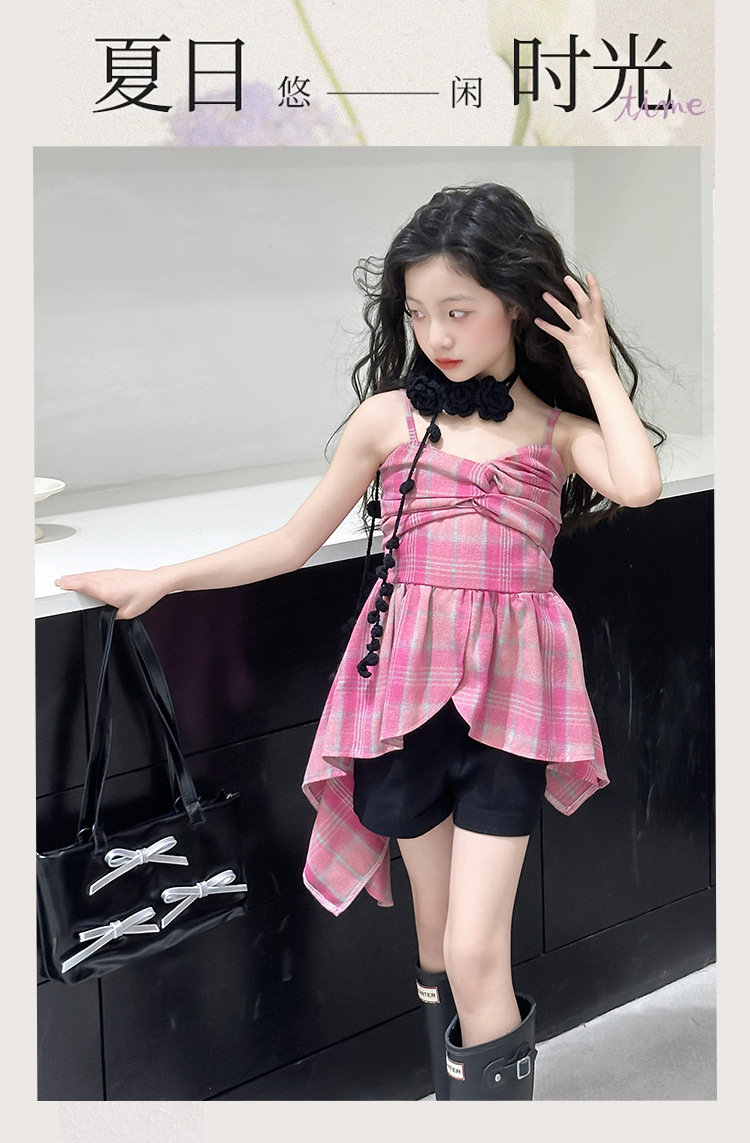크로스 보더 걸스 여름 원피스 반바지 2025 세트 어린이 여름 패션 격자 무늬 슬립 스커트 바지 세트