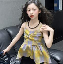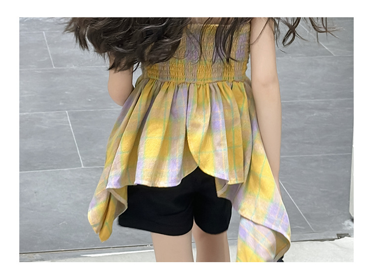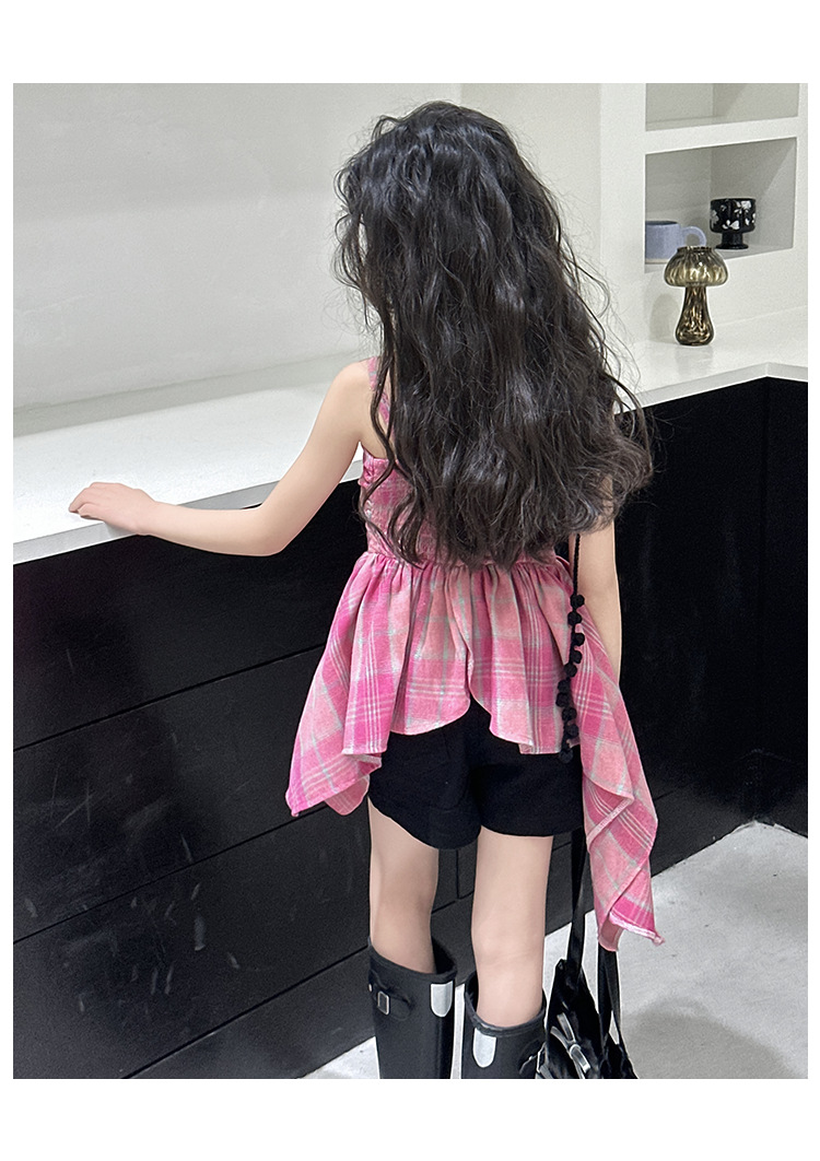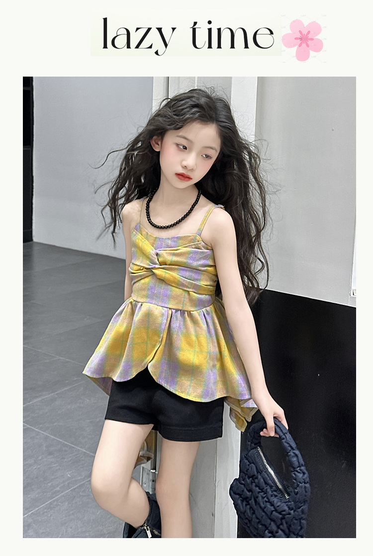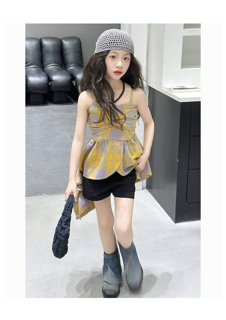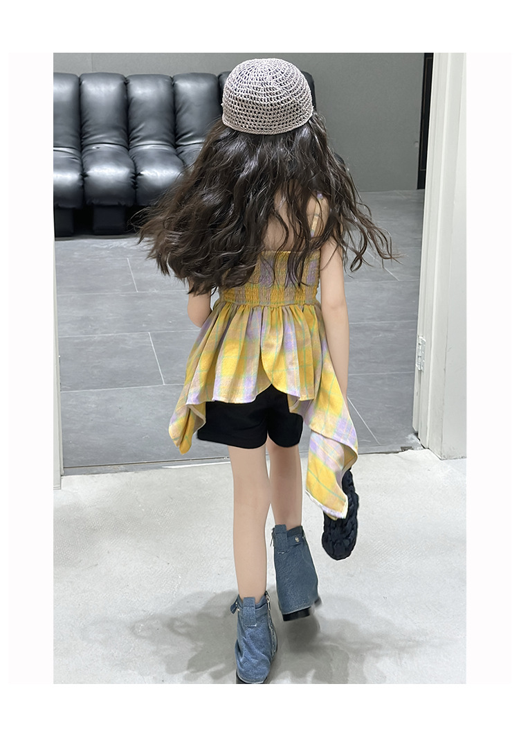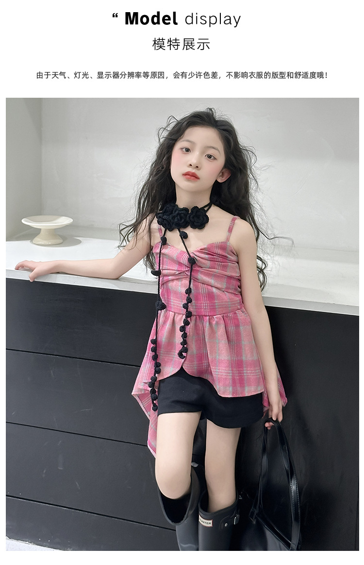 크로스 보더 걸스 여름 원피스 반바지 2025 세트 어린이 여름 패션 격자 무늬 슬립 스커트 바지 세트