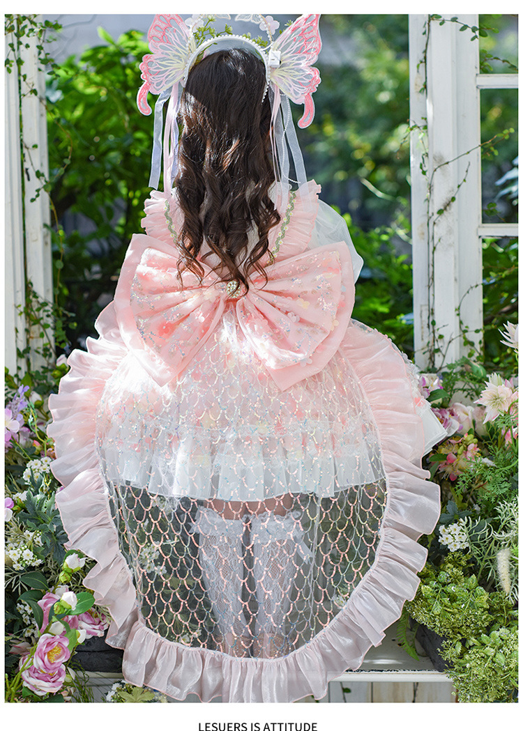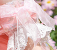 • 핑크색 스커트에는 긴 리본이 달려 있습니다.