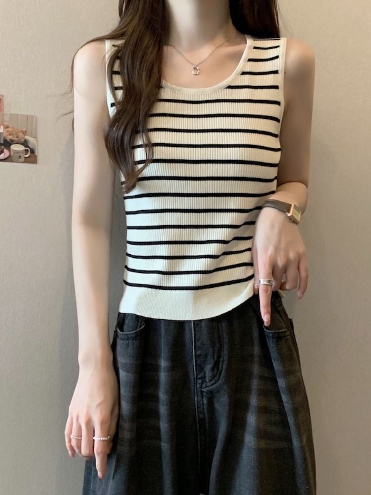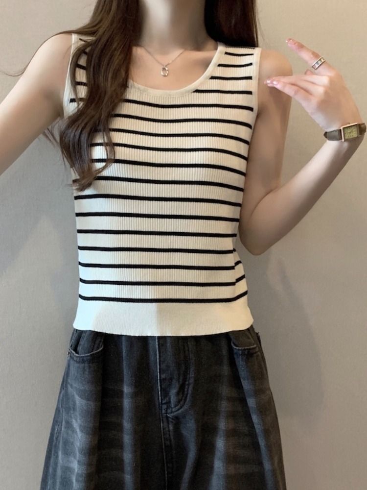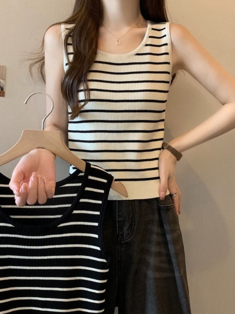 스트라이프 니트베이스 카미 솔 여성의 봄 새 도착 플러스 사이즈 여름을위한 배꼽 덮개 슬리밍 탑 통통녀