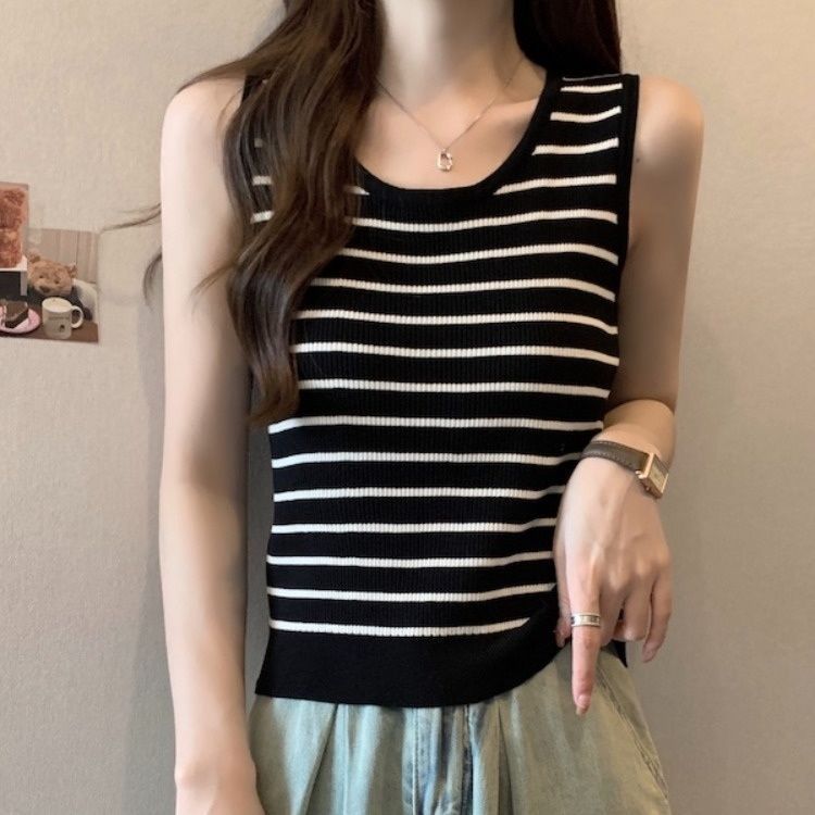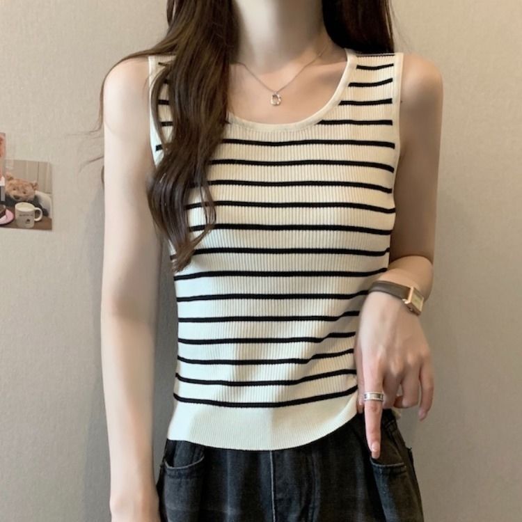 스트라이프 니트베이스 카미 솔 여성의 봄 새 도착 플러스 사이즈 여름을위한 배꼽 덮개 슬리밍 탑 통통녀스토어 가기