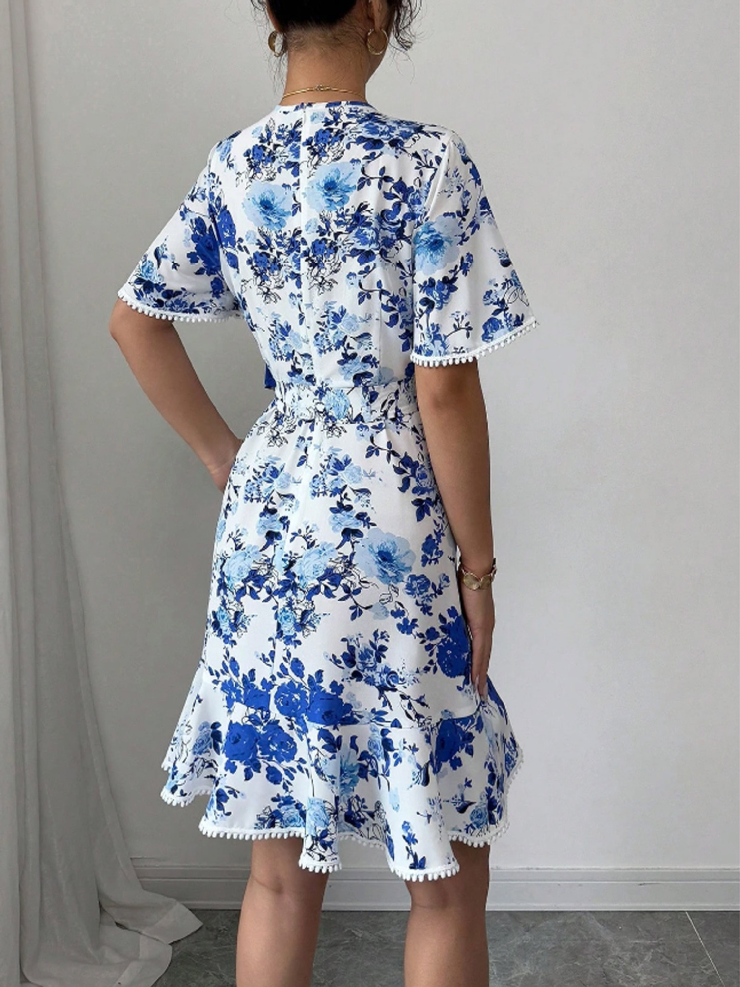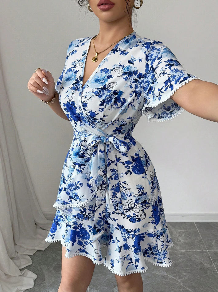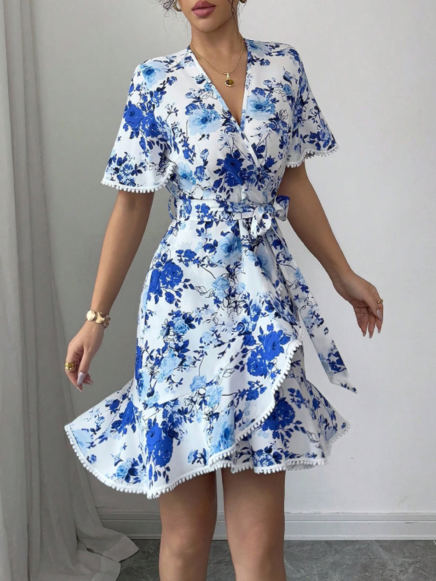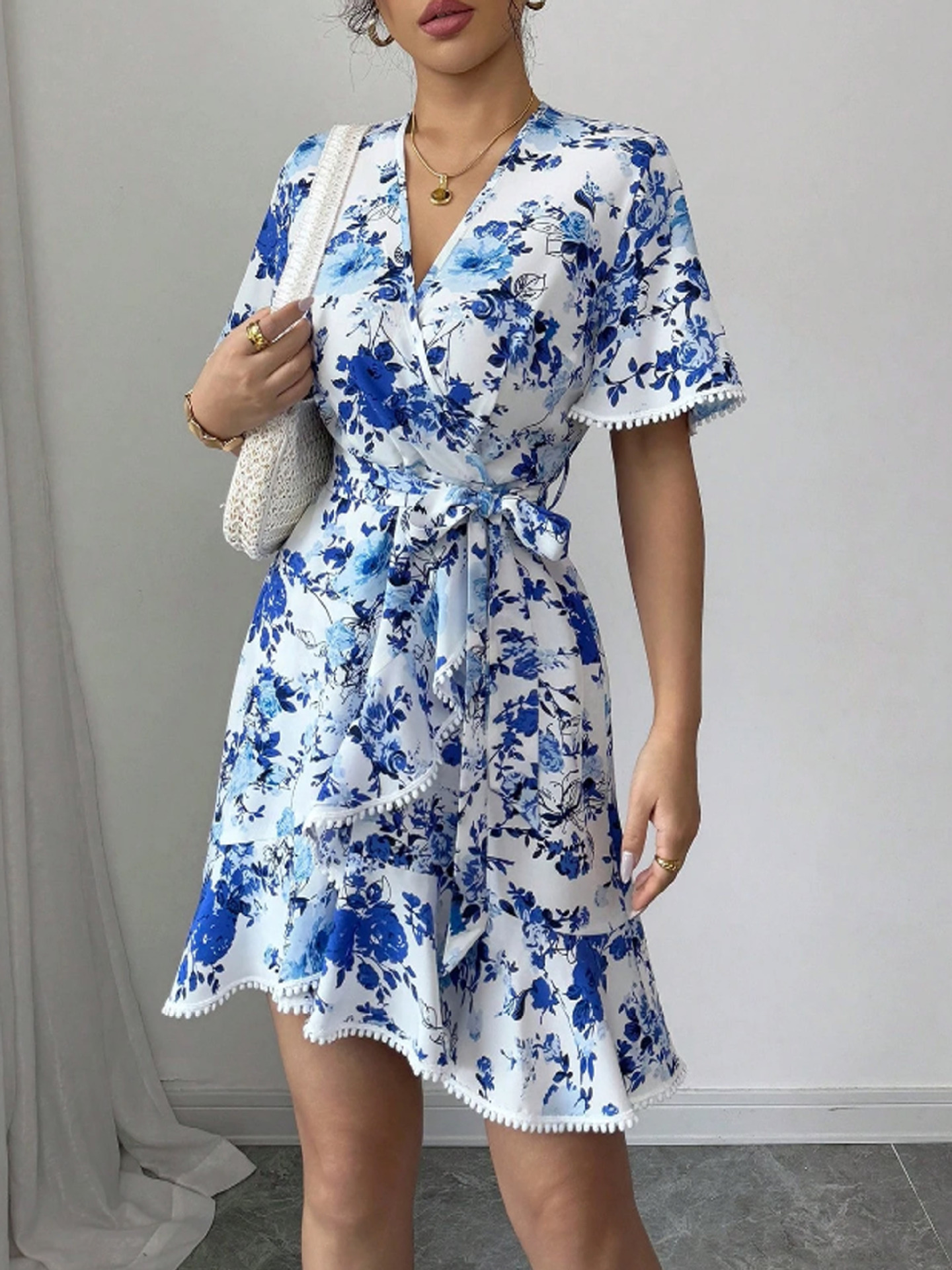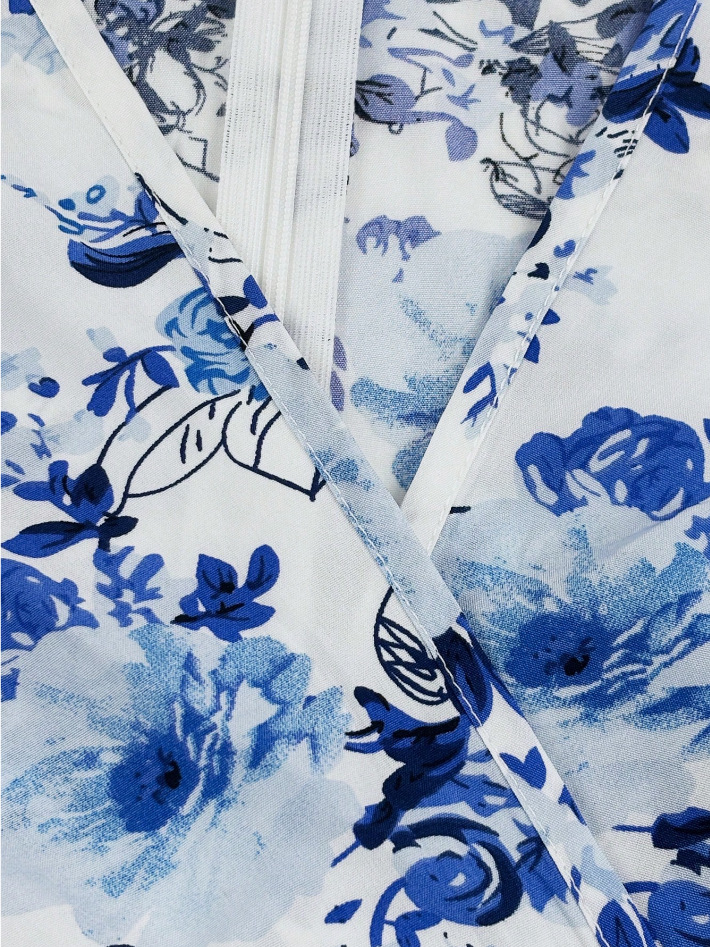 국경을 넘나드는 아마존 꽃무늬 레이스업 브이넥 프린트 웨이스트 드레스