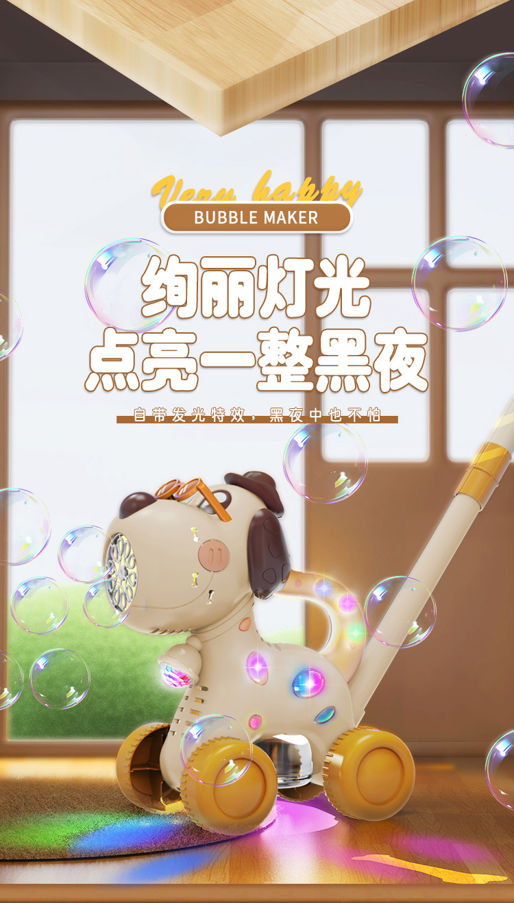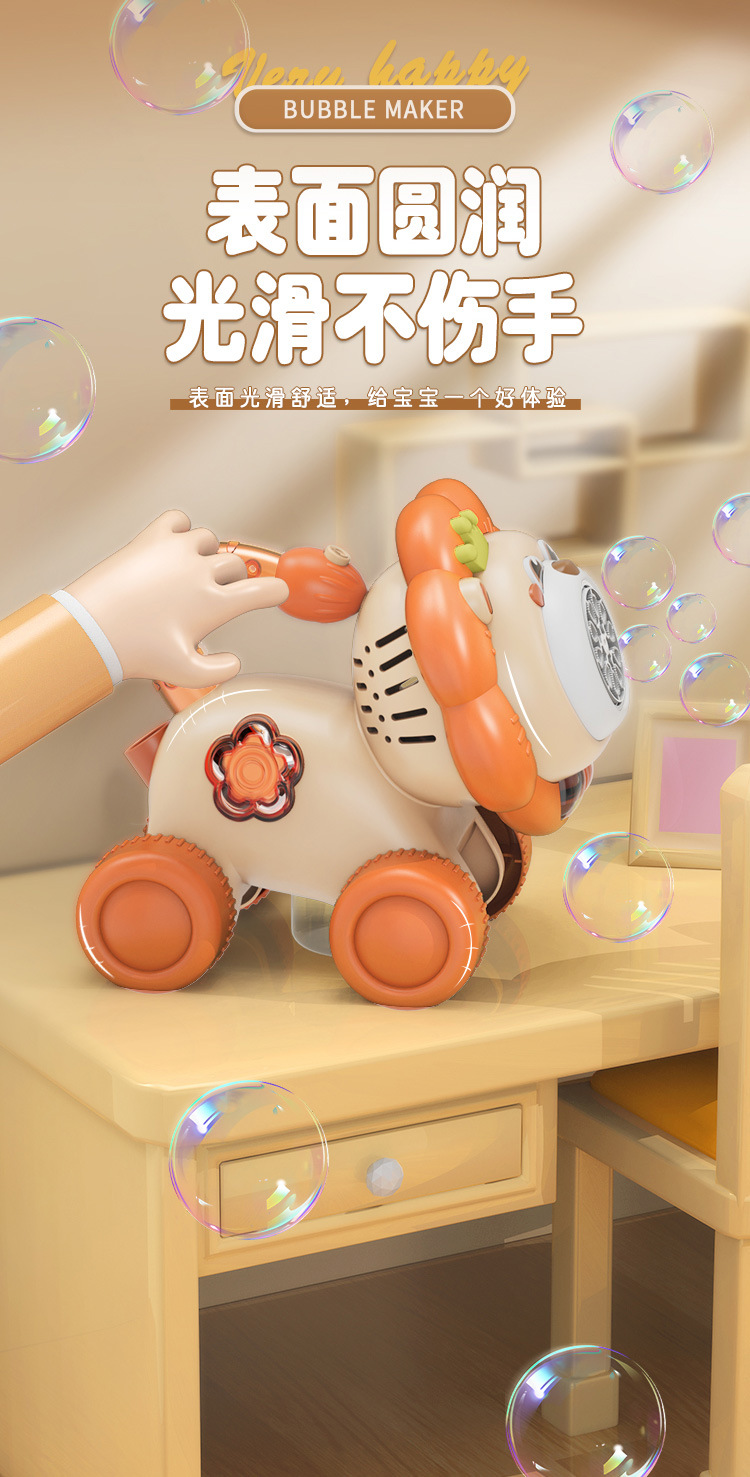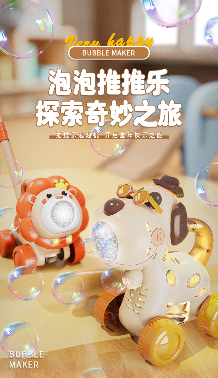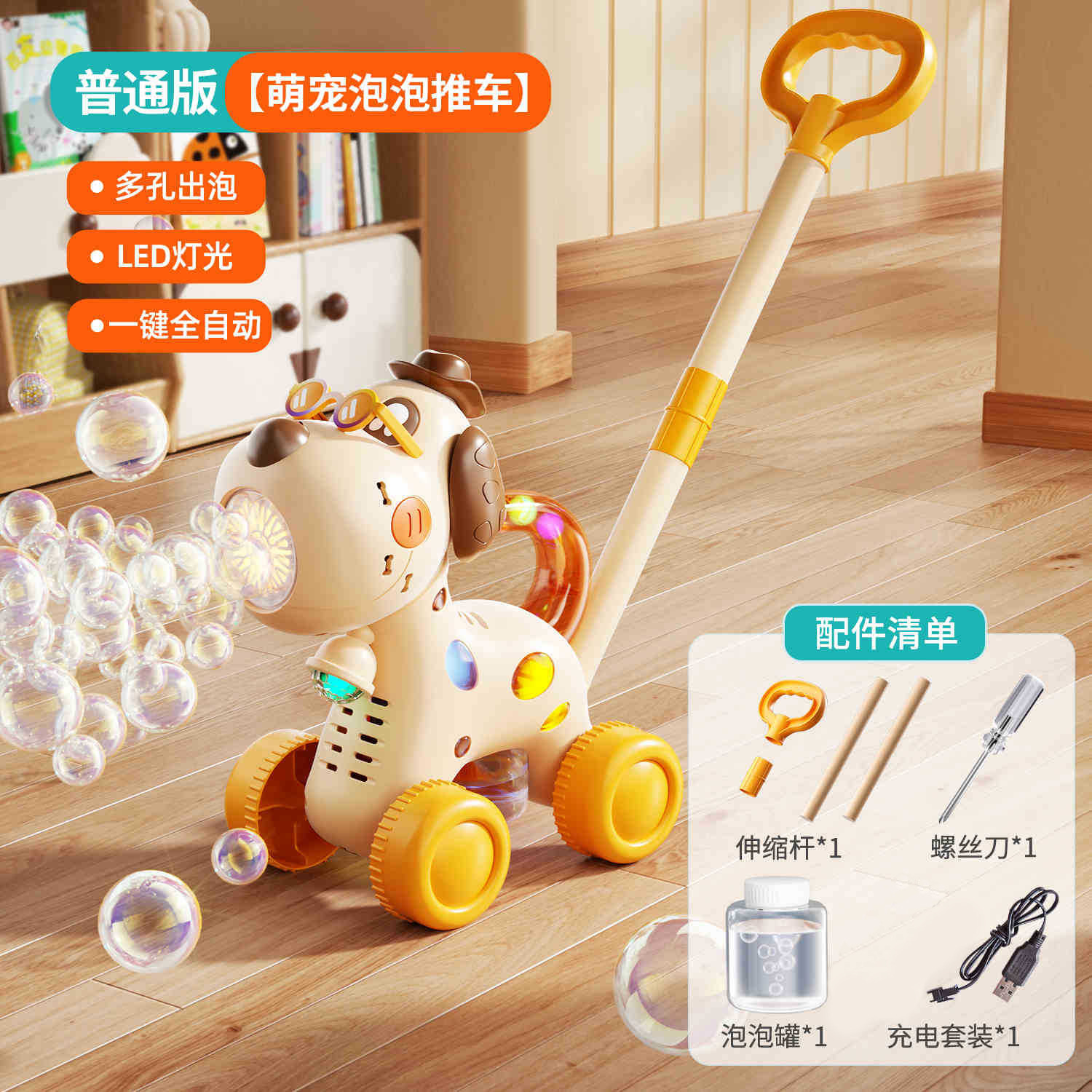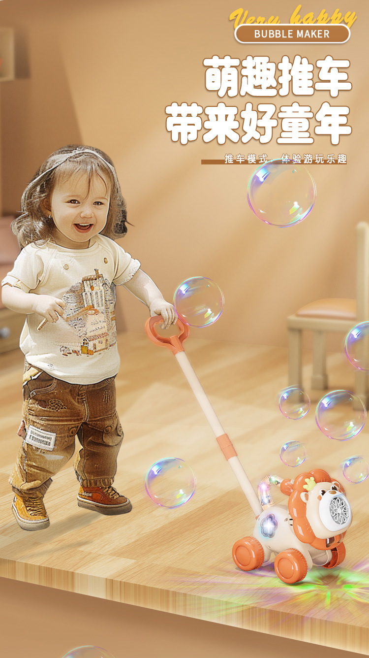 MOE 재미 사자 푸시 강아지 카트 어린이 장난감 전기 빛 거품 기계 야외 자동 거품 부는
