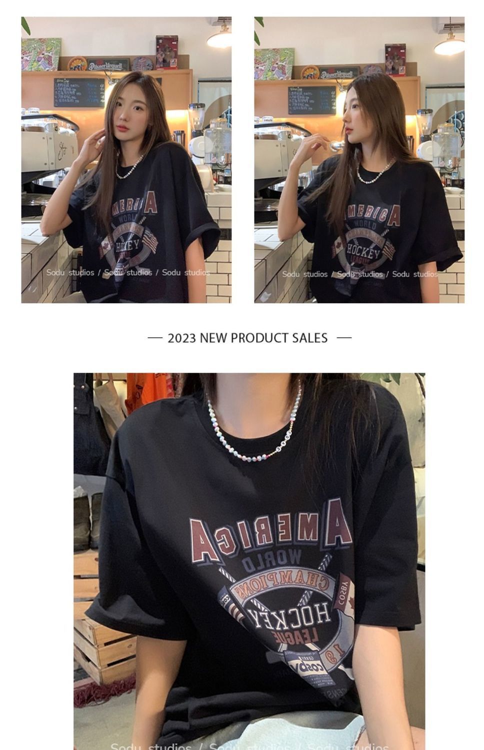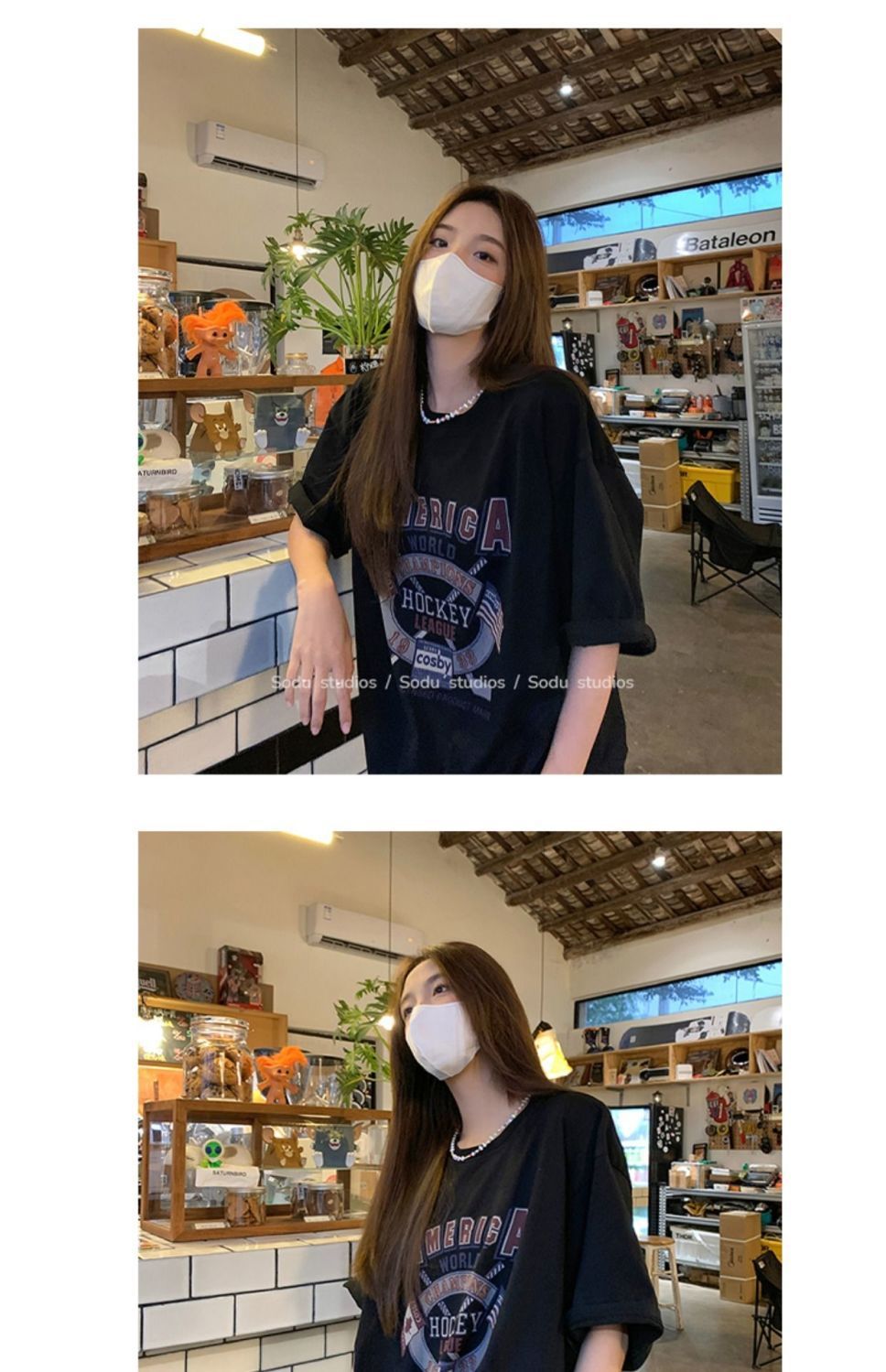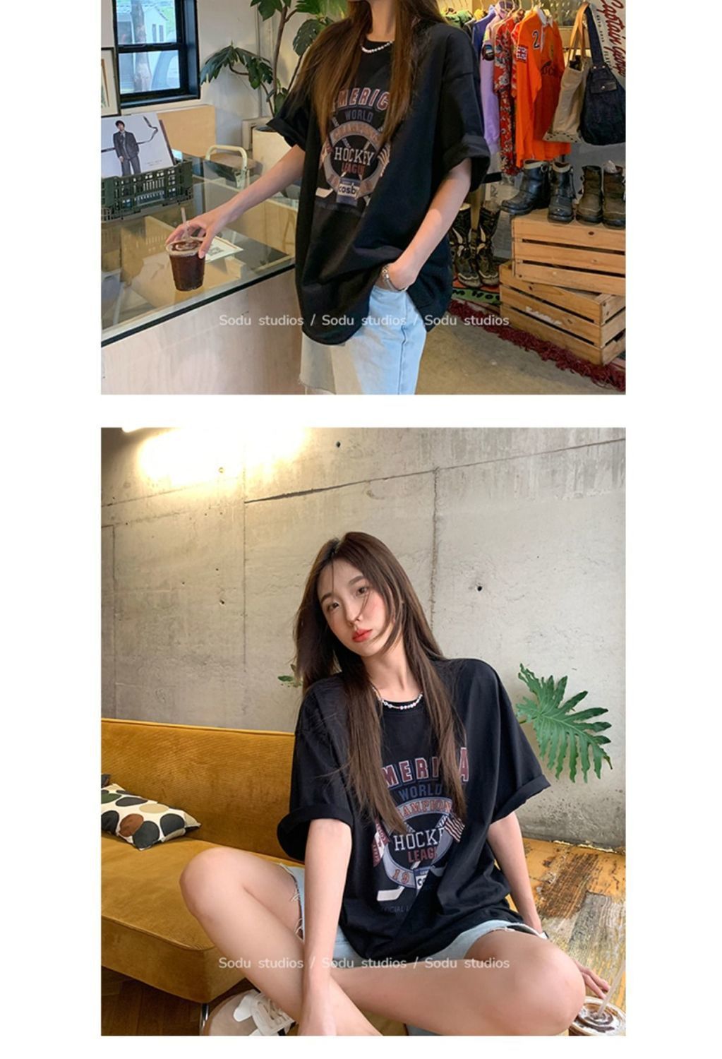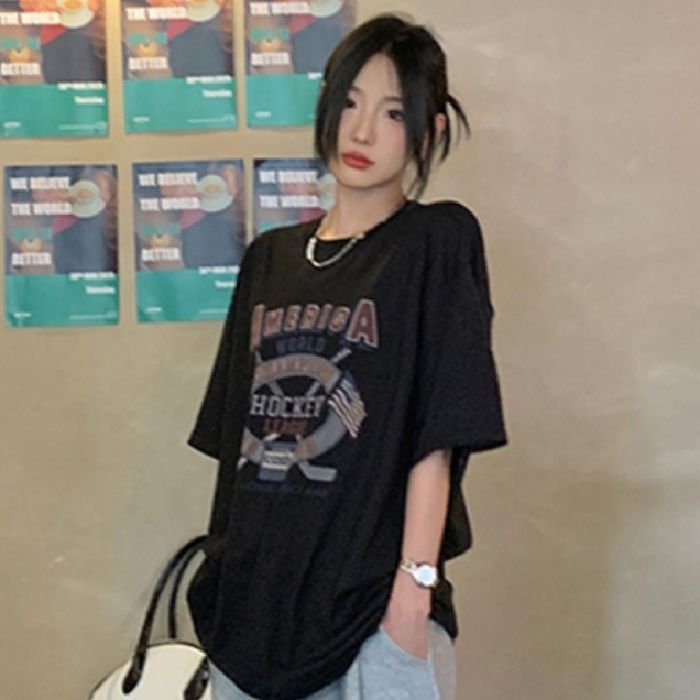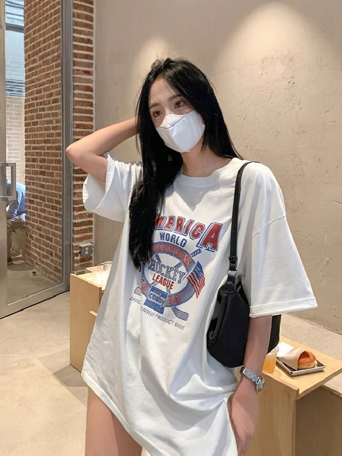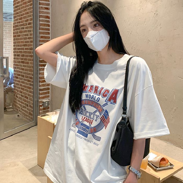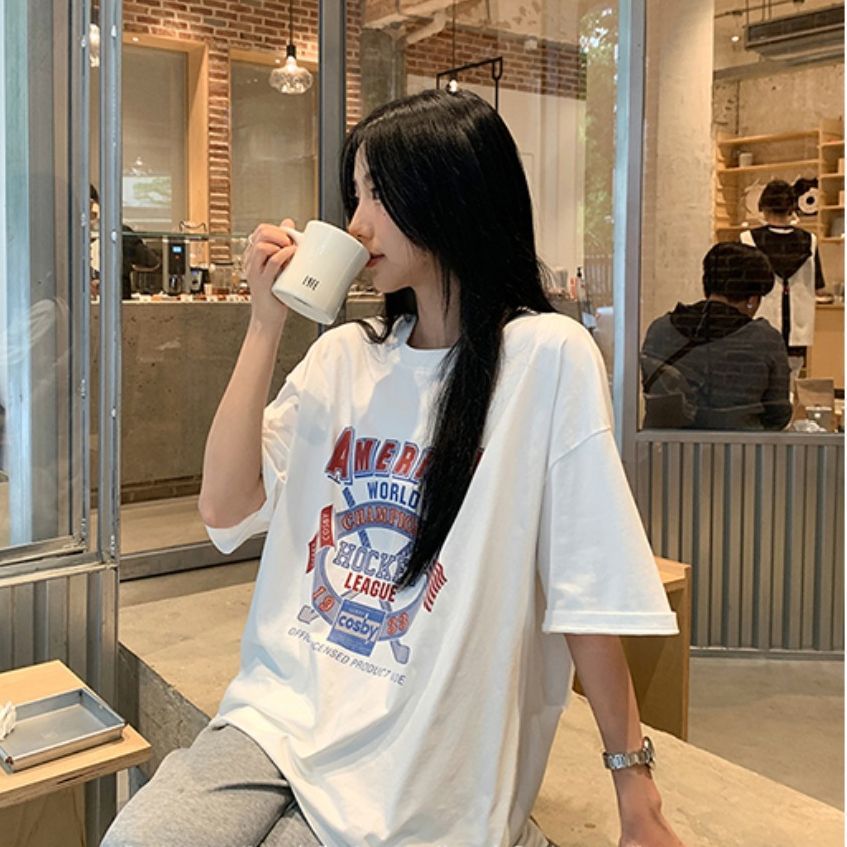 느슨한 둥근 목 중간 길이의 반팔 티셔츠 여성 여름 한국식 유행 연령 감소 캐주얼 탑 여성의 유행 머리스토어 가기