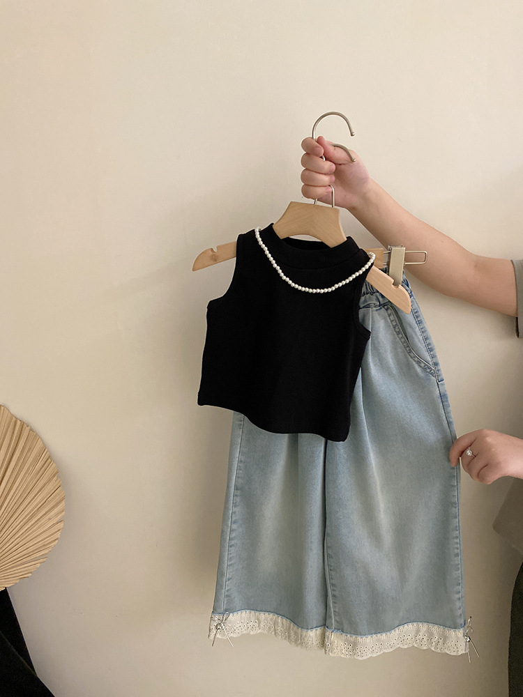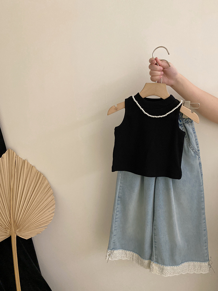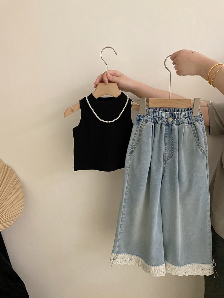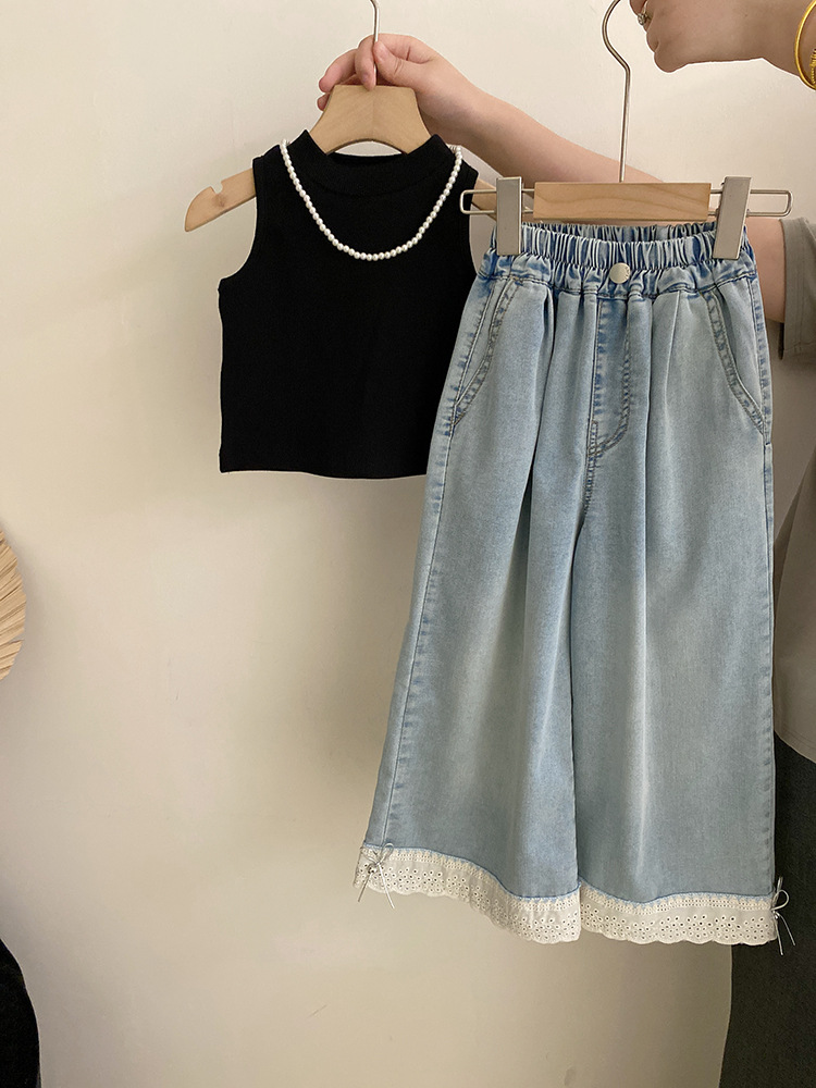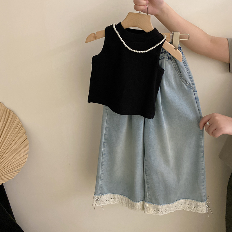 한국 스타일 걸스 여름 새로운 민소매 솔리드 컬러 올 매치 조끼 2025 느슨한 넓은 다리 레이스 청바지 투피스 세트
