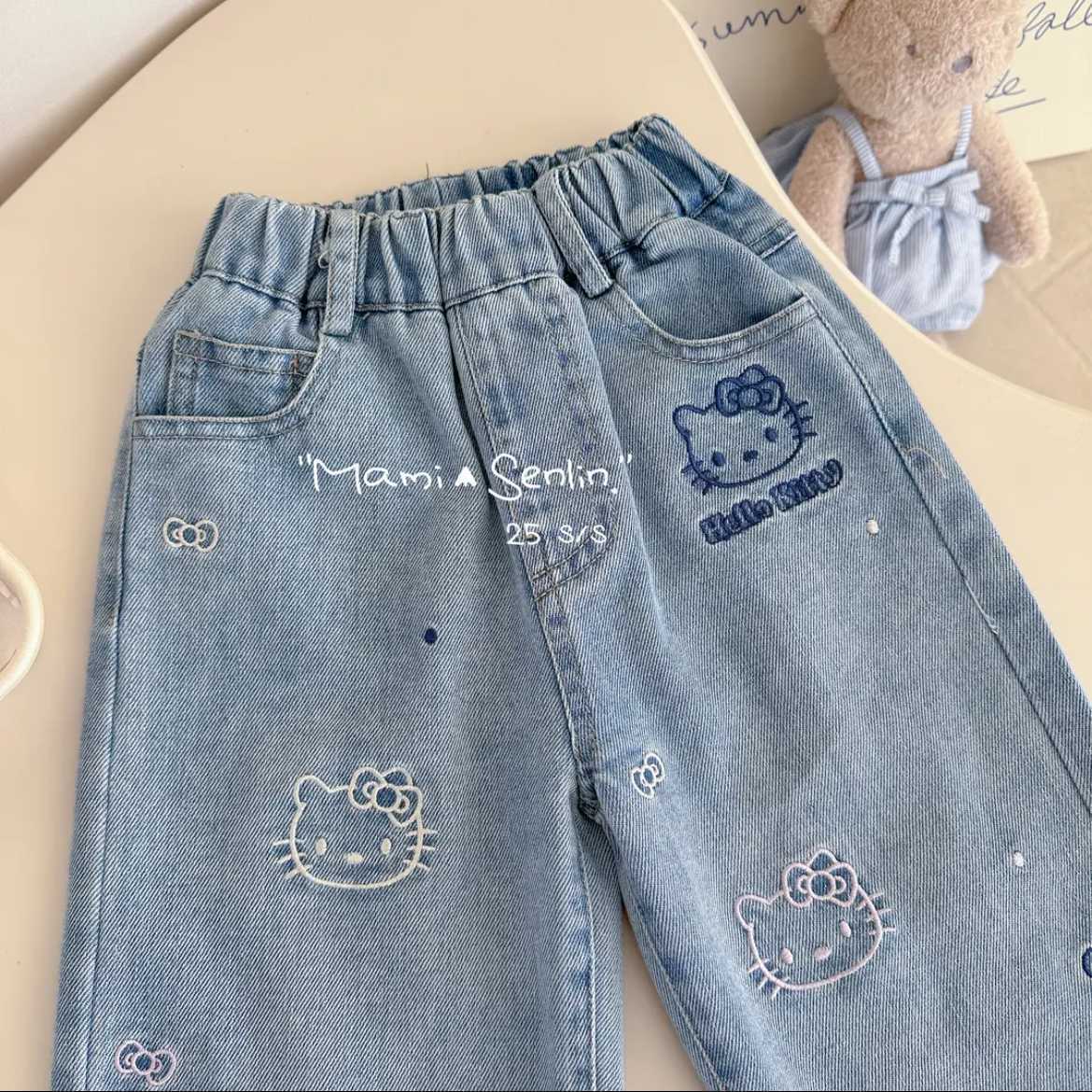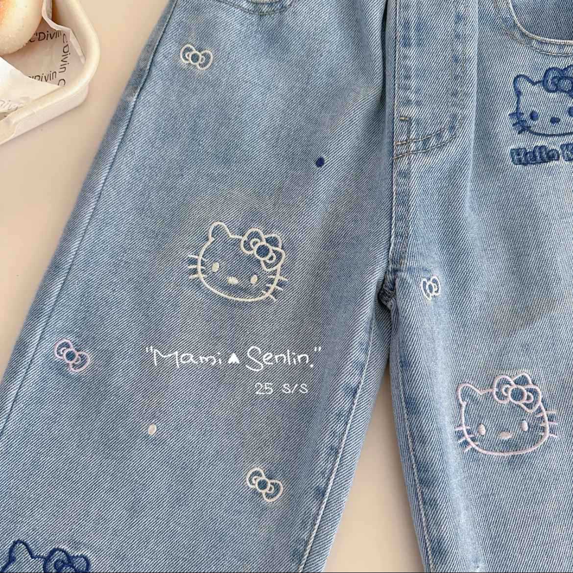 여자 키티 청바지 봄과 여름 2025 새로운 한국 스타일 부드러운 만화 자수 중소 캐주얼 바지스토어 가기