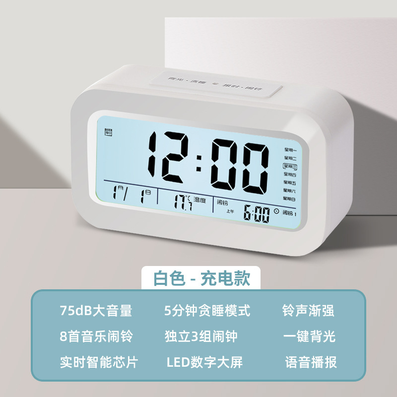 • [클래식] 충전식 화이트 [알람시계 3세트 + 벨소리 8개 + 스마트 야간 조명 + 음성 안내