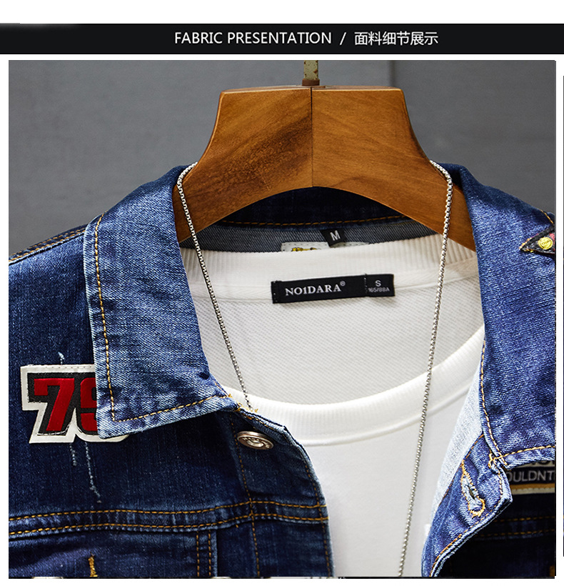 2023 새로운 자수 마이크로 스탬프 데님 재킷 트렌디 레트로 아메리칸 스트레치 슬림 남성 데님 재킷 블루스토어 가기