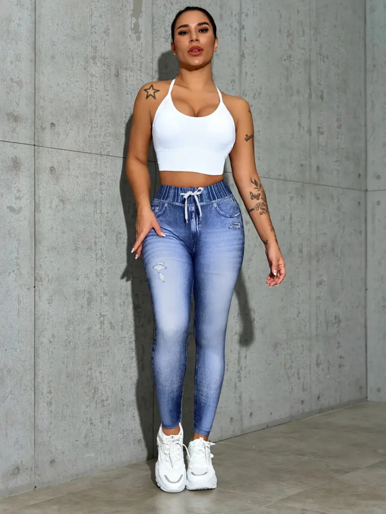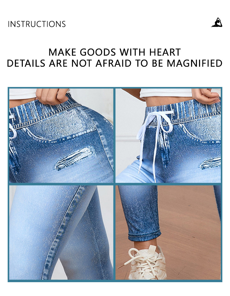 국경 간 새로운 대외 무역 여성 모방 데님 그림 높은 허리 인쇄 구멍 요가 바지 높은 탄성 엉덩이 레깅스 여성