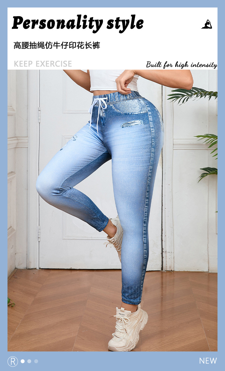 국경 간 새로운 대외 무역 여성 모방 데님 그림 높은 허리 인쇄 구멍 요가 바지 높은 탄성 엉덩이 레깅스 여성스토어 가기