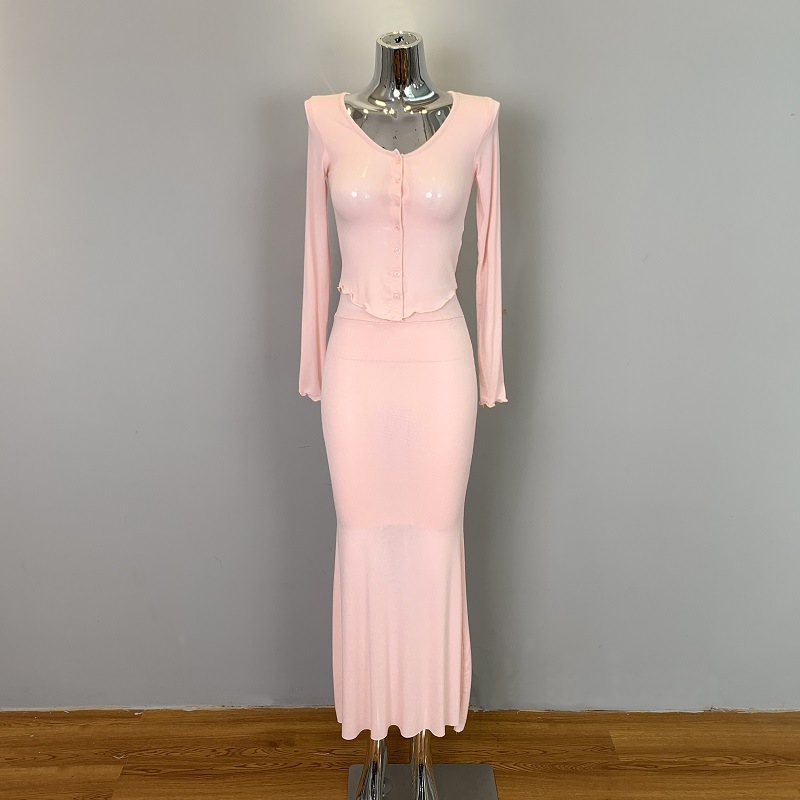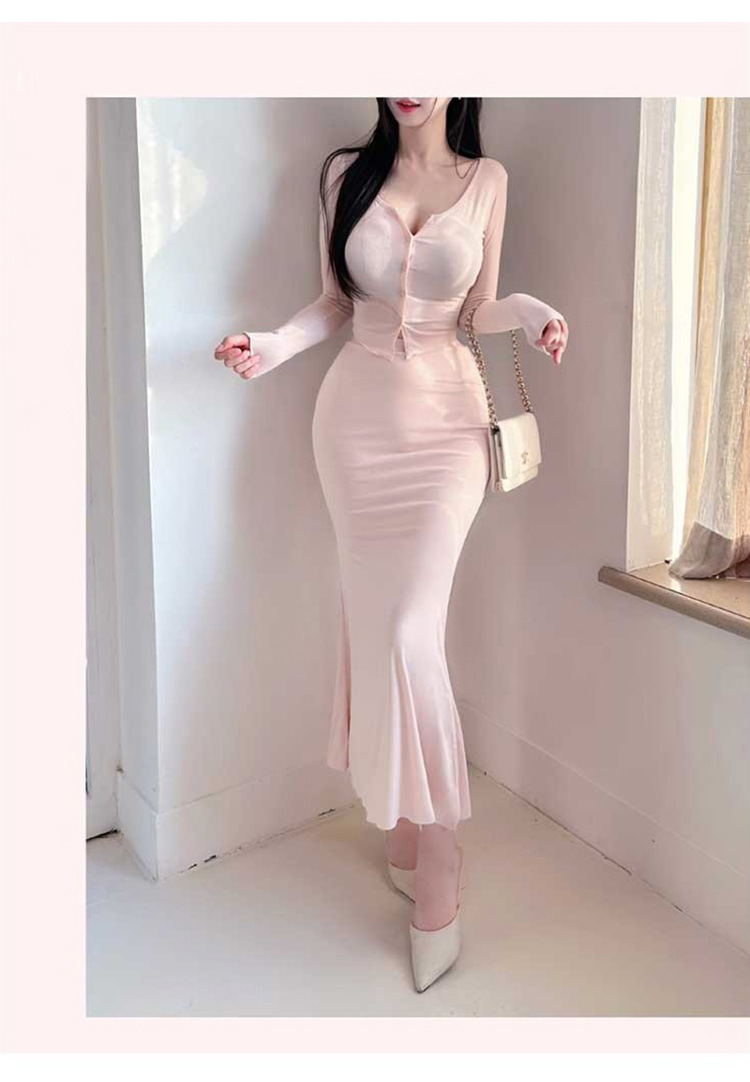 한국 동대문 몸매를 보여주는 섹시한 가슴을 드러내는 타이트한 반팔 가디건 + 여성용 피쉬테일 스커트 슈트