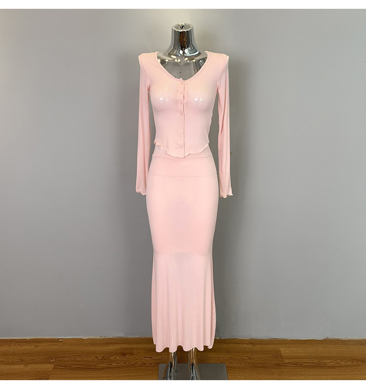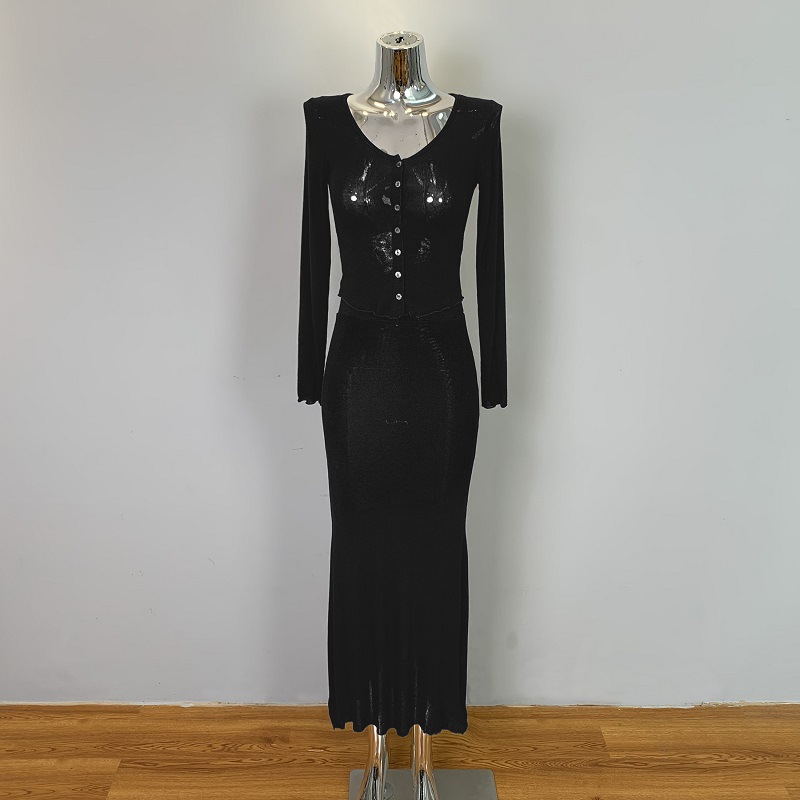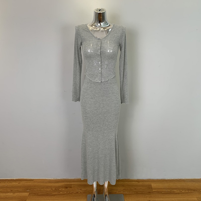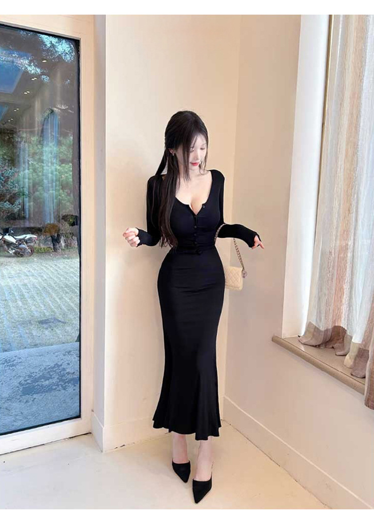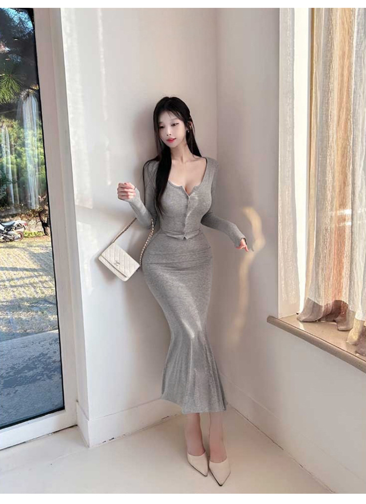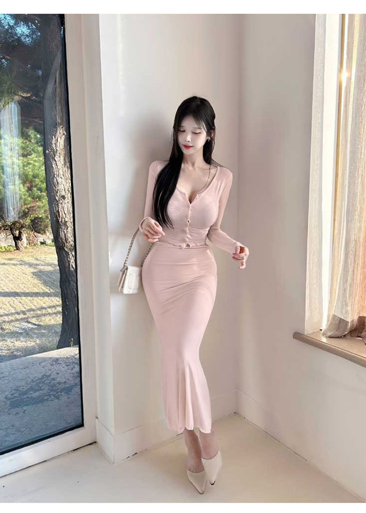 한국 동대문 몸매를 보여주는 섹시한 가슴을 드러내는 타이트한 반팔 가디건 + 여성용 피쉬테일 스커트 슈트스토어 가기