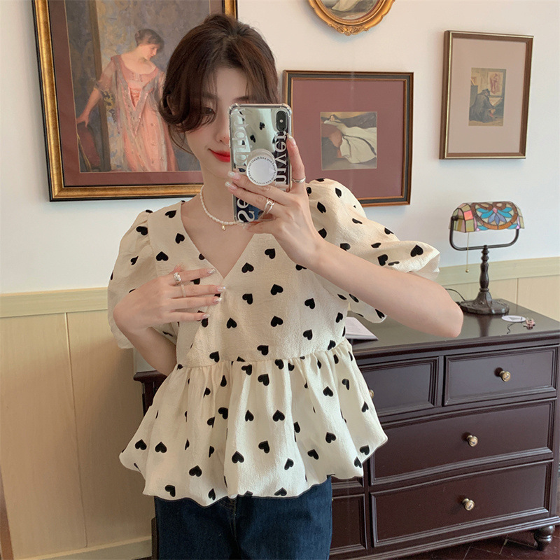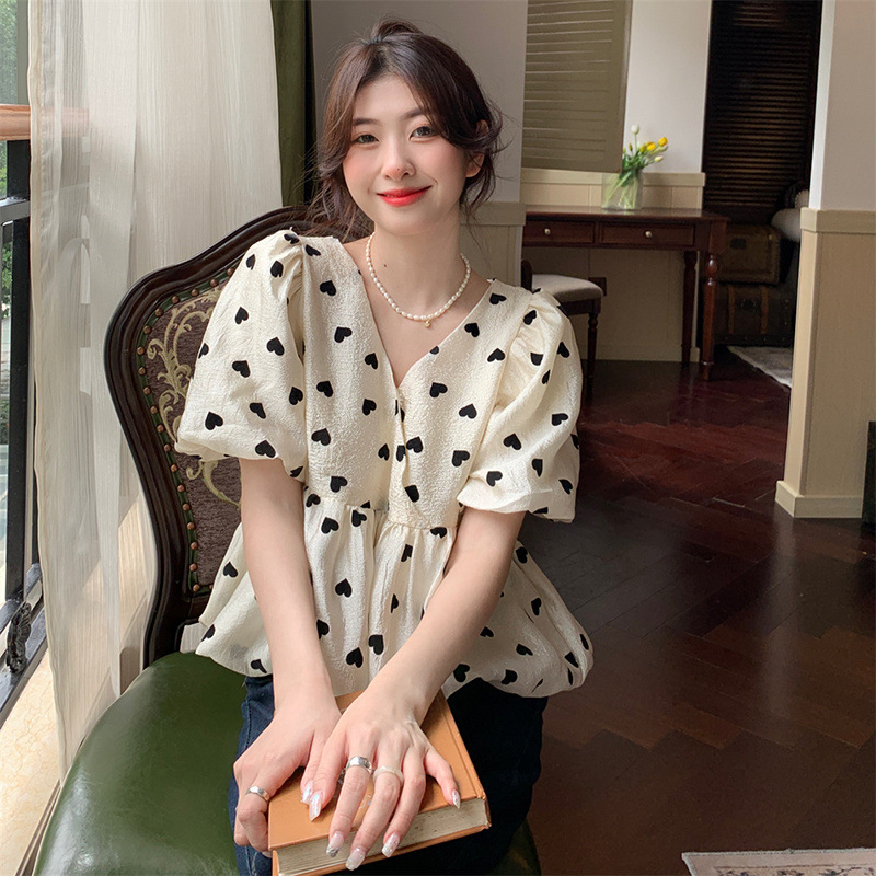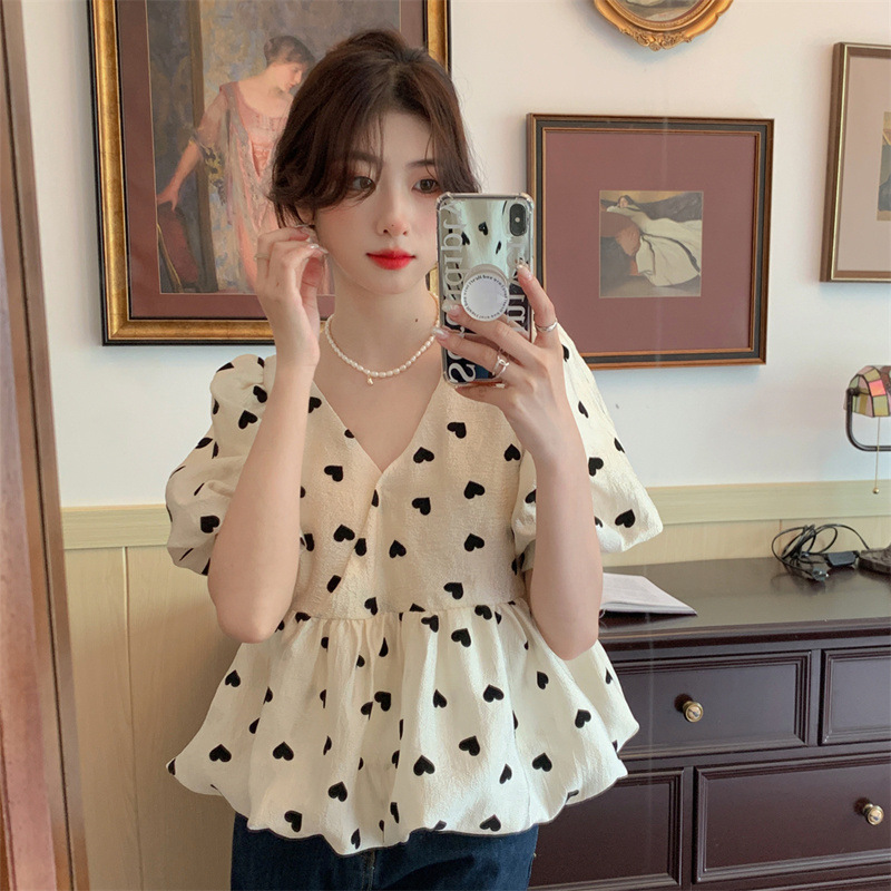디자인 센스 V 넥 꽃 세련된 셔츠 여성의 여름 2025 새로운 부드러운 스타일 슬리밍 우아한 반팔 셔츠스토어 가기