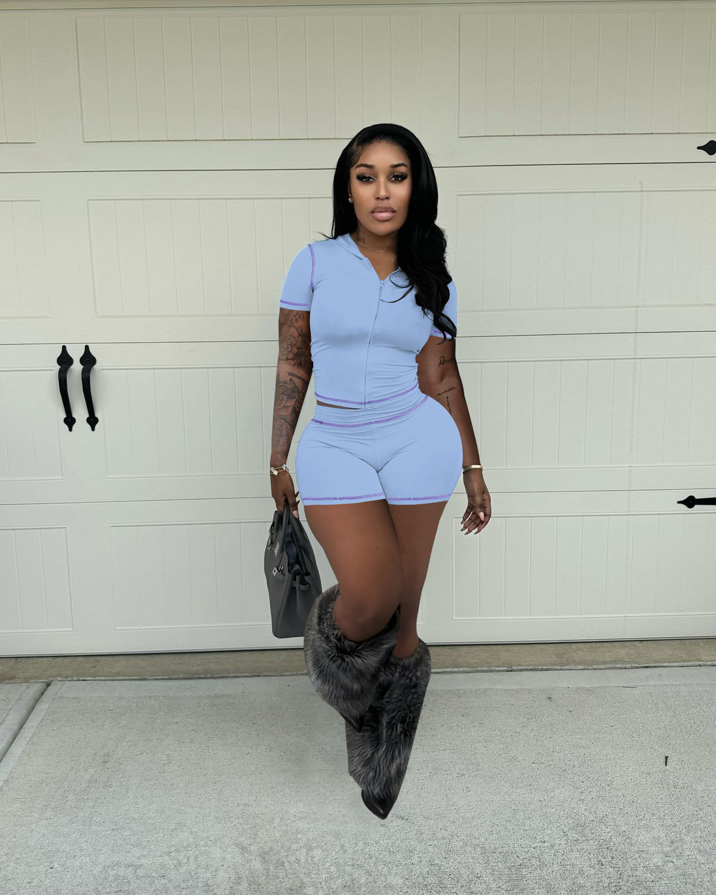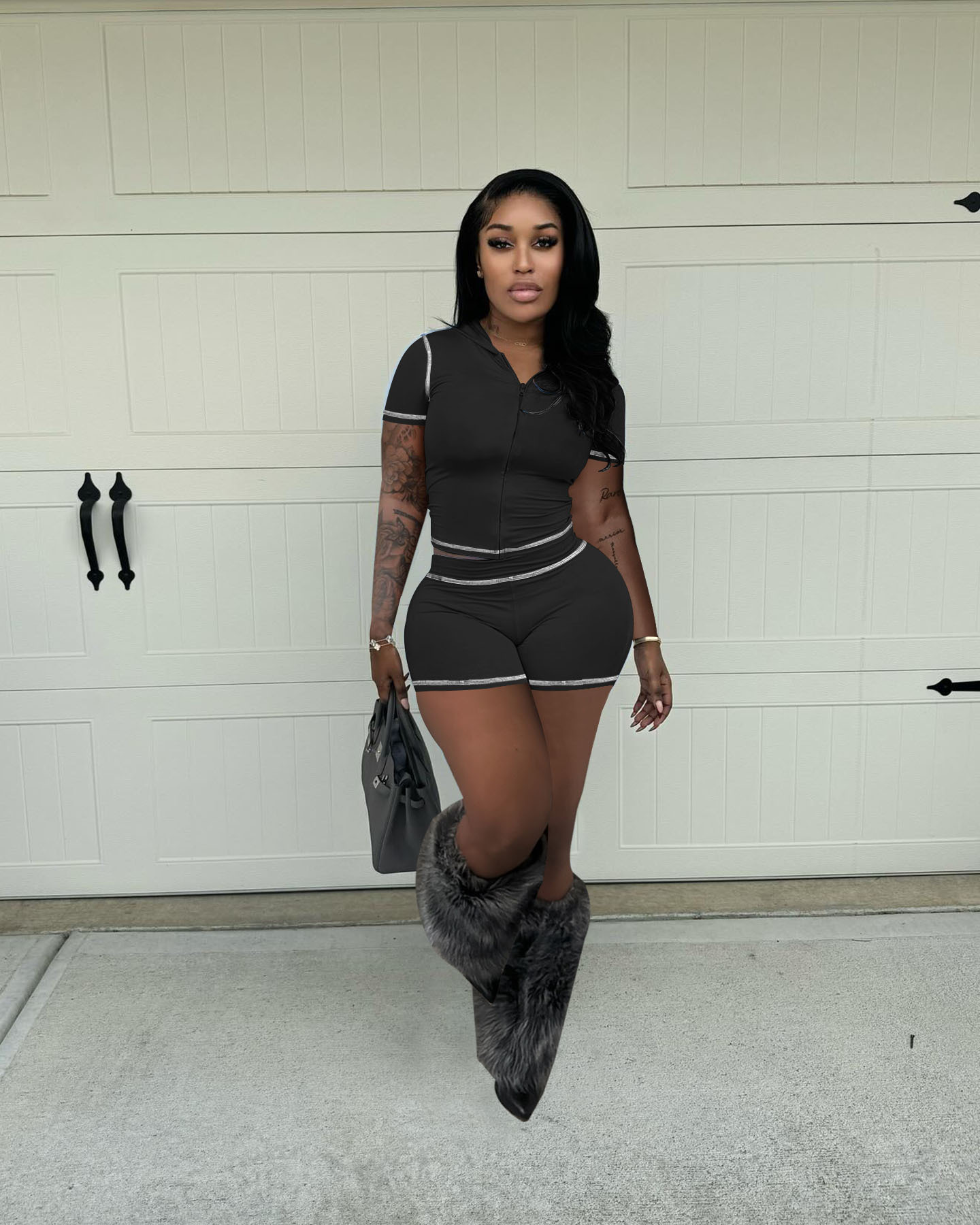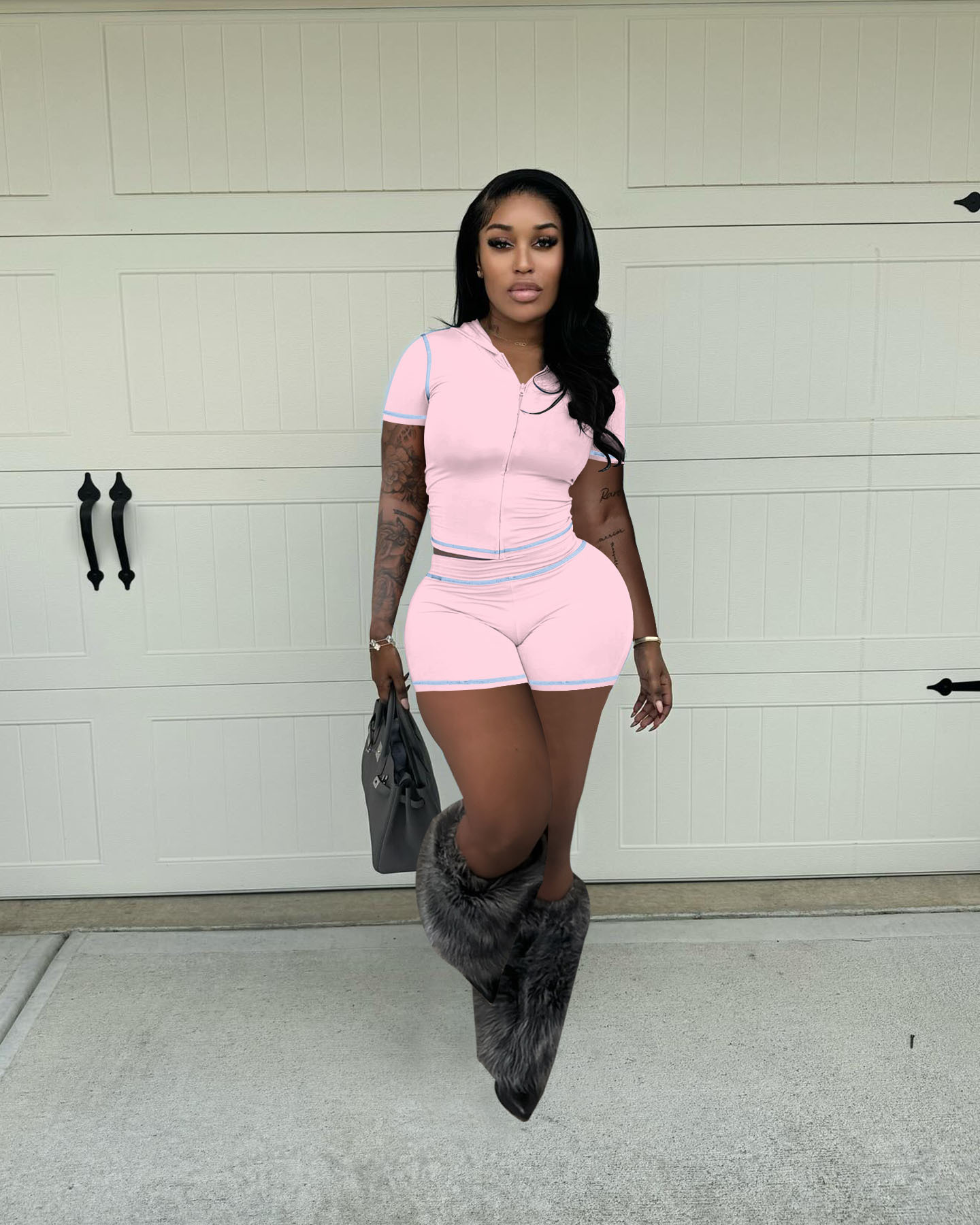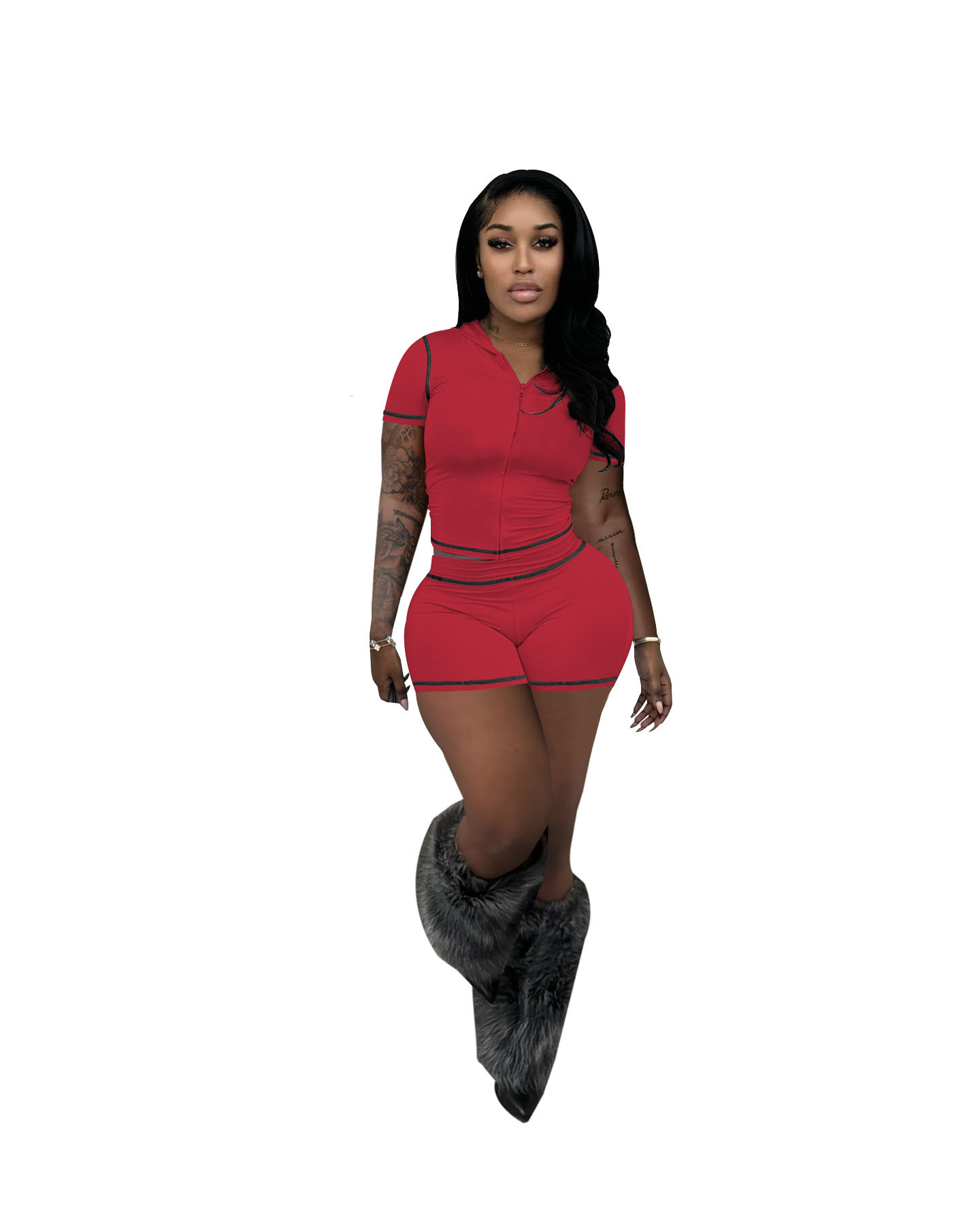 D10130 유럽과 미국 국경 25 여름 지퍼 후드 카디건 높은 탄성 스포츠 캐주얼 짧은 소매 반바지 핫 걸 투피스 세트