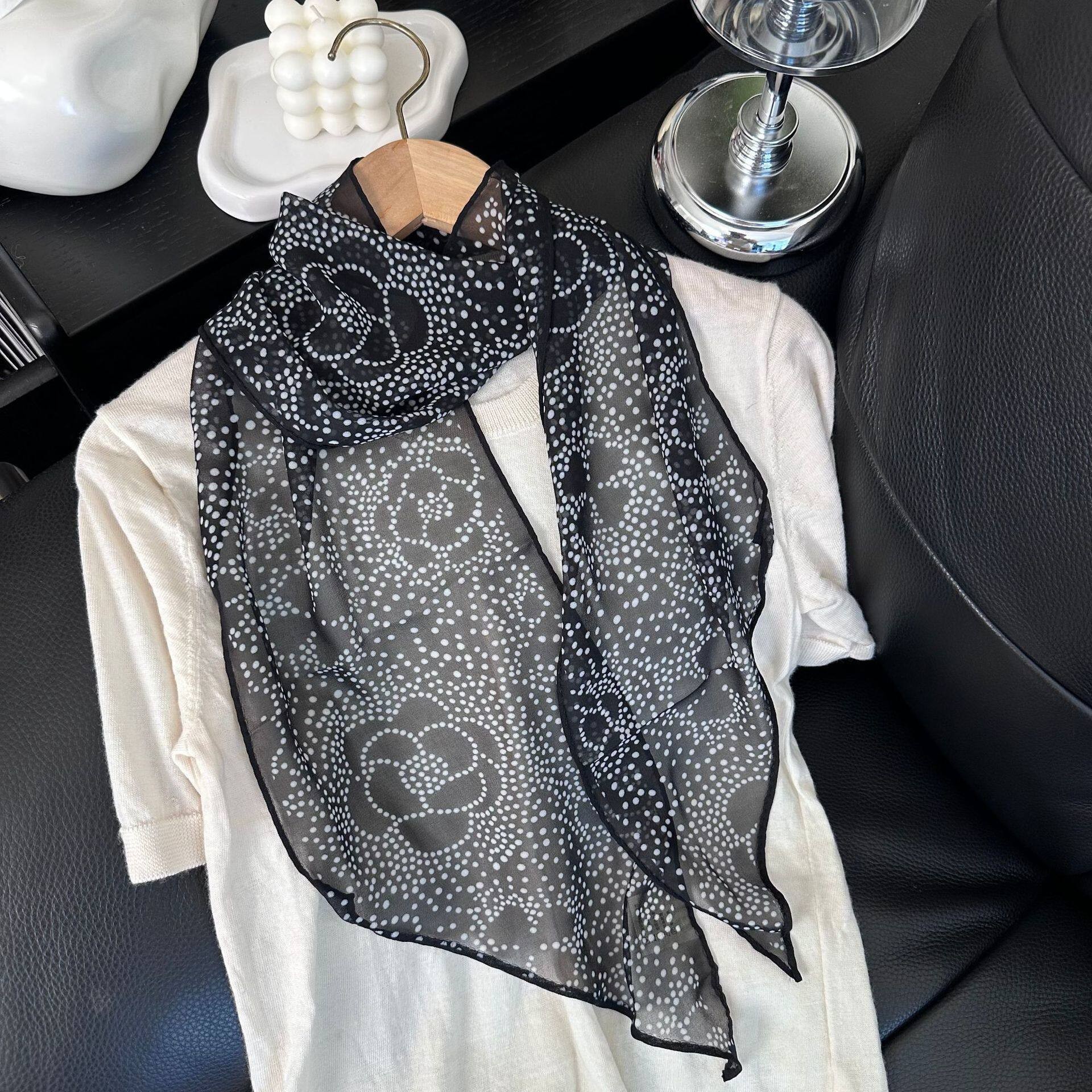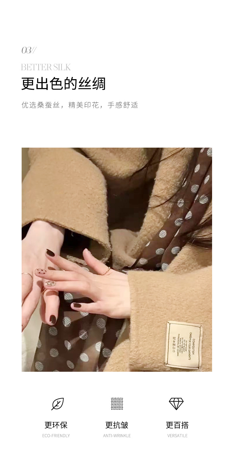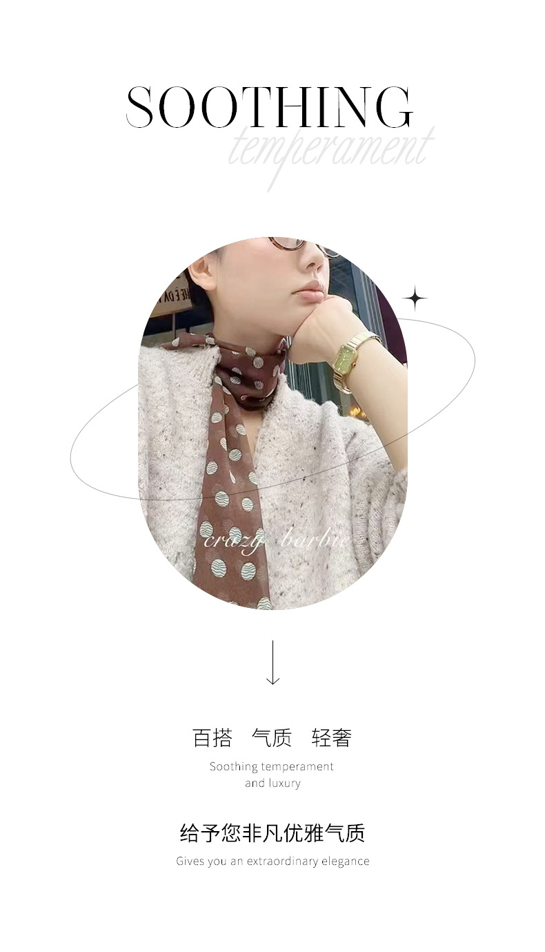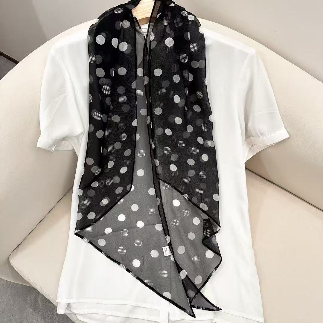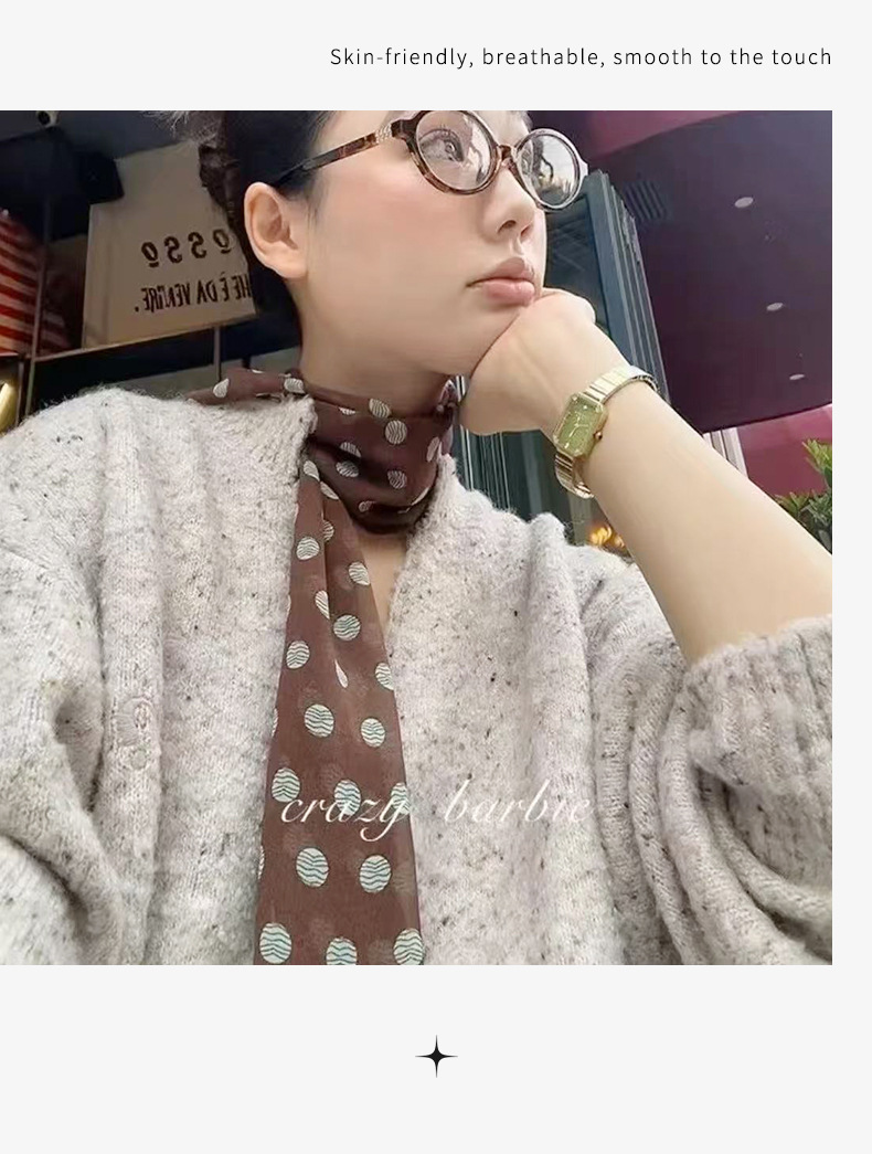 여성을위한 새로운 갈색 폴카 도트 실크 쉬폰 스카프 봄과 여름 하이 엔드 100% 뽕나무 실크 헤어 밴드 머리 긴 스카프스토어 가기