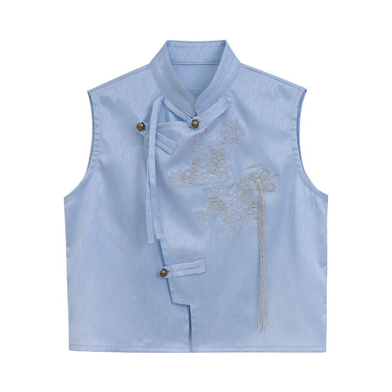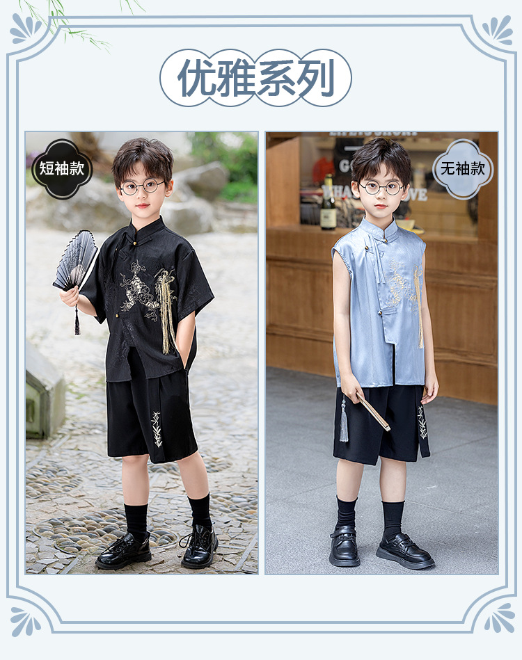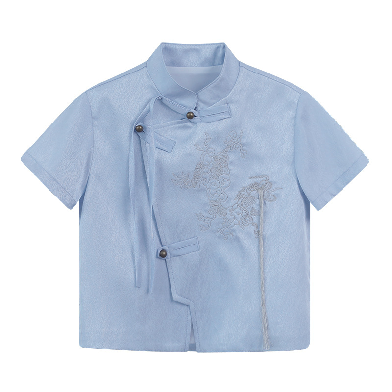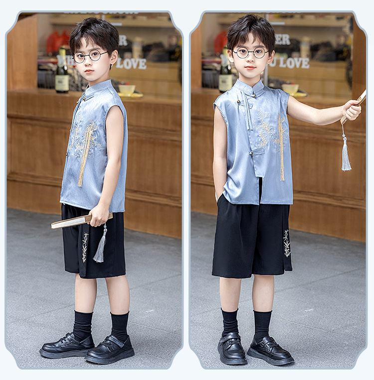 소년의 새로운 중국 스타일 Hanfu 당나라 정장 여름 얇은 어린이 중국 스타일 스탠드 칼라 자수 셔츠 정장 호스트 공연 의류스토어 가기