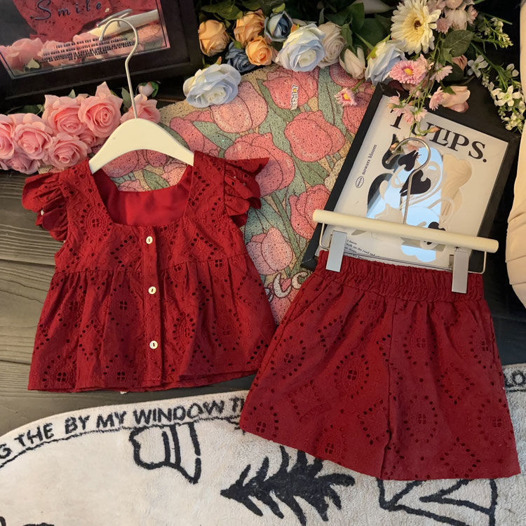 [부모-자식] 여아 정장 2024 여름 신작 프렌치 할로우 플라잉 슬리브 민소매 탑 + 반바지 2개