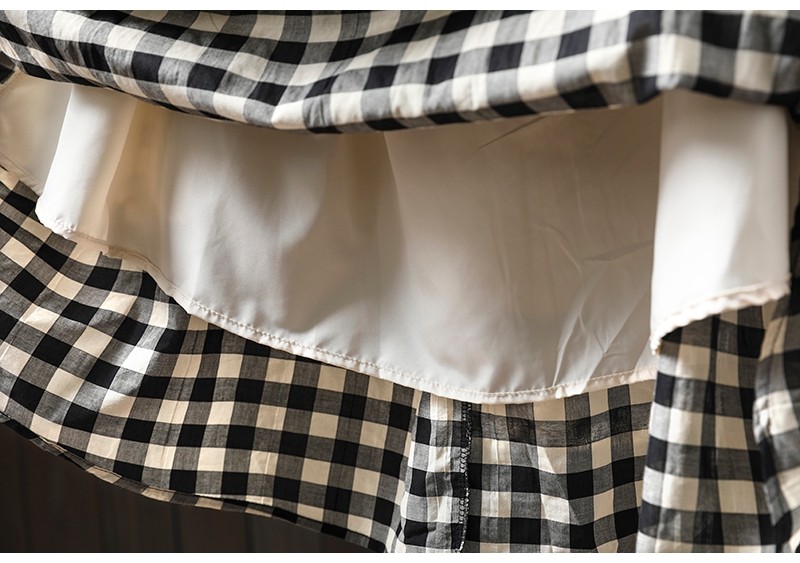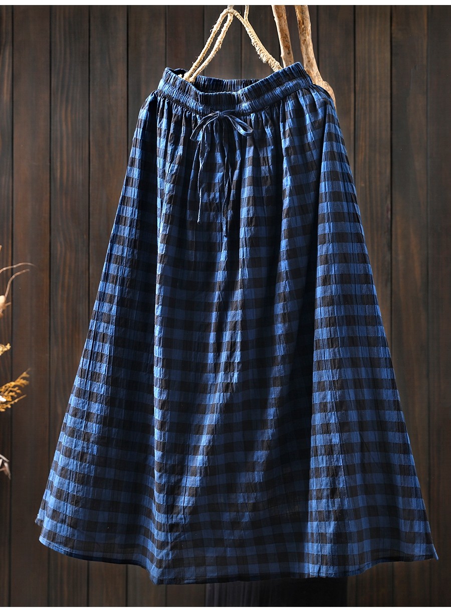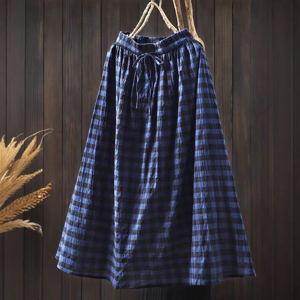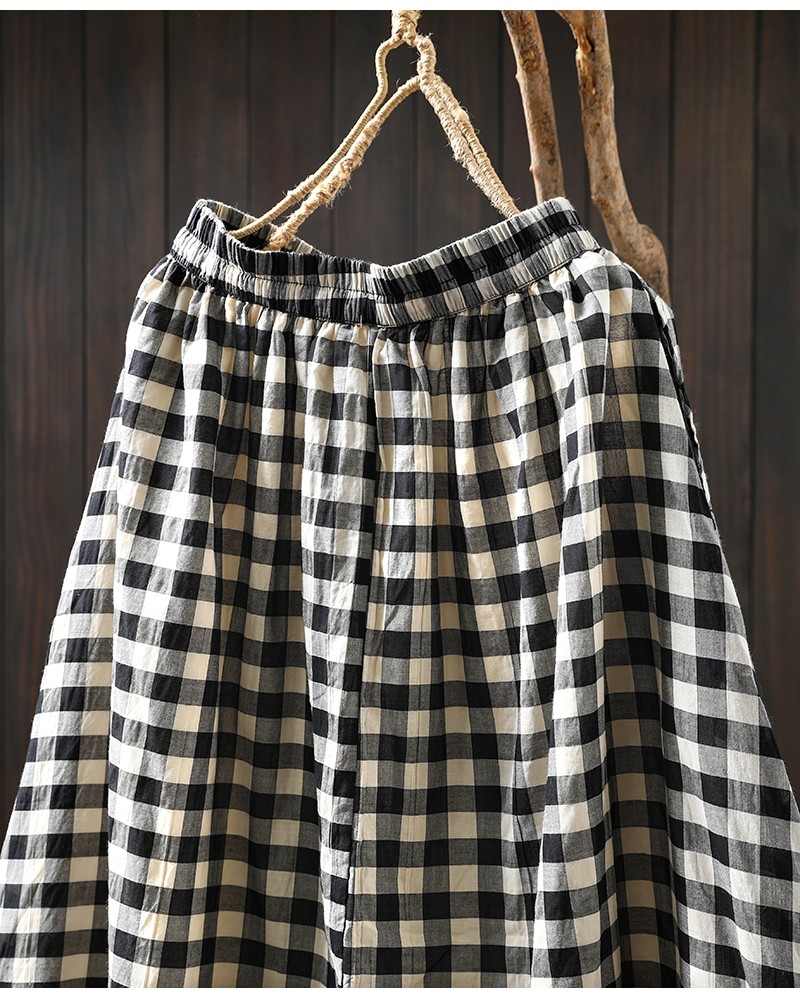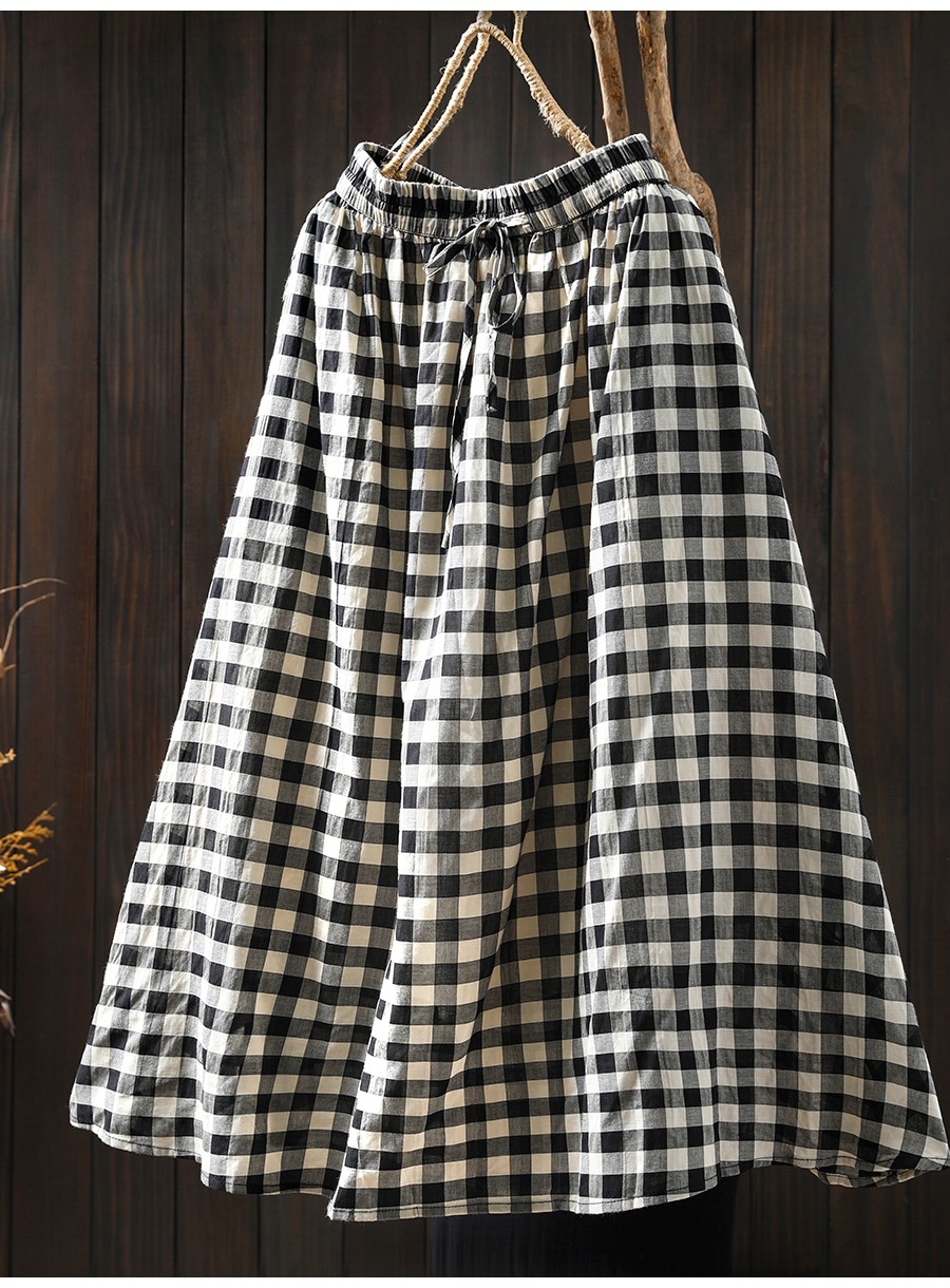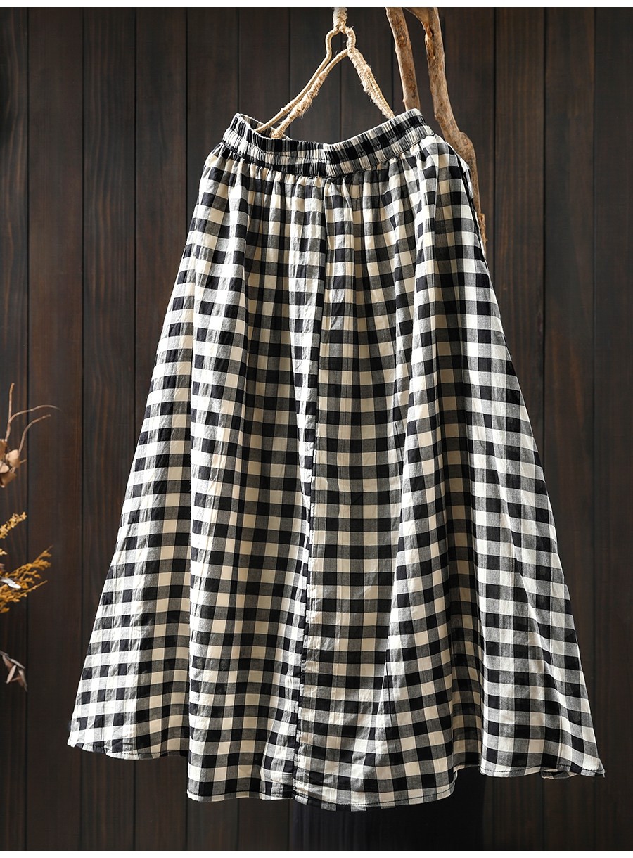 2025 봄 새로운 면 격자 무늬 스커트 여성 느슨한 핏 캐주얼 예술적 중간 길이의 대형 스윙 A 라인 스커트