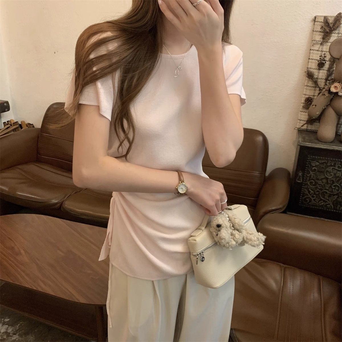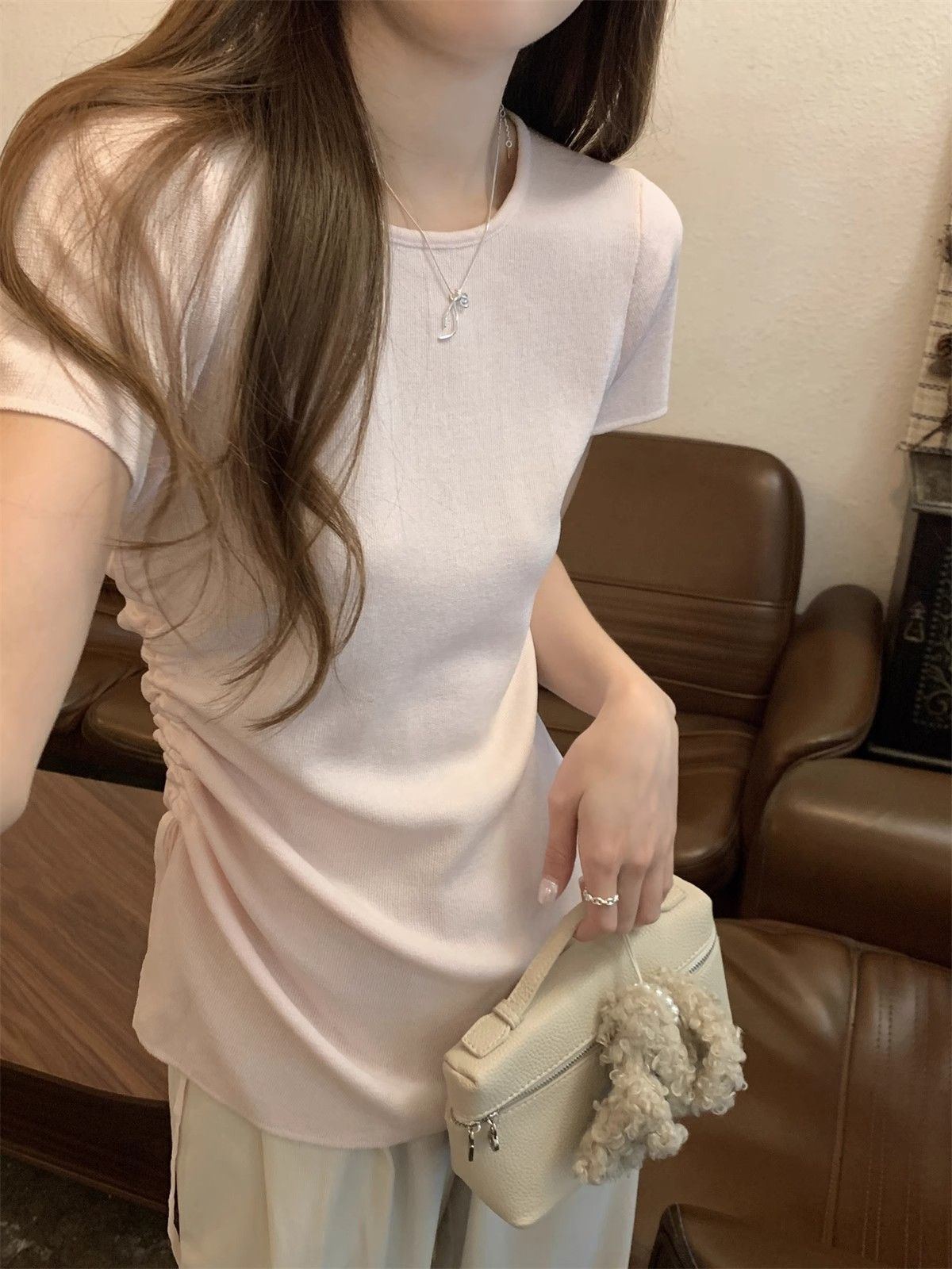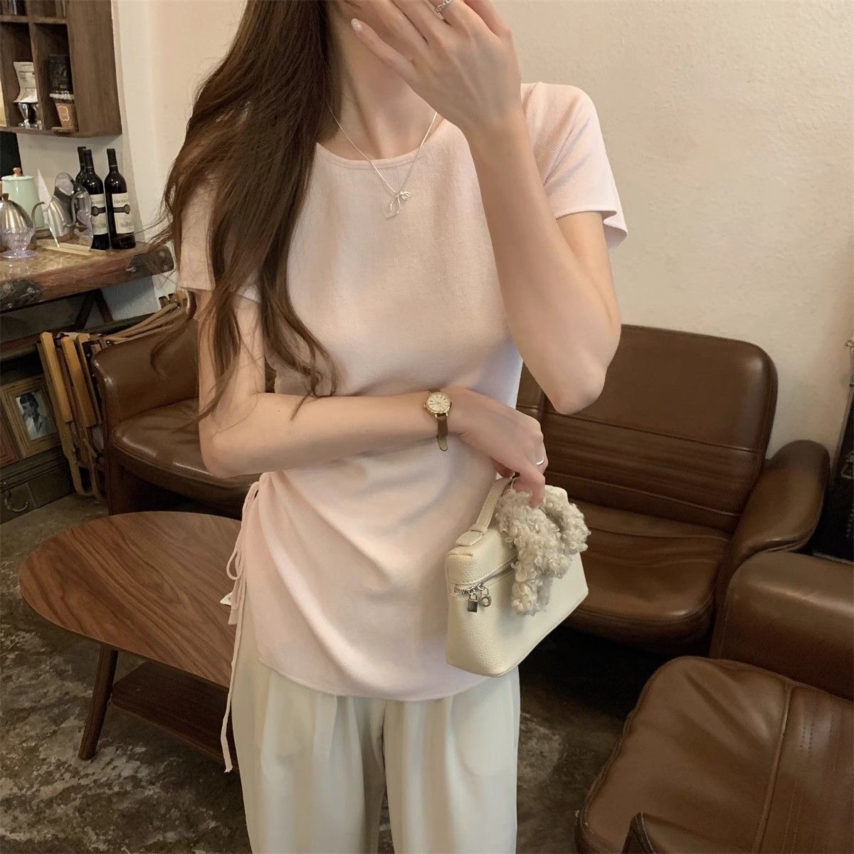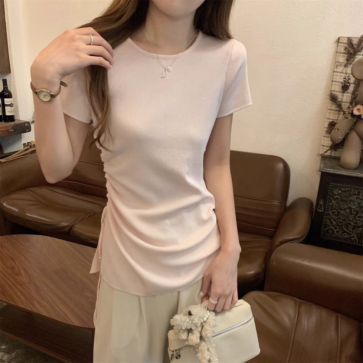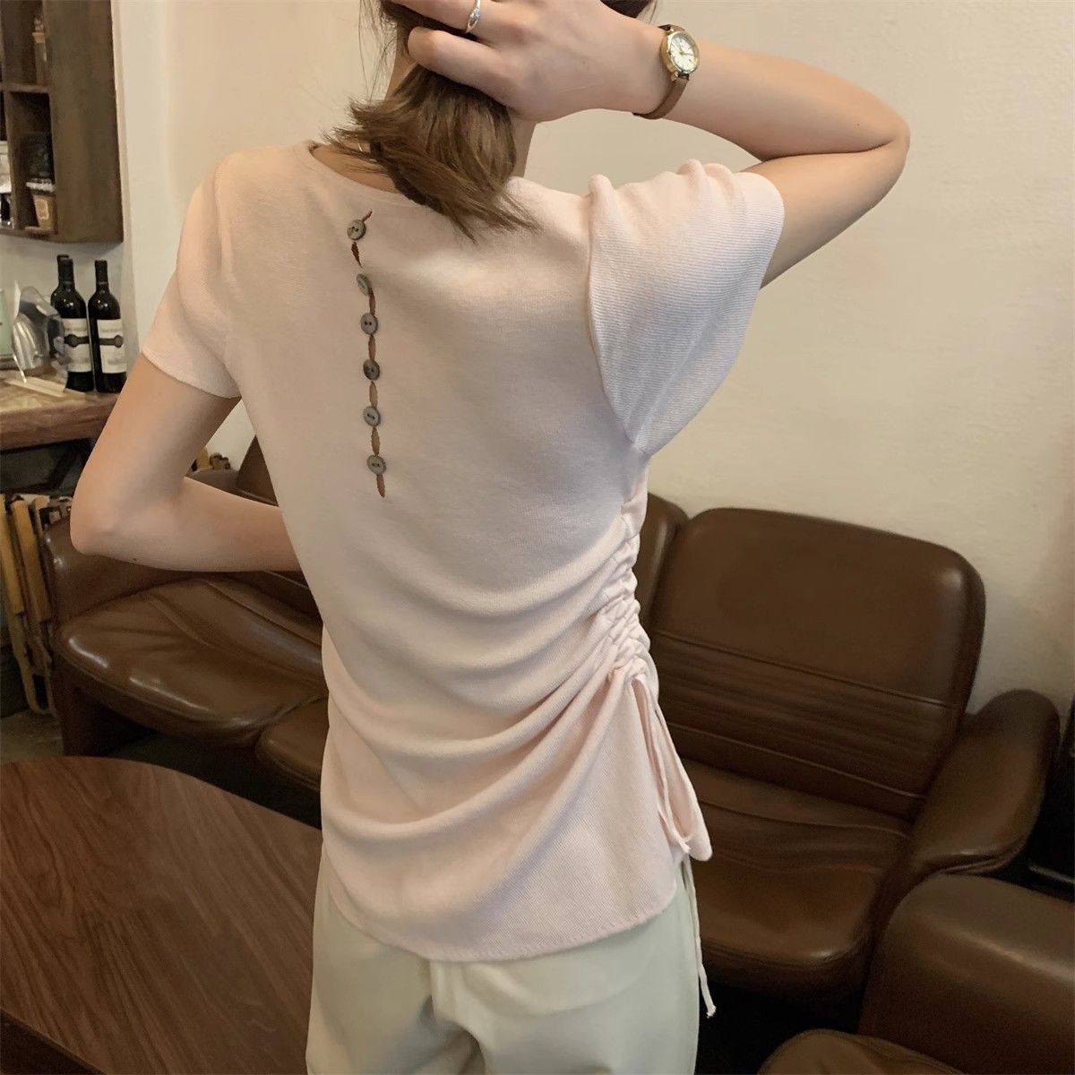 순수하고 아름다운 여름 슬림핏 아이스 실크 니트 반팔 티셔츠 여성용 불규칙한 드로우 스트링 버튼 하이 엔드 Ins 탑