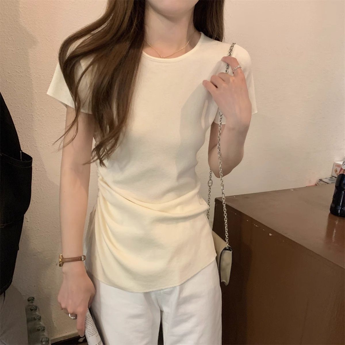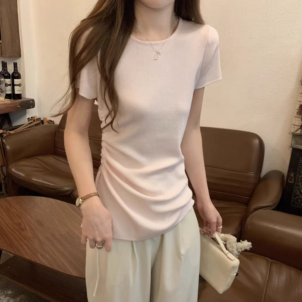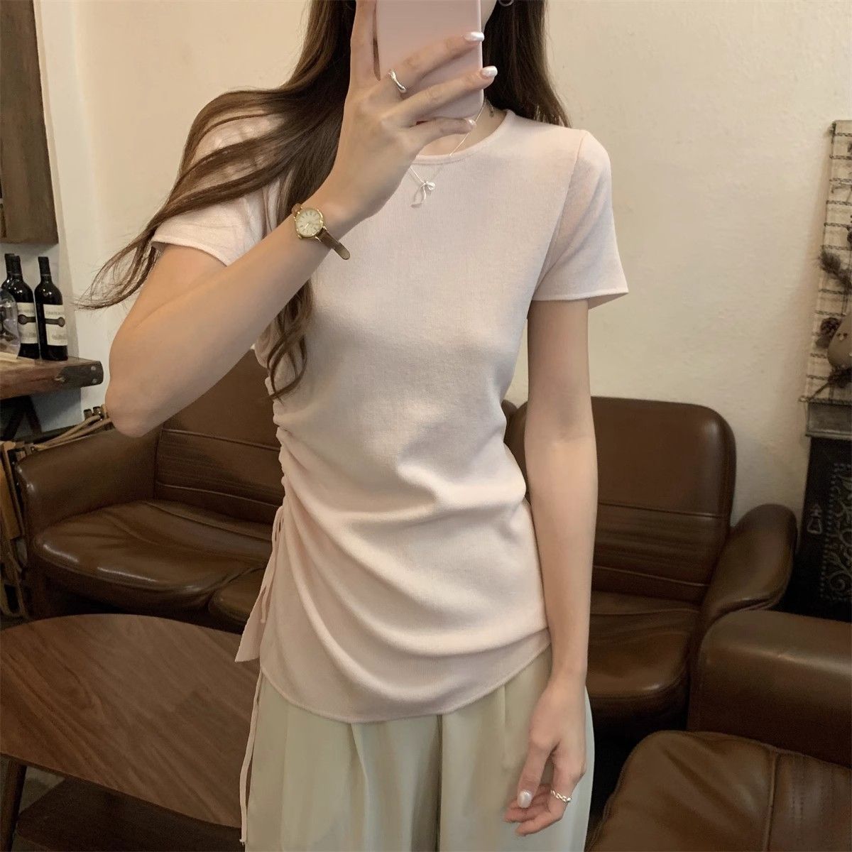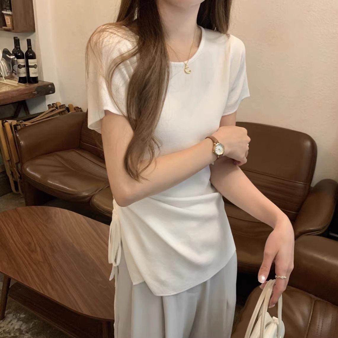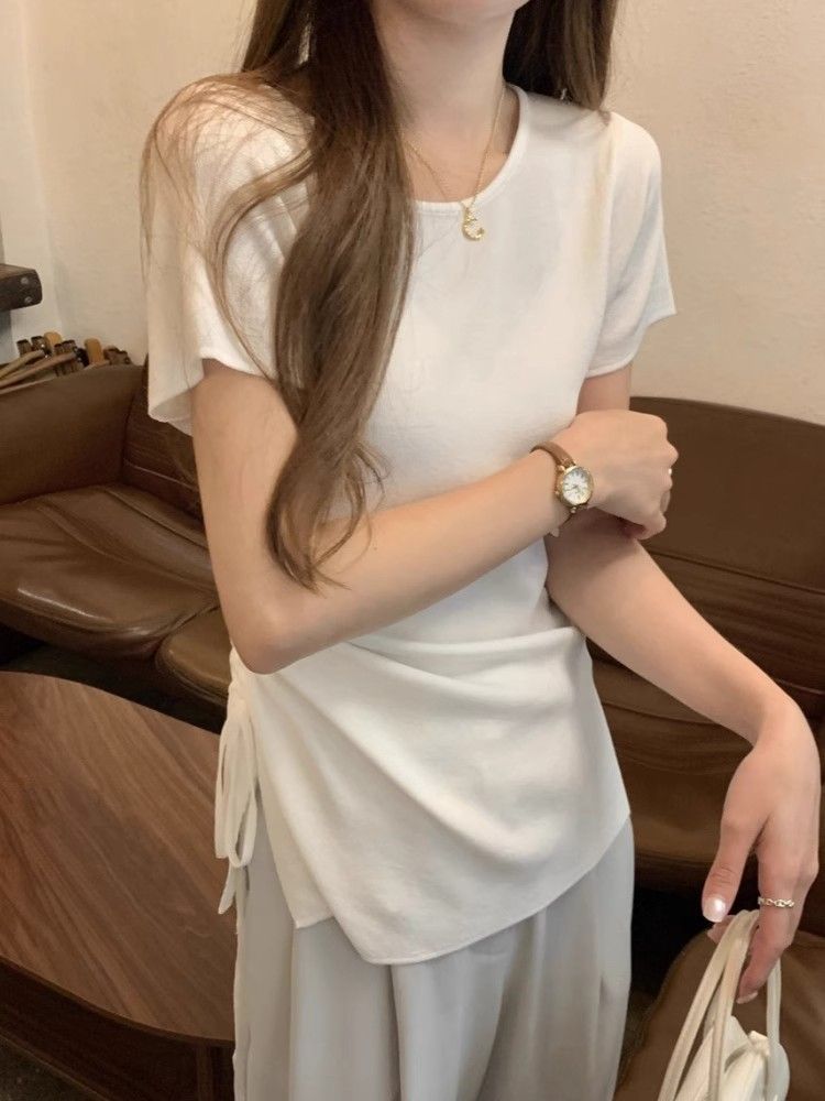 순수하고 아름다운 여름 슬림핏 아이스 실크 니트 반팔 티셔츠 여성용 불규칙한 드로우 스트링 버튼 하이 엔드 Ins 탑스토어 가기