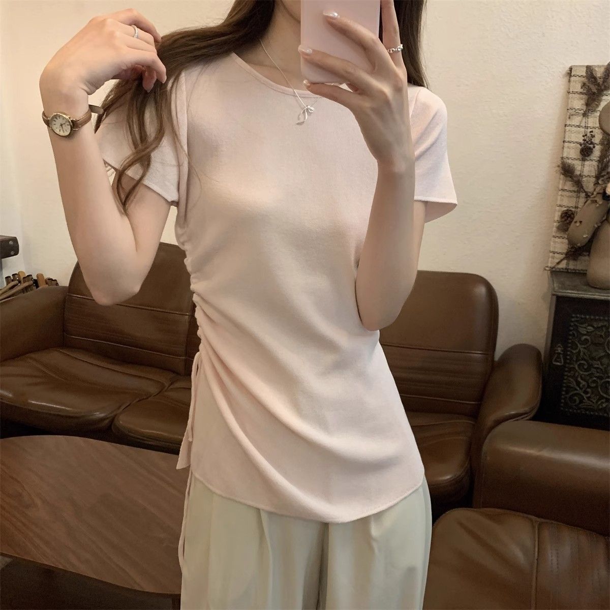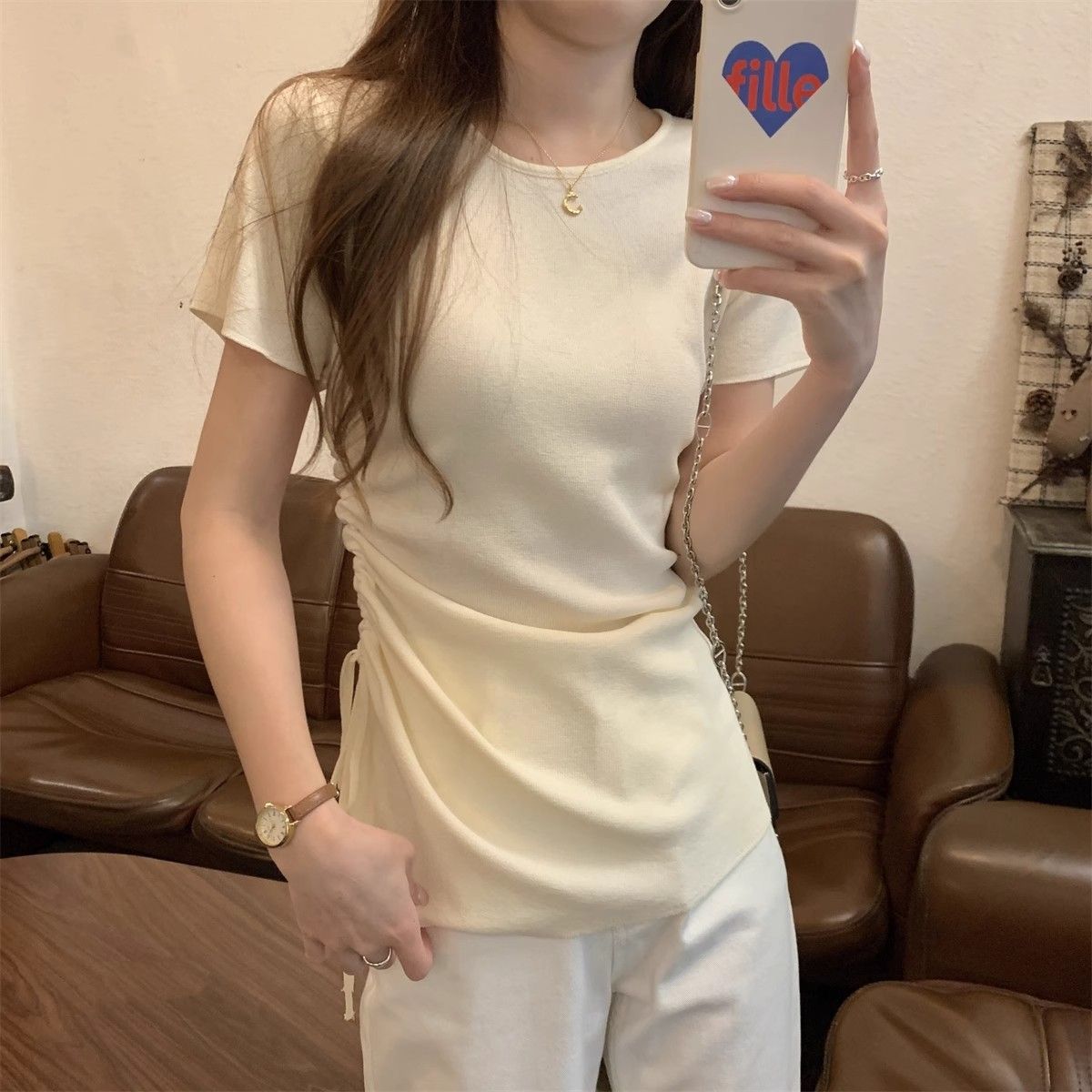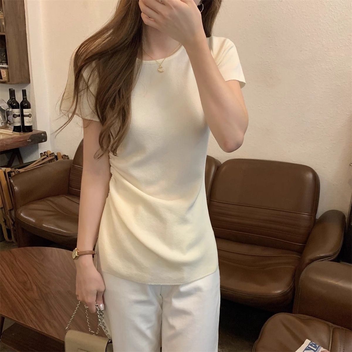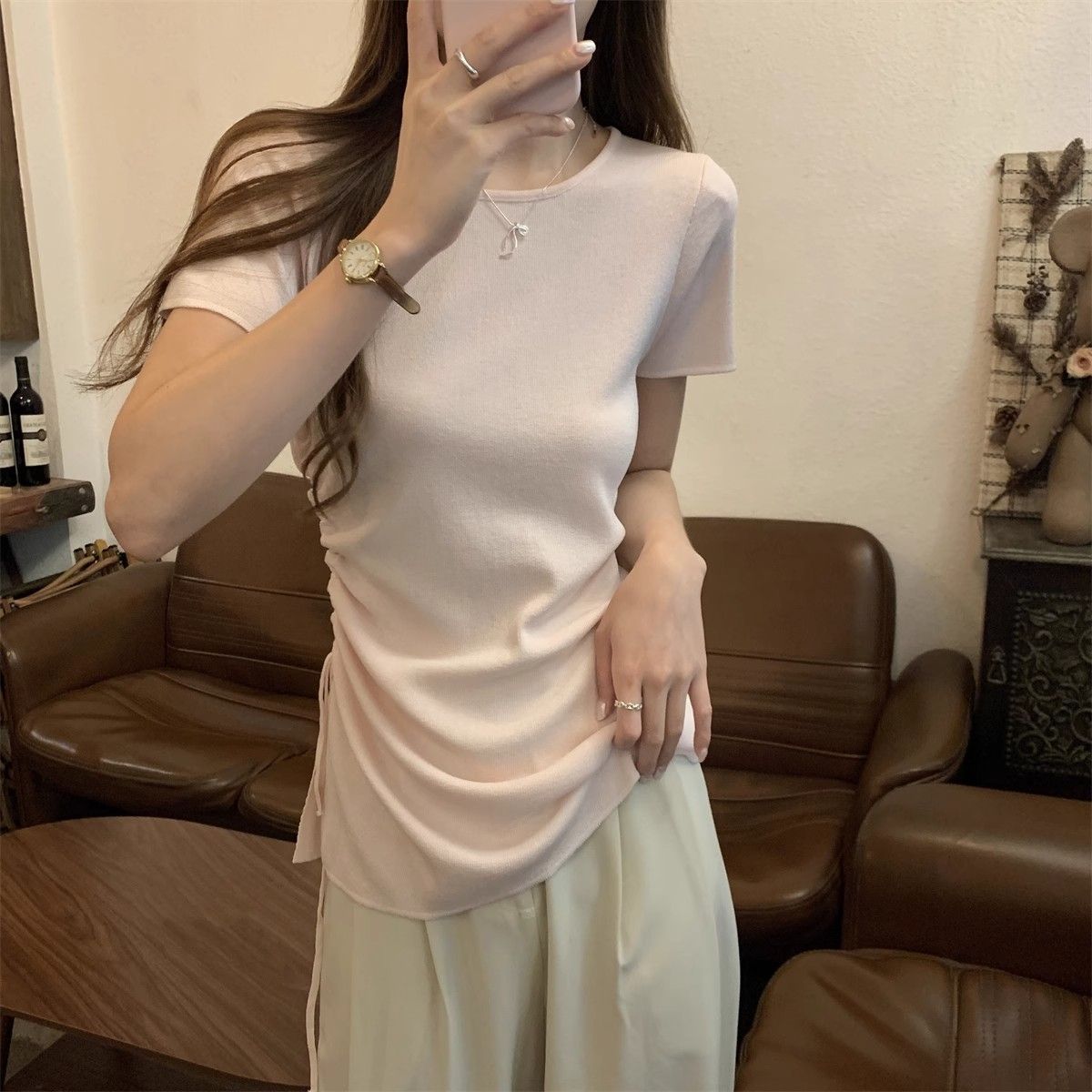 순수하고 아름다운 여름 슬림핏 아이스 실크 니트 반팔 티셔츠 여성용 불규칙한 드로우 스트링 버튼 하이 엔드 Ins 탑스토어 가기