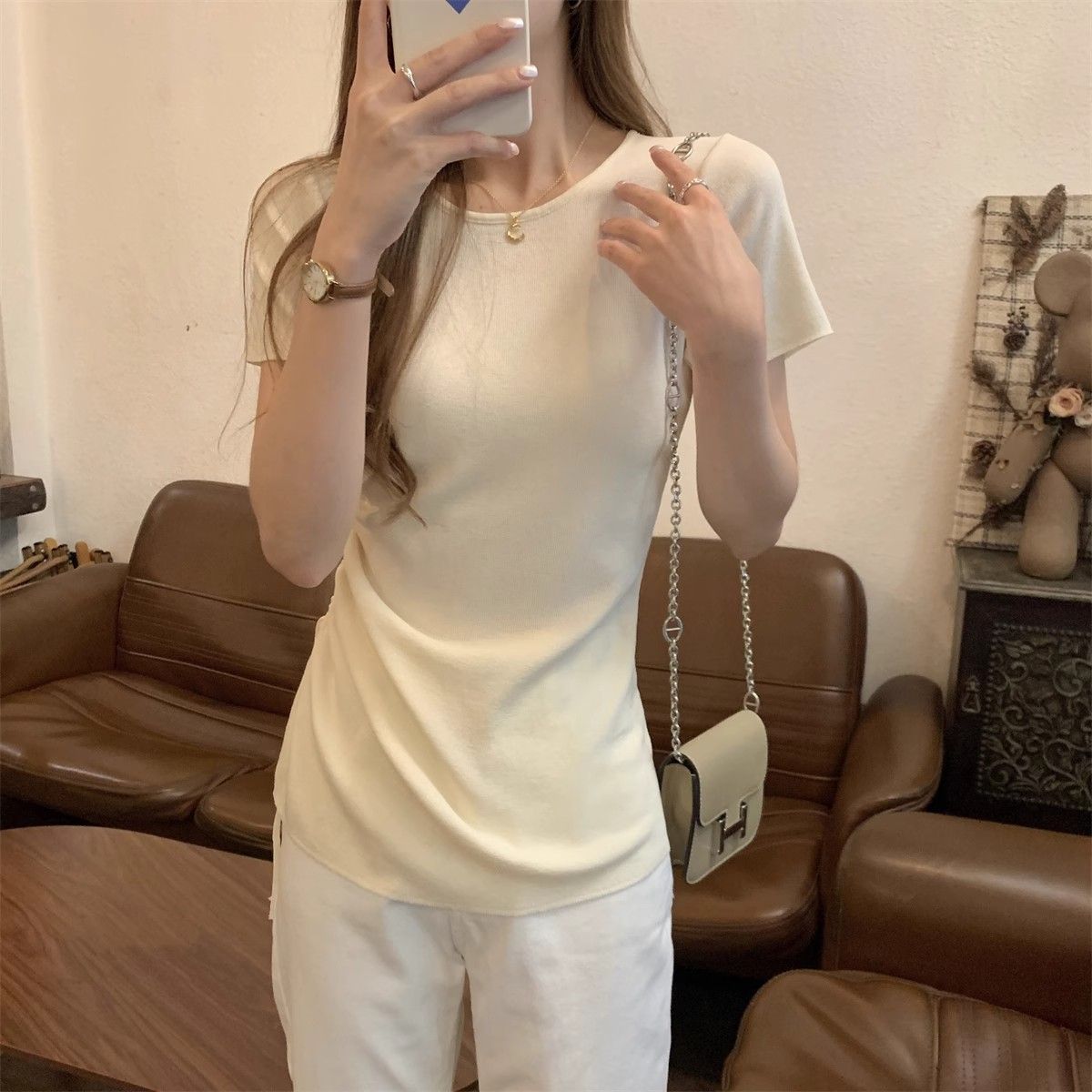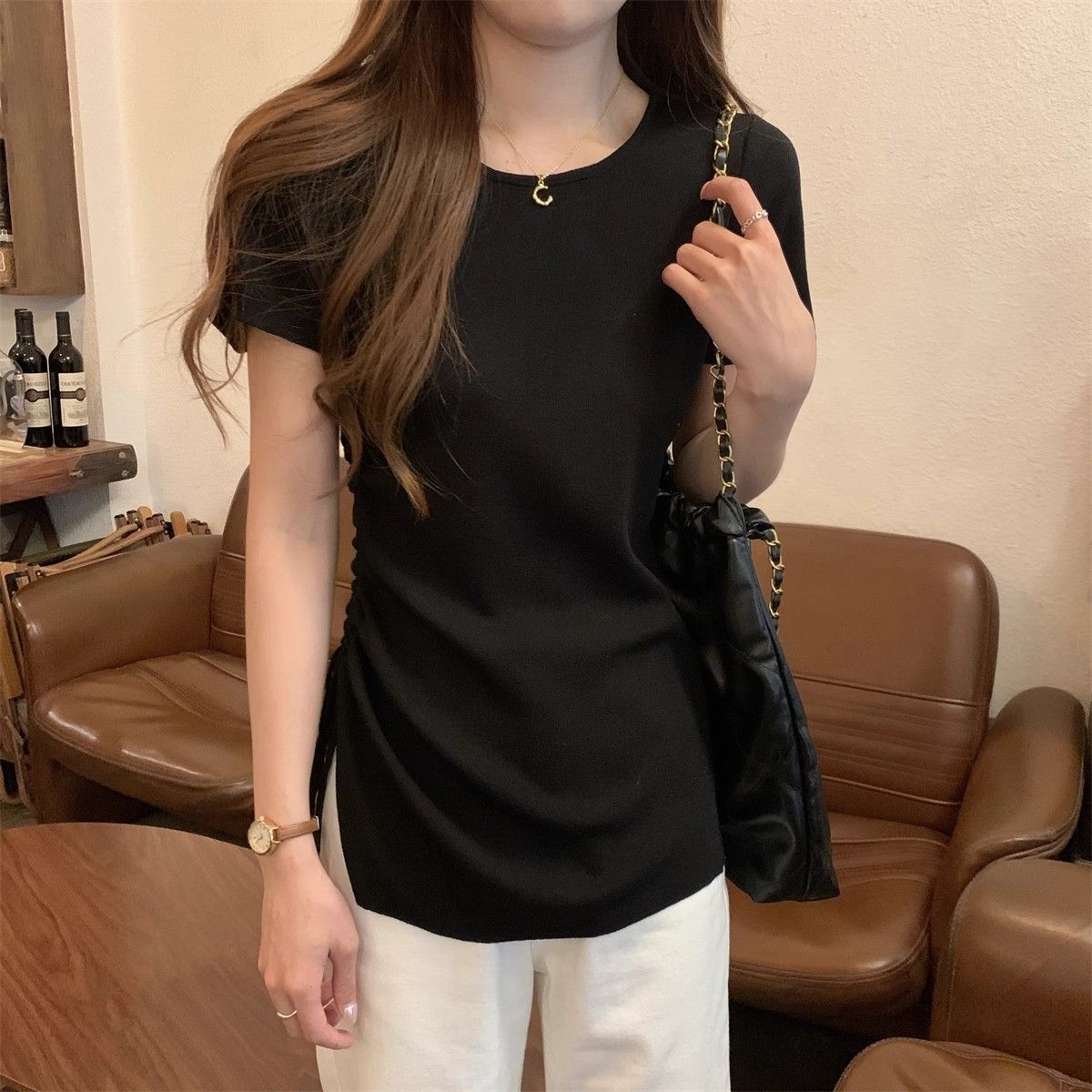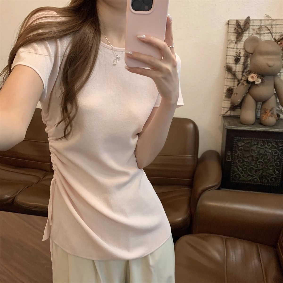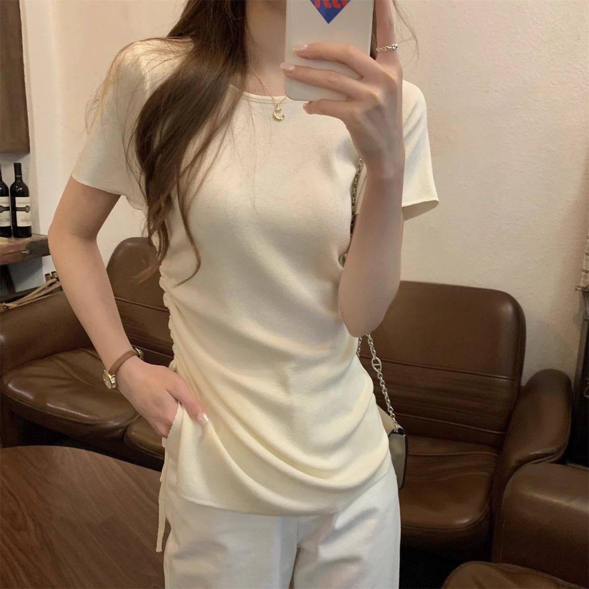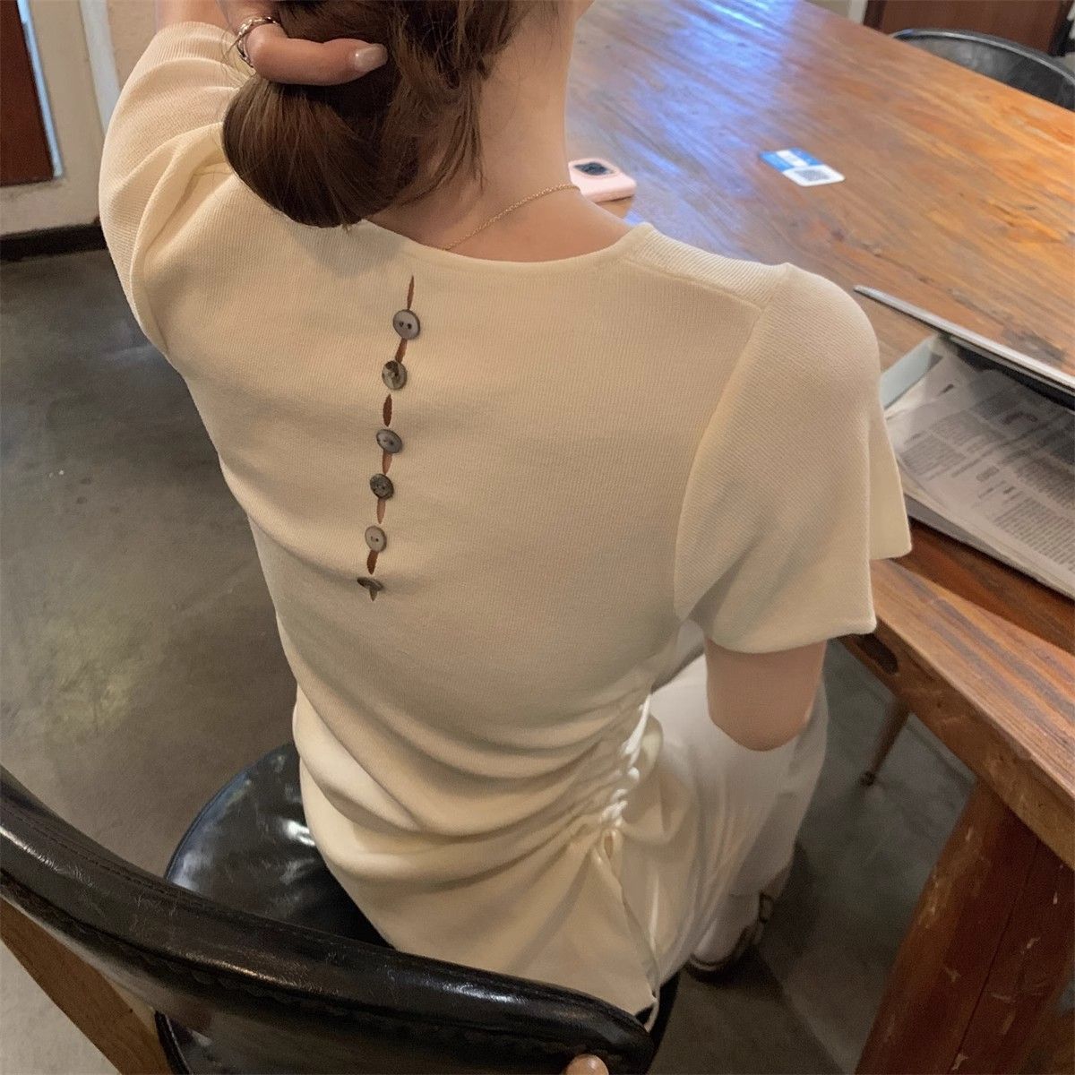 순수하고 아름다운 여름 슬림핏 아이스 실크 니트 반팔 티셔츠 여성용 불규칙한 드로우 스트링 버튼 하이 엔드 Ins 탑스토어 가기