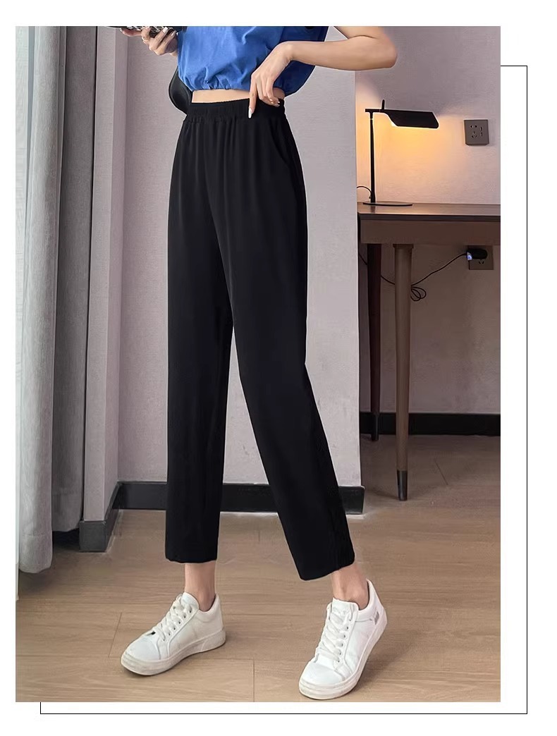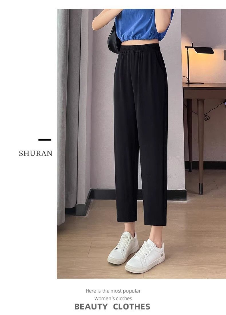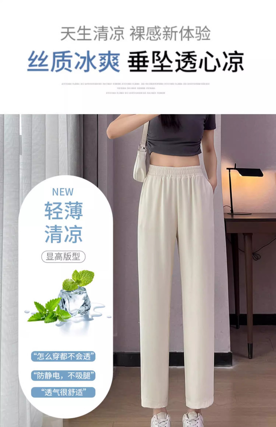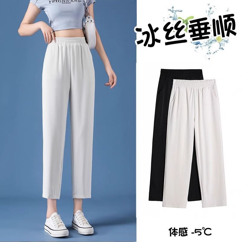 여름 얇은 8 점 쿨 아이스 실크 바지 여성의 작은 느슨한 자른 바지 높은 허리 슬리밍 스트레이트 파이프 바지