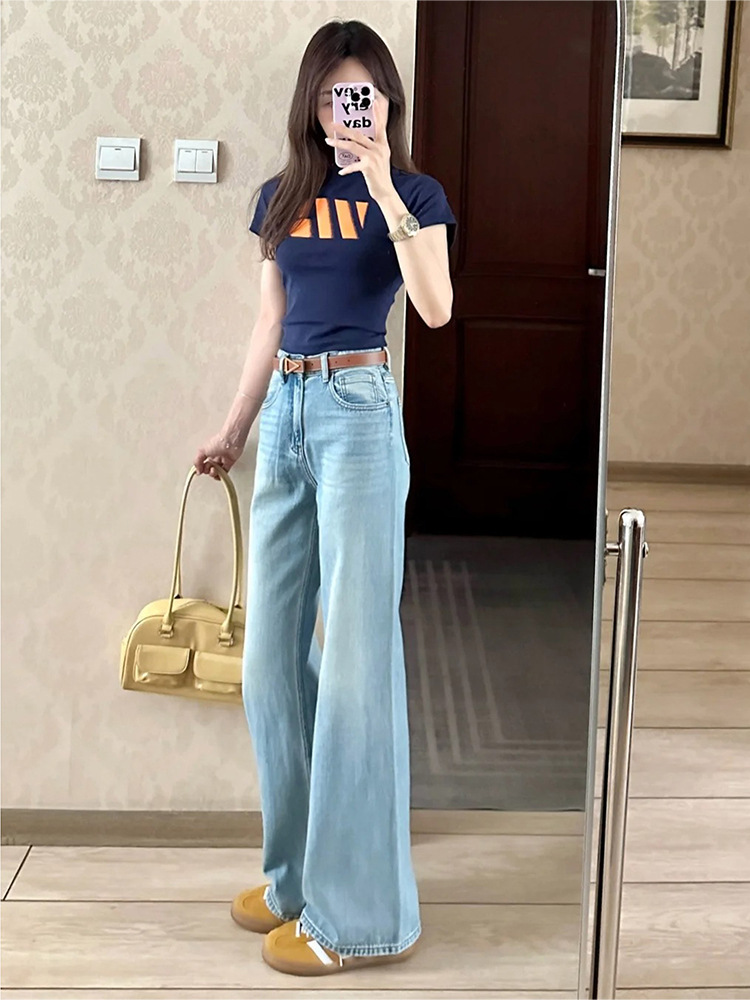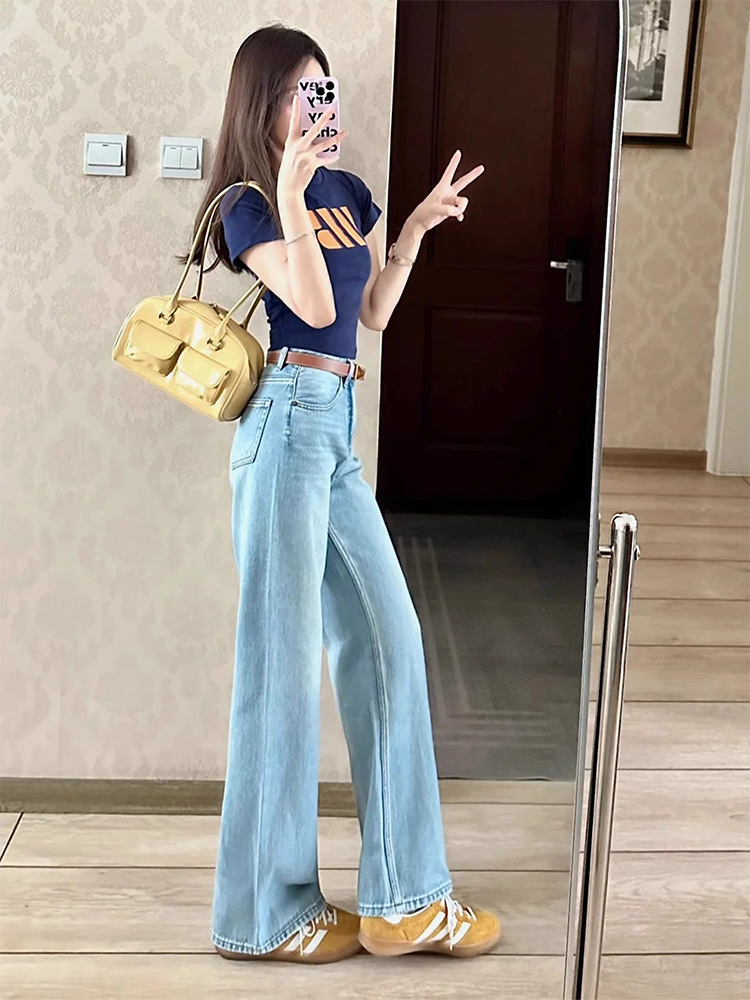 2025 봄 라이트 블루 스트레이트 청바지 여성의 새로운 느슨한 딥 높은 허리 좁은 넓은 다리 바지 작은 남성스토어 가기