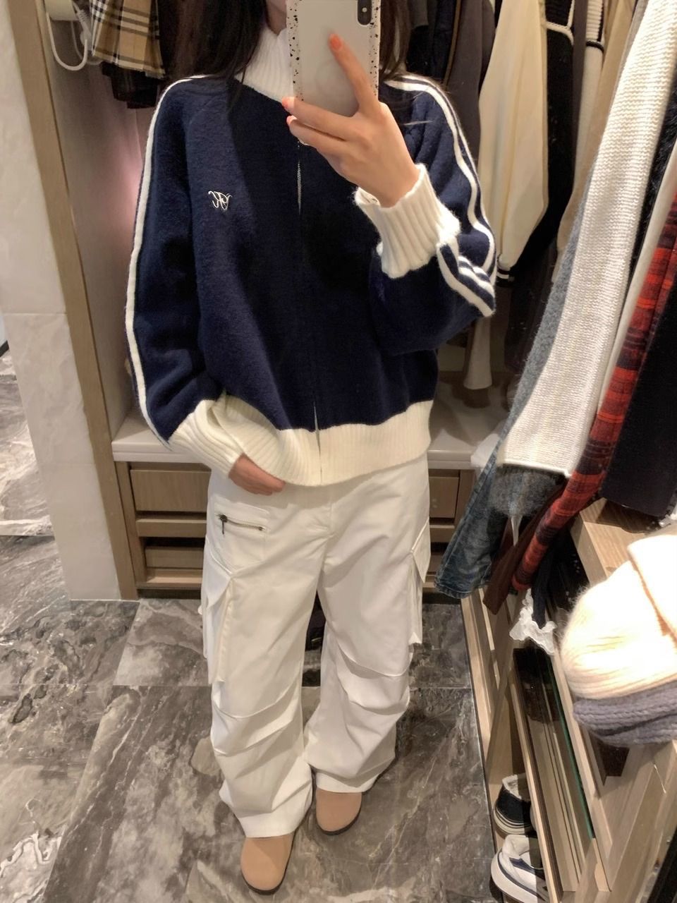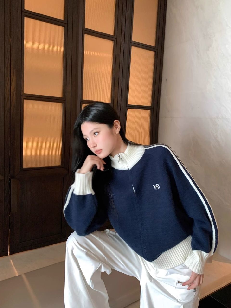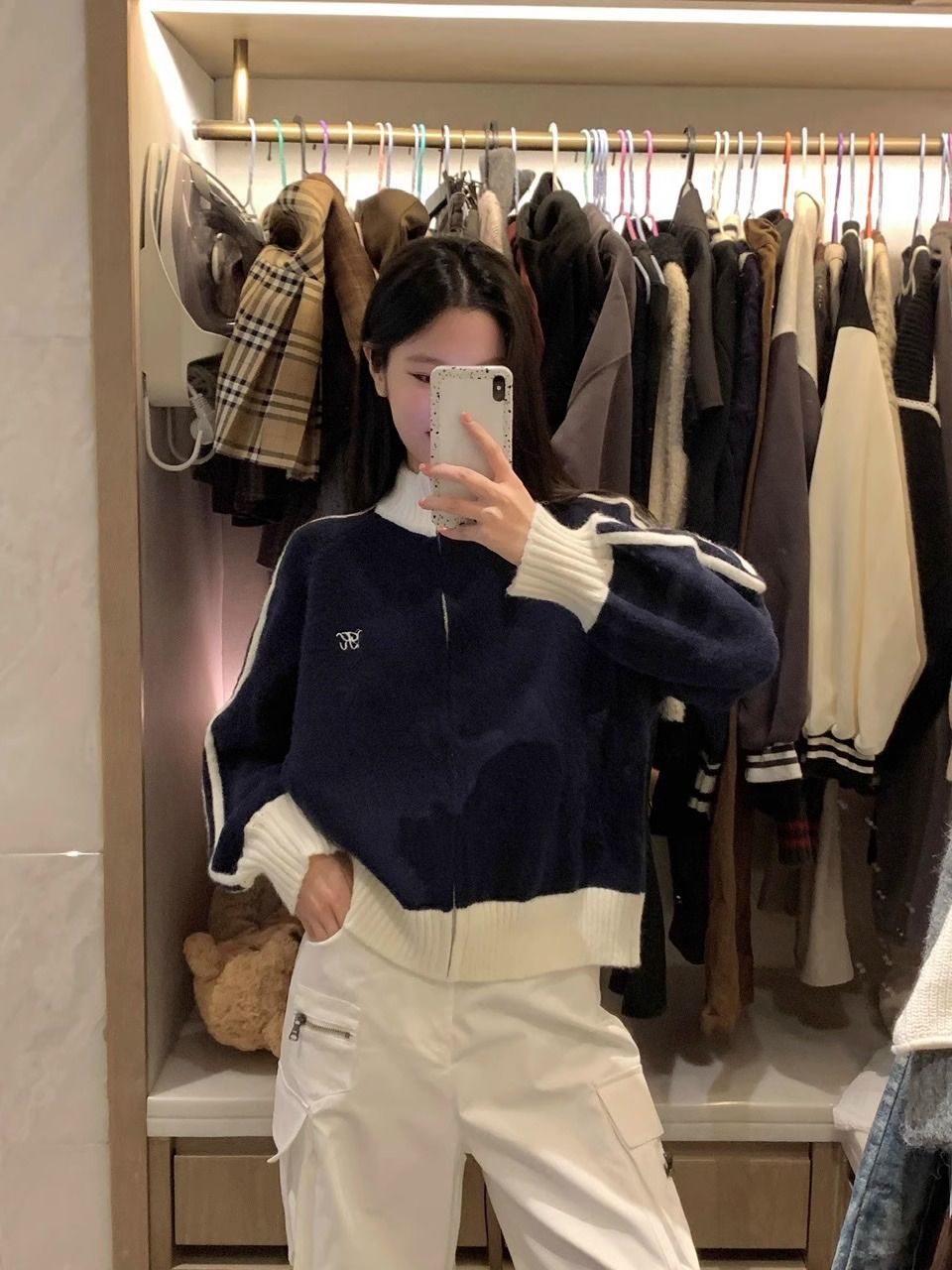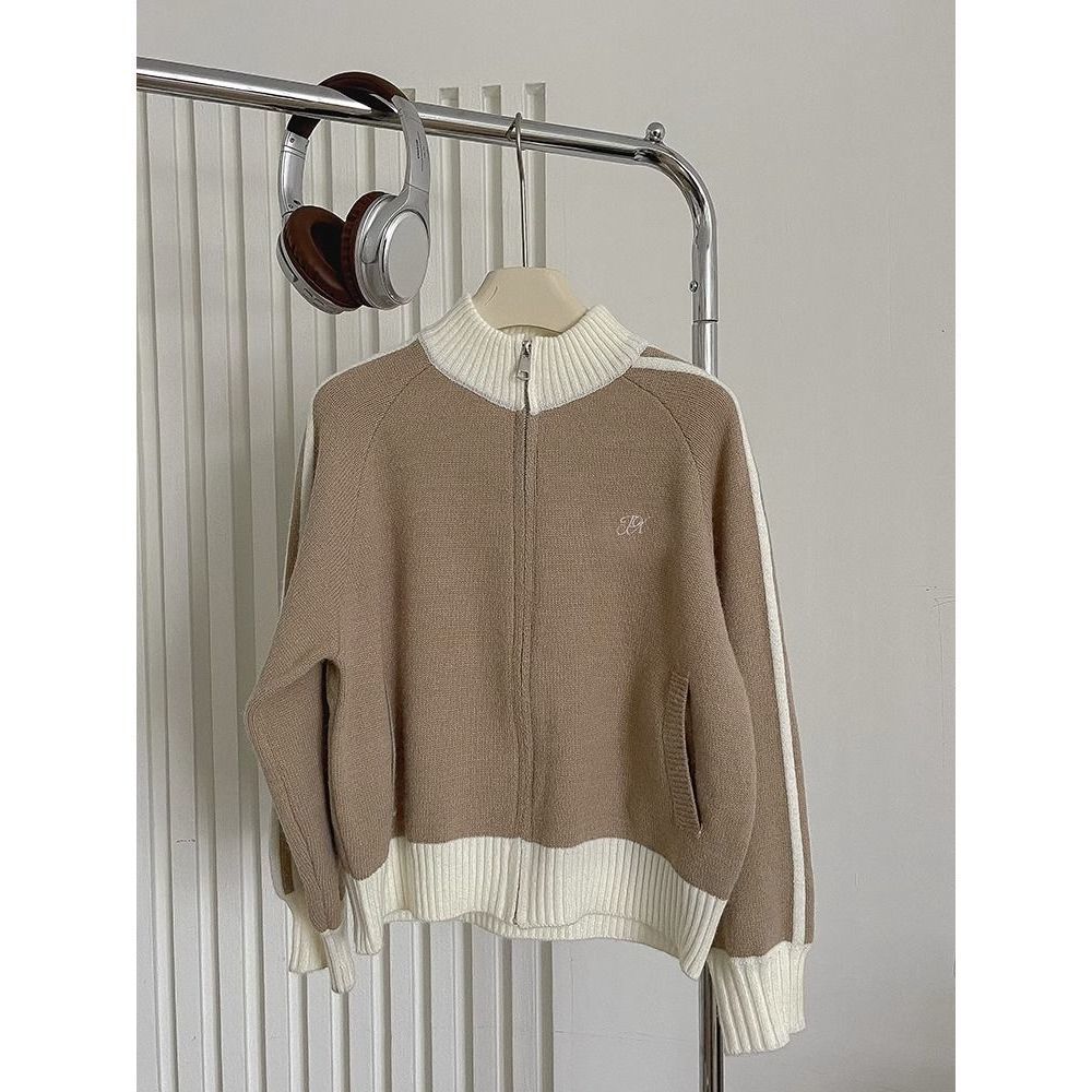 [양고기털] 아메리칸 스타일 배색 긴팔 스탠드 칼라 스웨터 재킷 여성 루즈핏 야구 유니폼 가디건 지퍼 탑스토어 가기