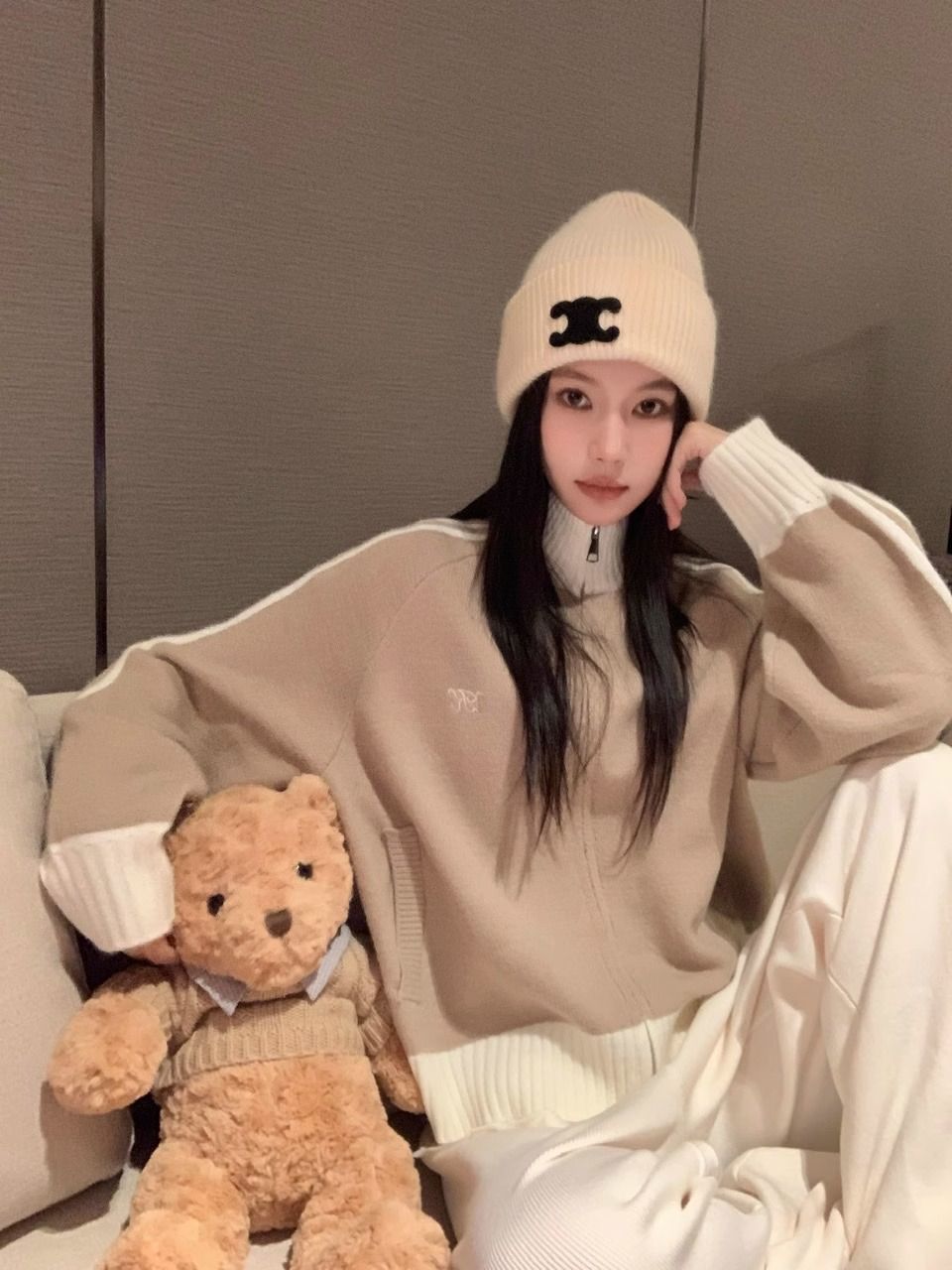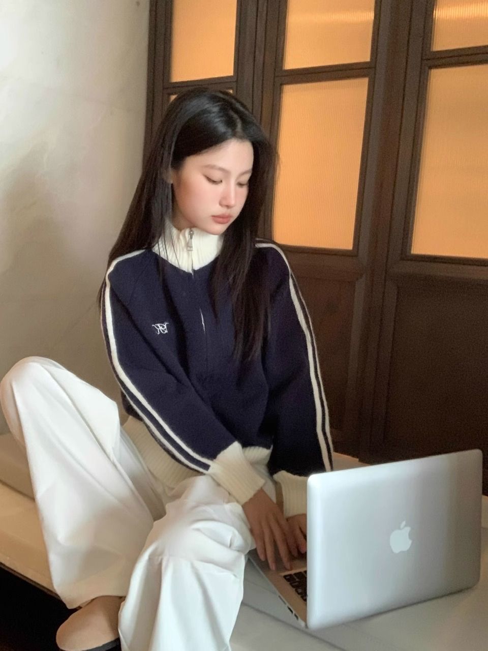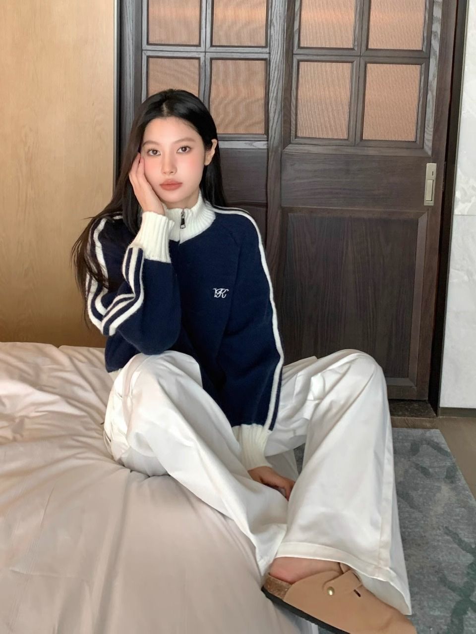 [양고기털] 아메리칸 스타일 배색 긴팔 스탠드 칼라 스웨터 재킷 여성 루즈핏 야구 유니폼 가디건 지퍼 탑스토어 가기