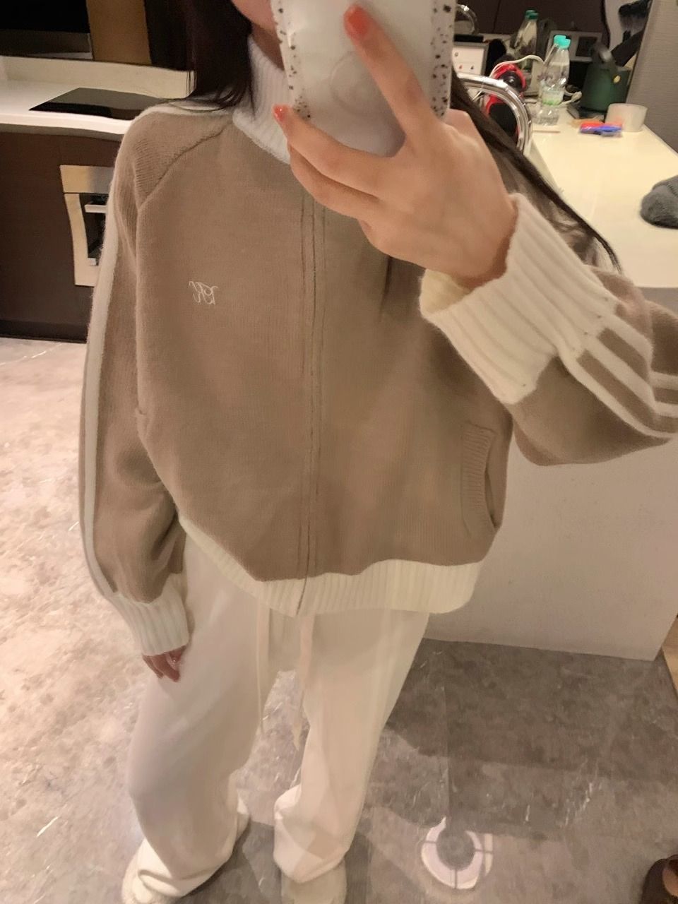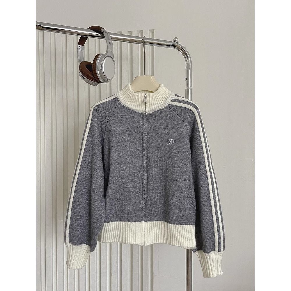 [양고기털] 아메리칸 스타일 배색 긴팔 스탠드 칼라 스웨터 재킷 여성 루즈핏 야구 유니폼 가디건 지퍼 탑