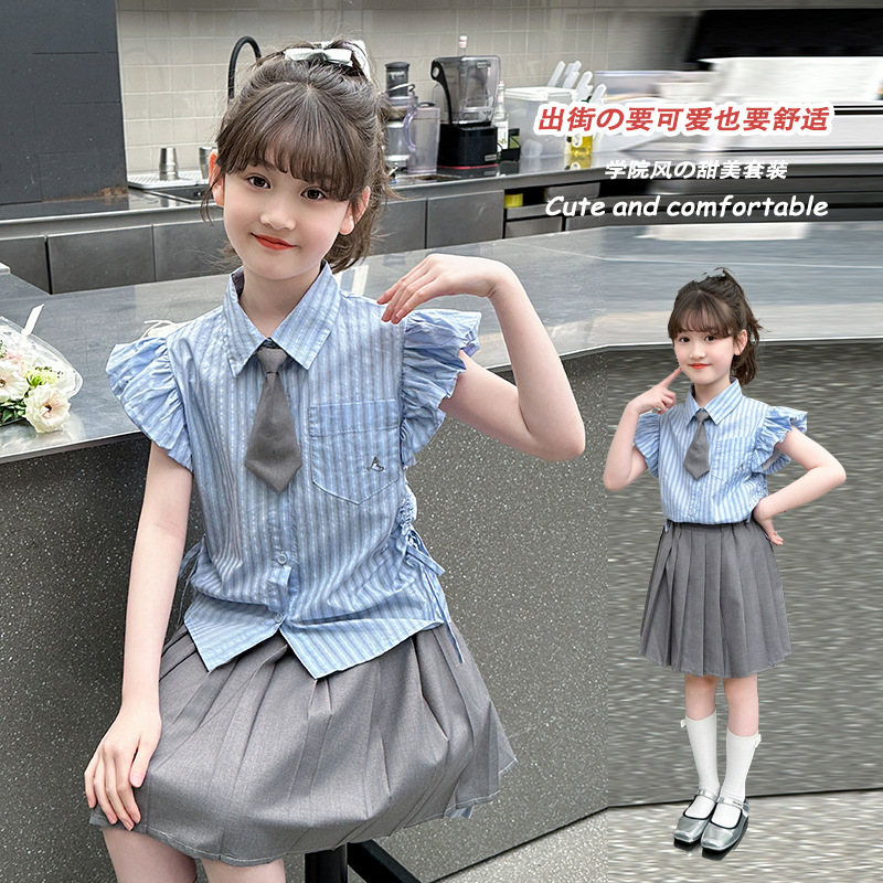 여자 여름 세트 2025 새로운 어린이 세련된 유행 셔츠 주름 치마 큰 어린이 대학 투피스 세트스토어 가기