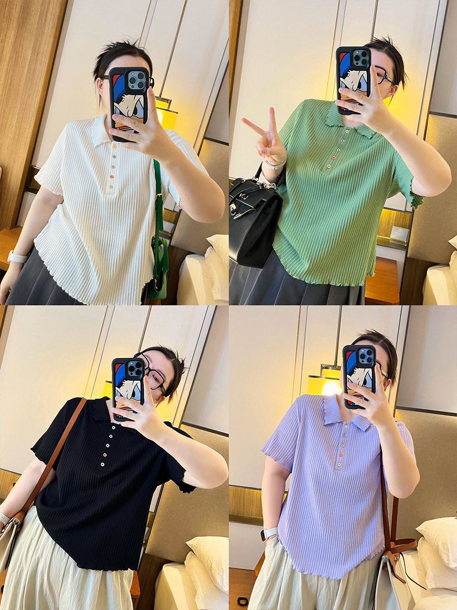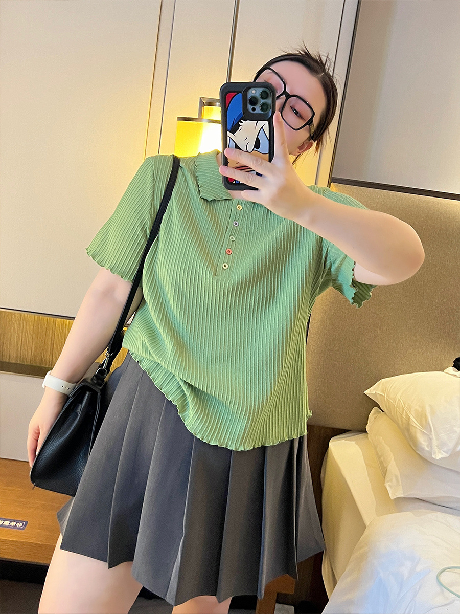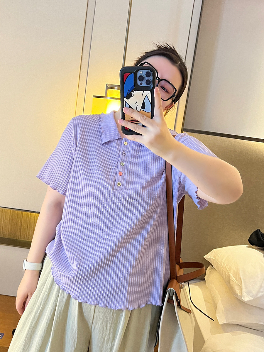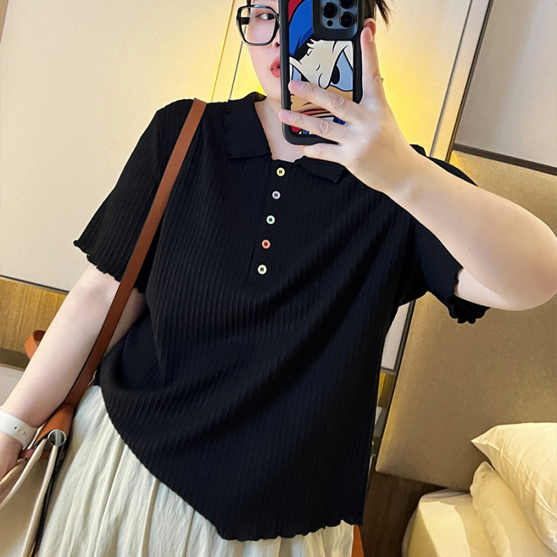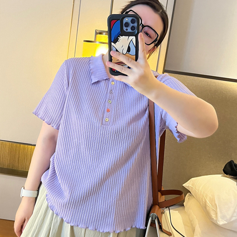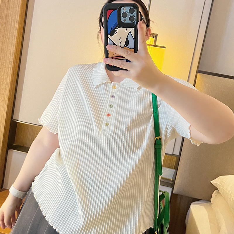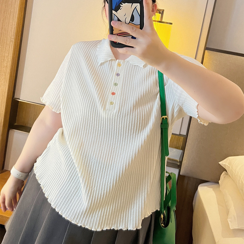 150.00kg 플러스 사이즈 여성 도파민 새로운 반팔 셔츠 여성 느슨한 배꼽 커버 여름 디자인 패션 탑스토어 가기