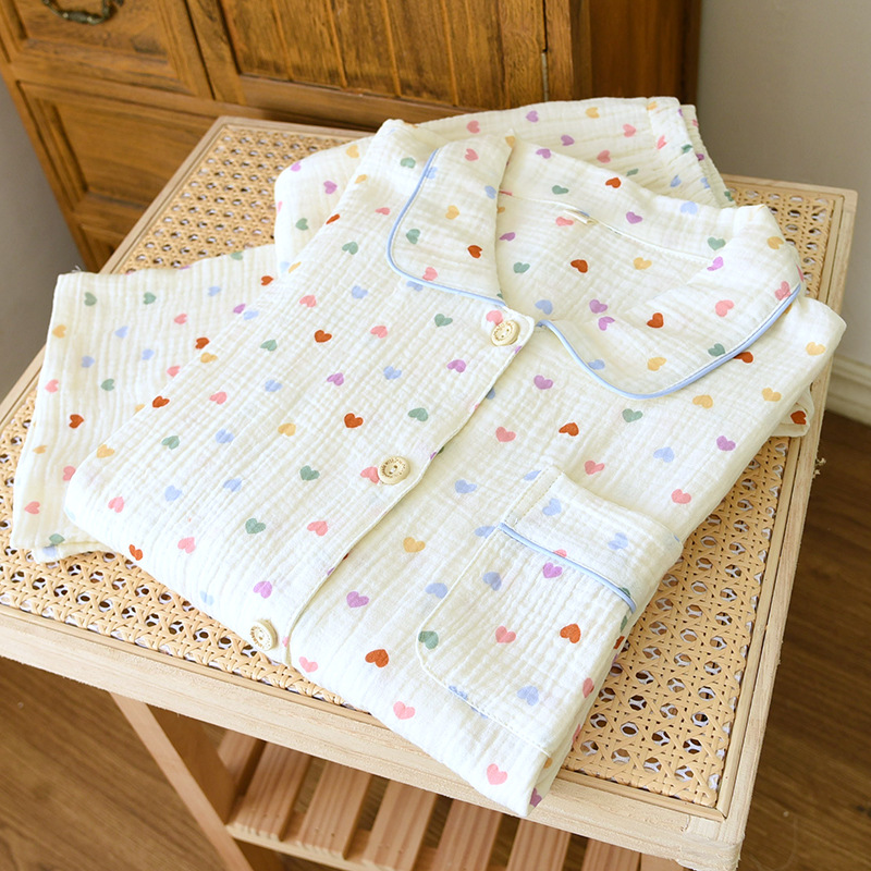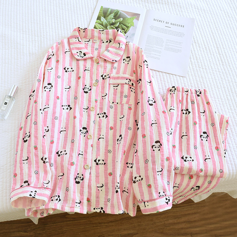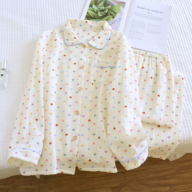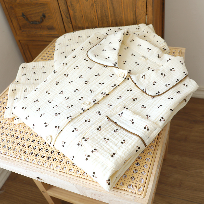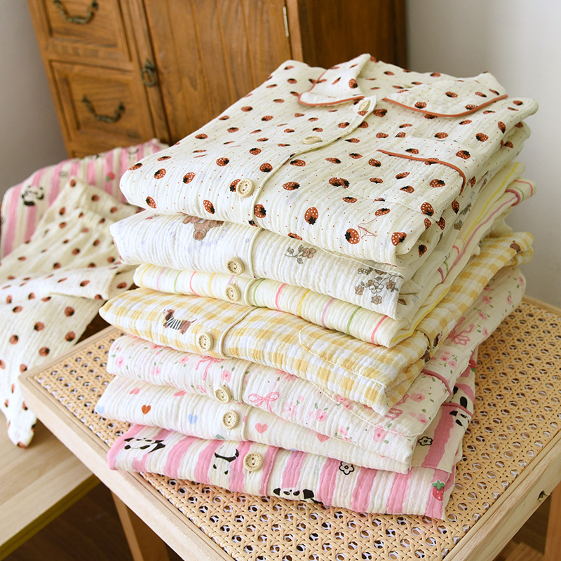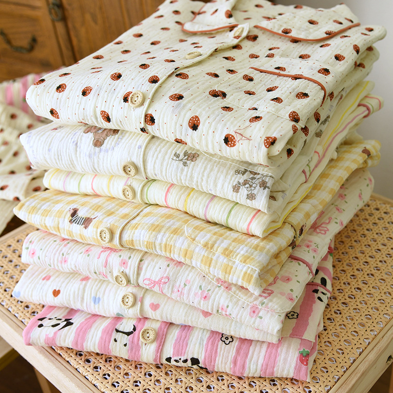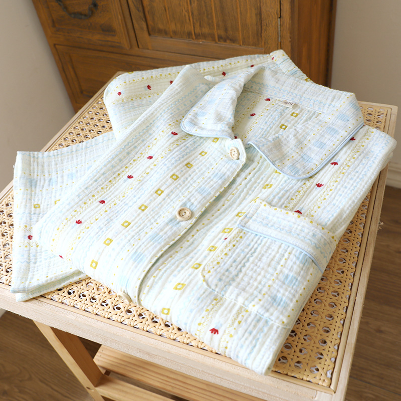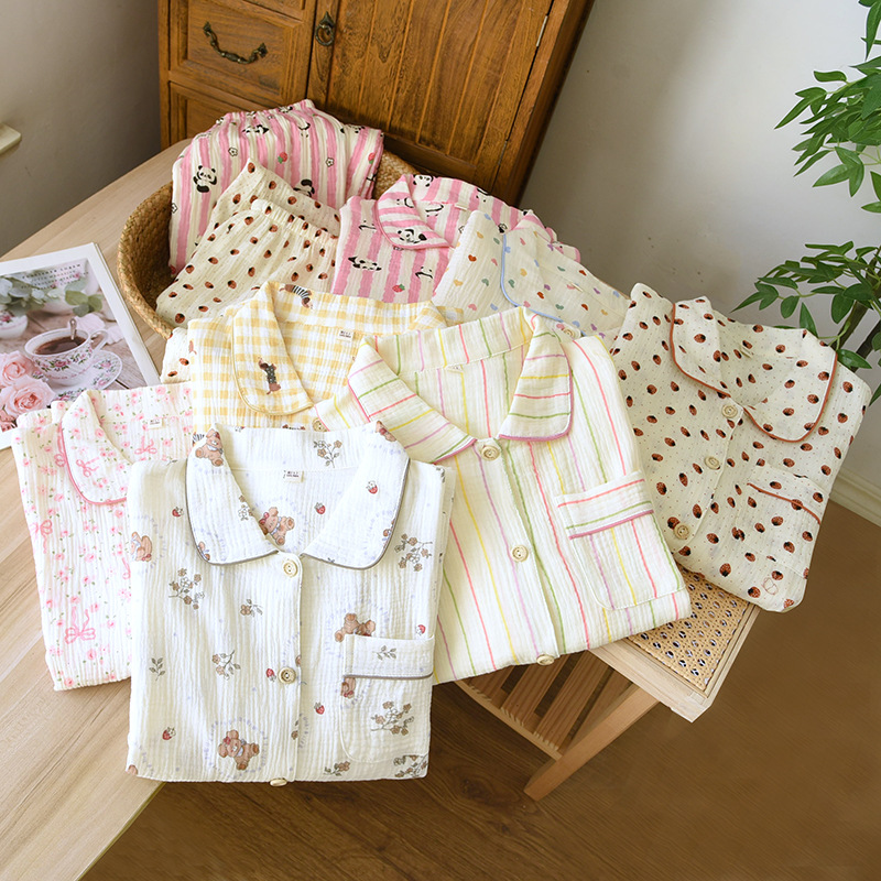 코튼 베이비 더블 레이어 크레이프 여성 홈 의류 잠옷 세트 캐주얼 통기성 얇은 느슨한 턴 업 칼라
