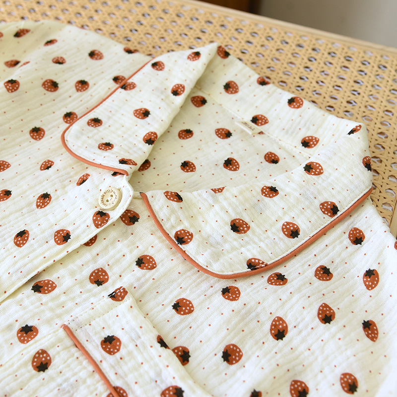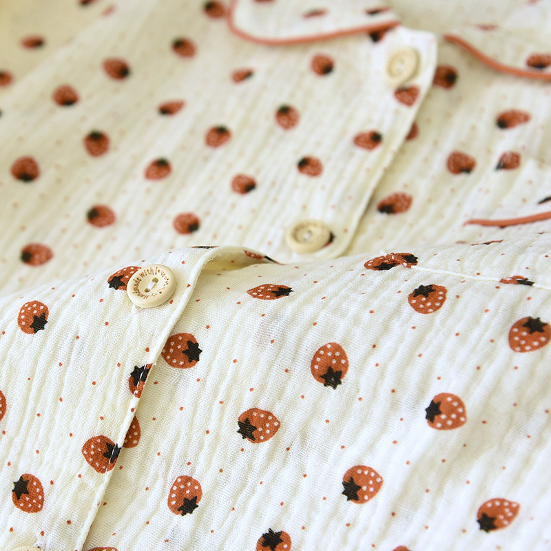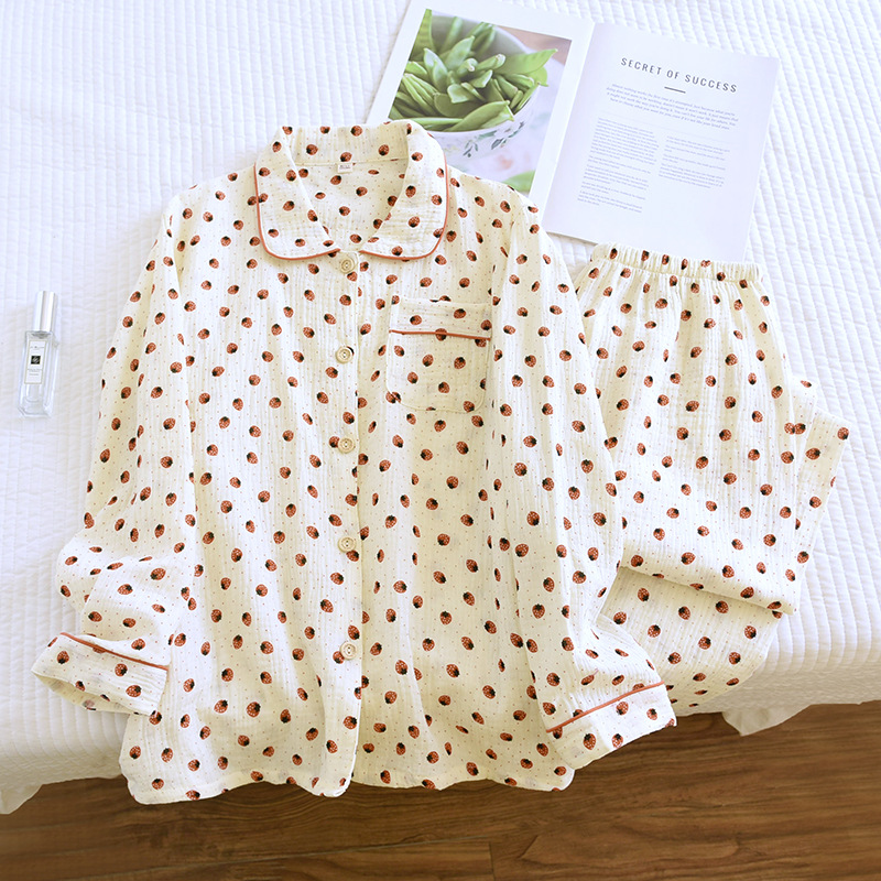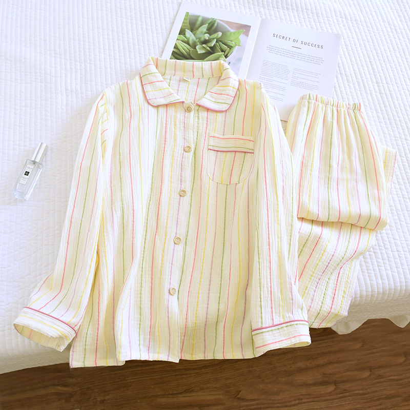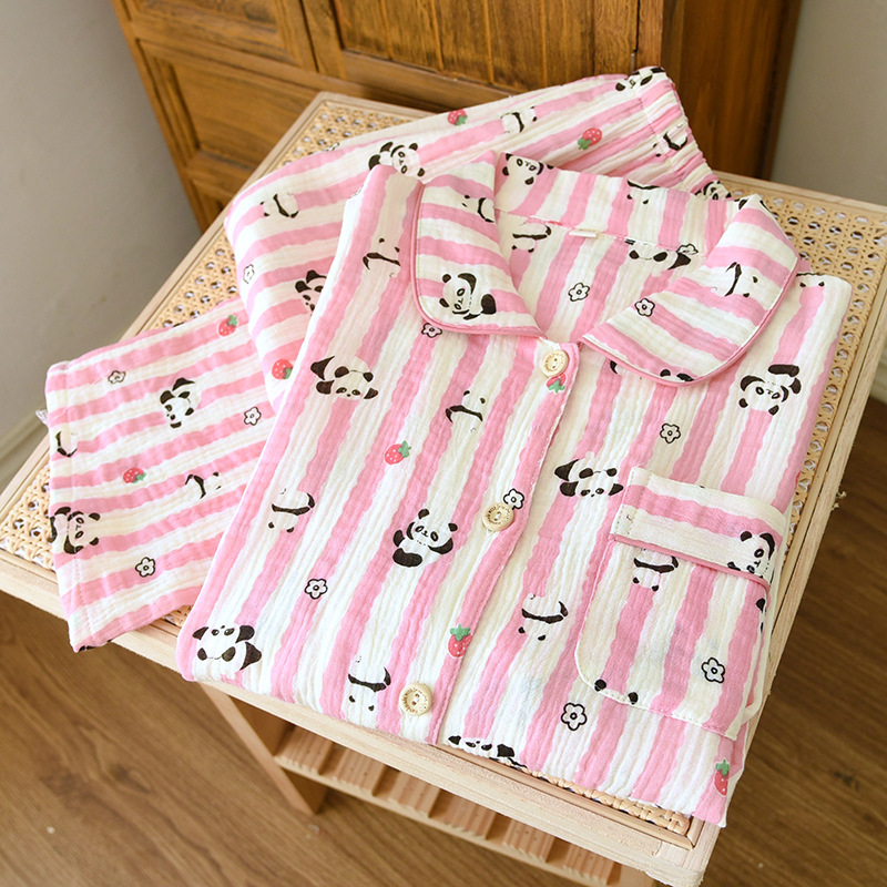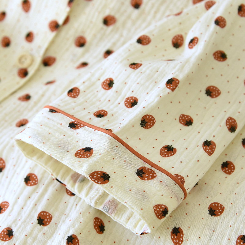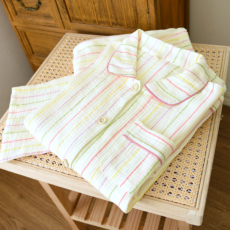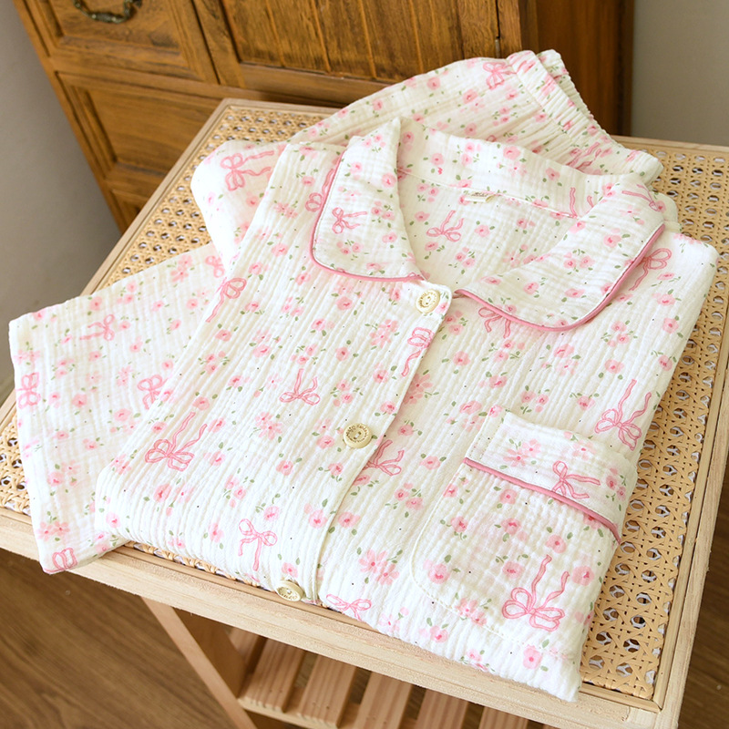 코튼 베이비 더블 레이어 크레이프 여성 홈 의류 잠옷 세트 캐주얼 통기성 얇은 느슨한 턴 업 칼라