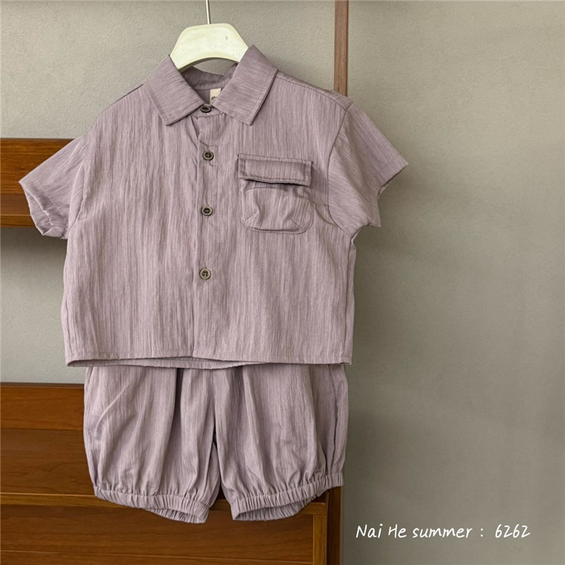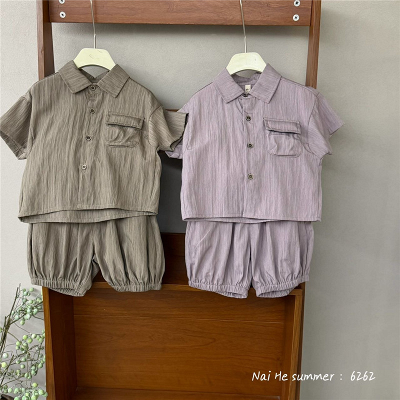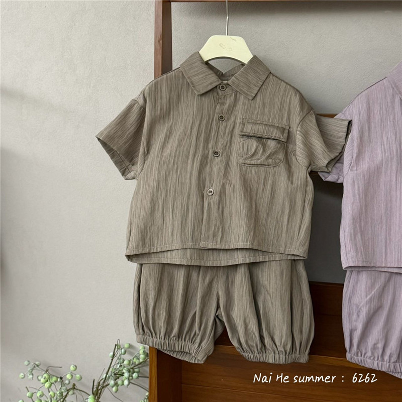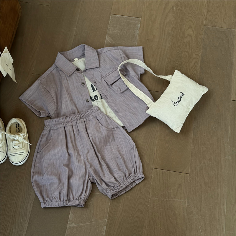 25 새로운 여름 스타일 어린이 한국 스타일 소년과 소녀를위한 세련된 세로 스트립 셔츠 반팔 반바지 투피스 양복 유행