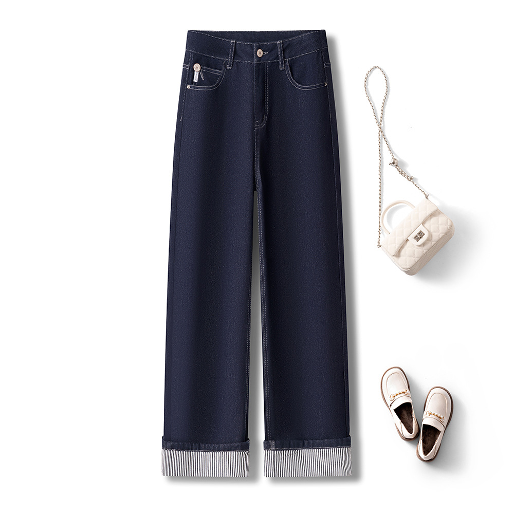 다크 블루 턴 업 스트레이트 텐셀 청바지 여자 2025 년 봄 새로운 높은 허리 좁은 넓은 다리 바지 자른 바지