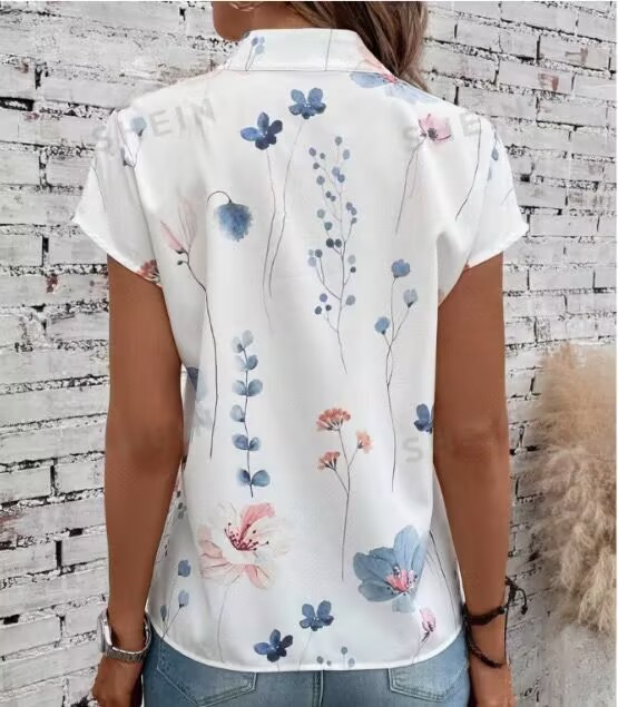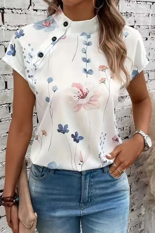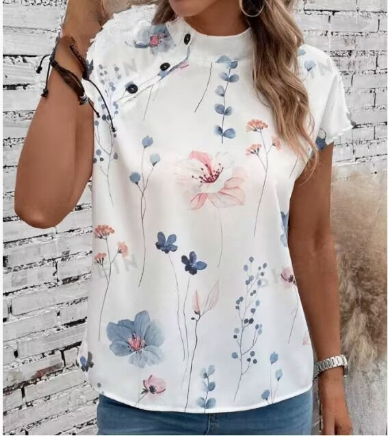 2025 여름 국경 간 새로운 AliExpress 3 버튼 스탠드 칼라 프린트 셔츠 여성용스토어 가기