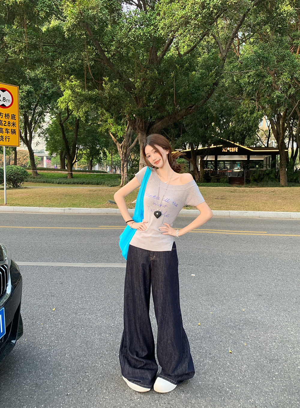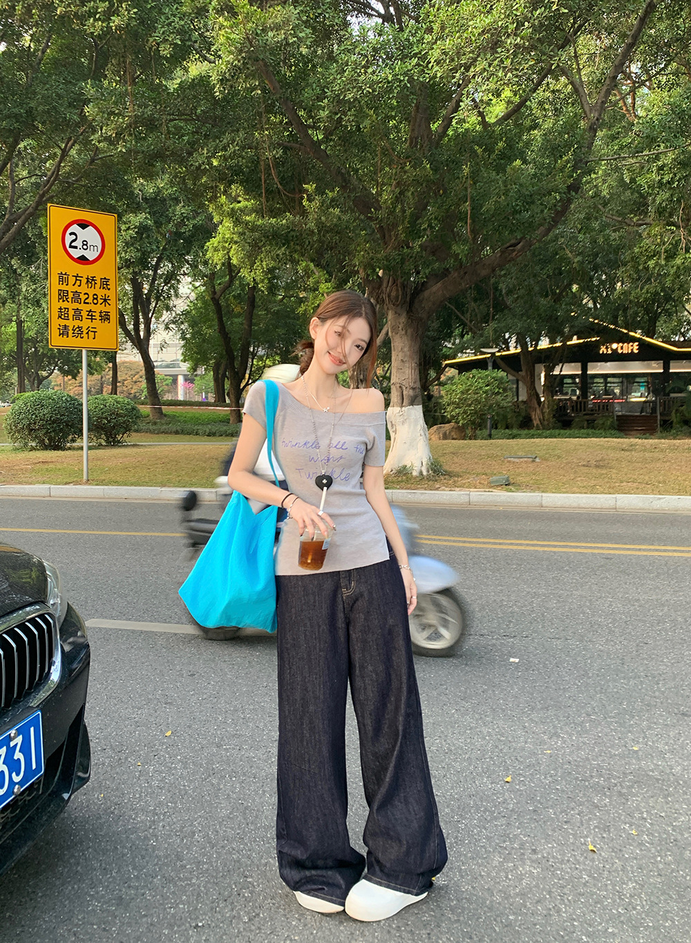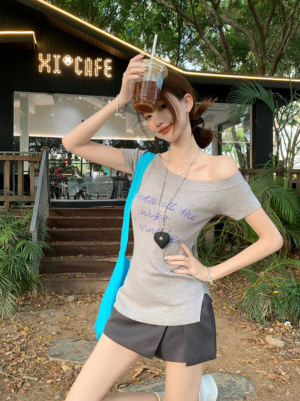 순수한 욕망 스타일 어깨 반팔 티셔츠 여성 2025 년 여름 새로운 한국 달콤한 스파이스 소녀 분할 슬림핏 슬림핏 탑인
