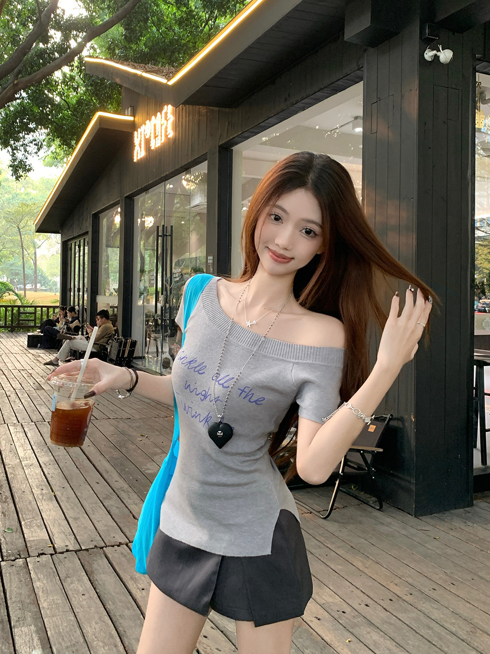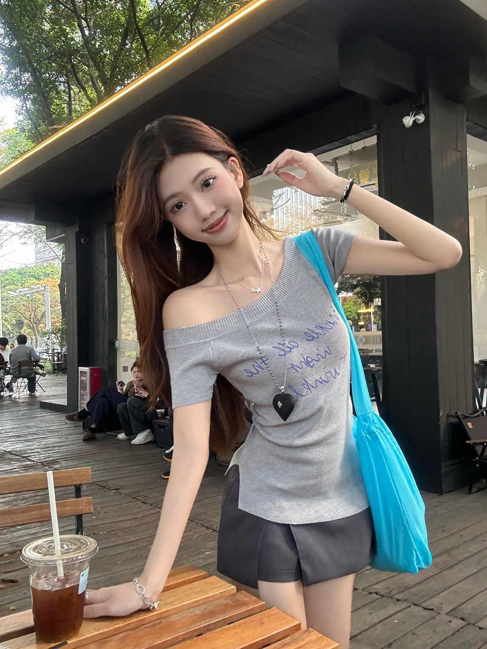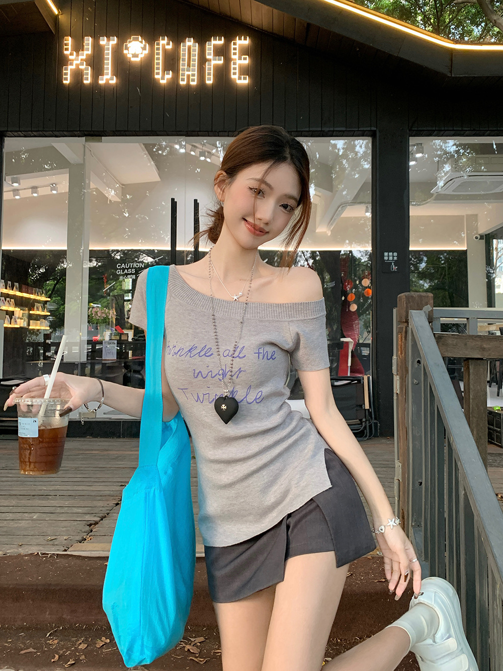 순수한 욕망 스타일 어깨 반팔 티셔츠 여성 2025 년 여름 새로운 한국 달콤한 스파이스 소녀 분할 슬림핏 슬림핏 탑인스토어 가기