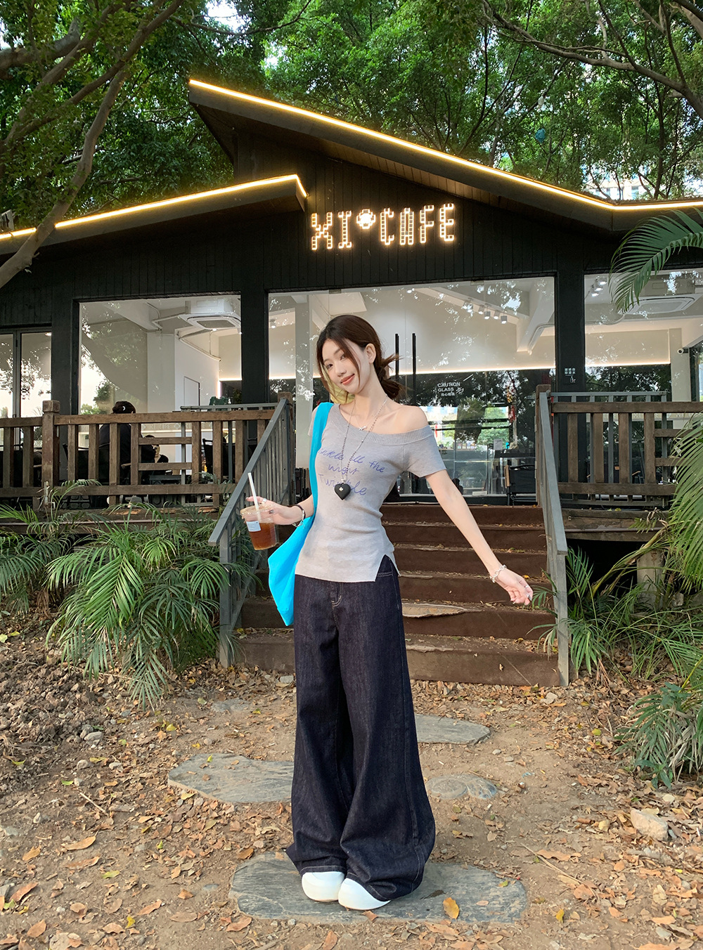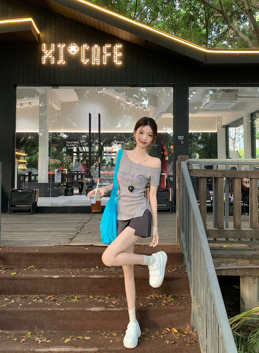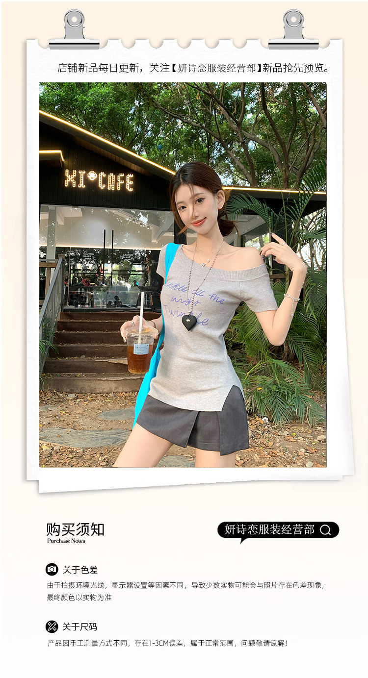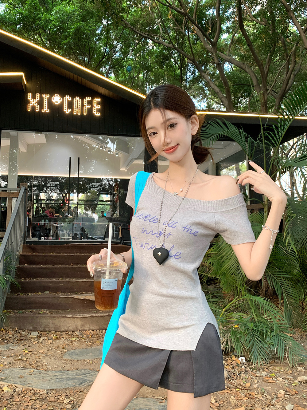순수한 욕망 스타일 어깨 반팔 티셔츠 여성 2025 년 여름 새로운 한국 달콤한 스파이스 소녀 분할 슬림핏 슬림핏 탑인스토어 가기