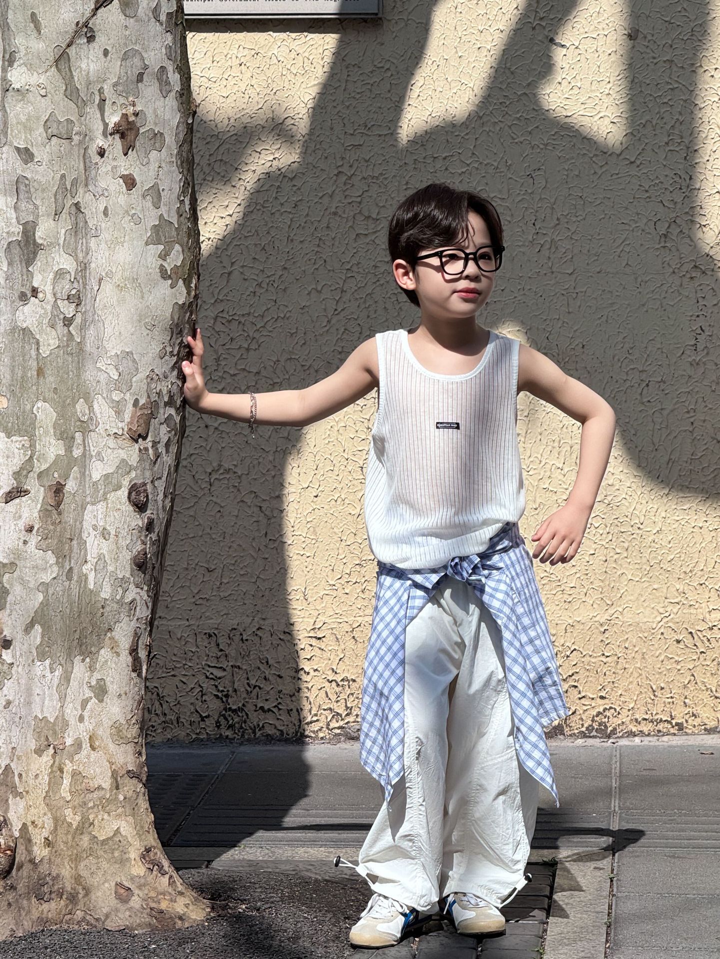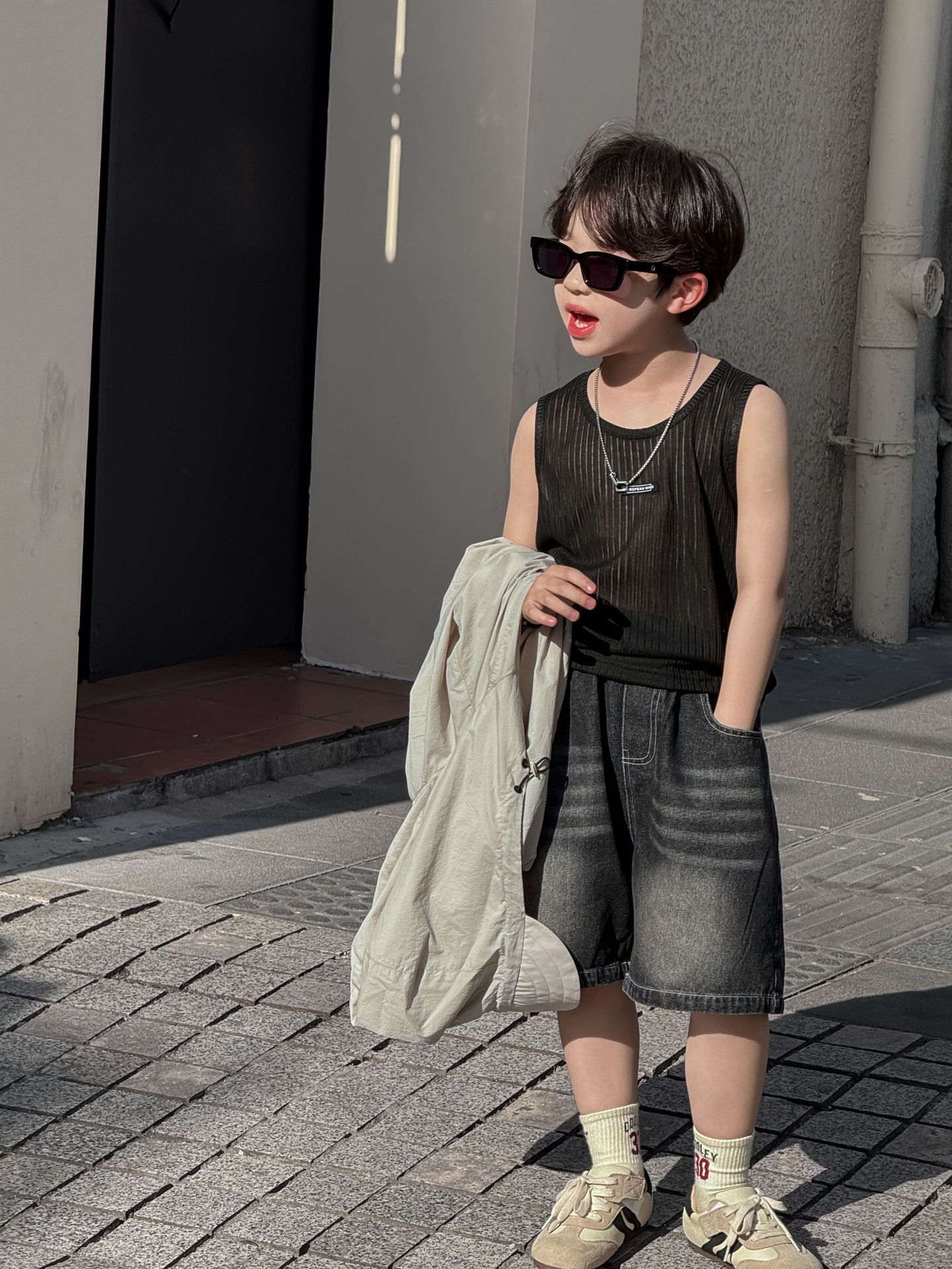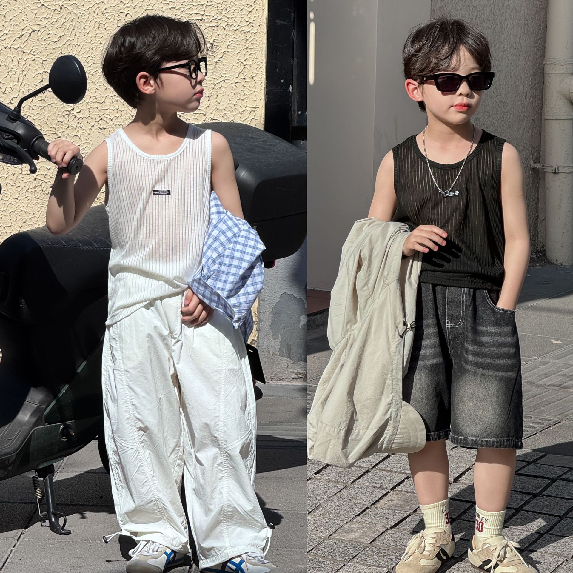 25 중소형 어린이 및 소년을위한 여름 한국 아동복 중공 구덩이 스트립 라벨링 경량 통기성 민소매 조끼 탑스토어 가기