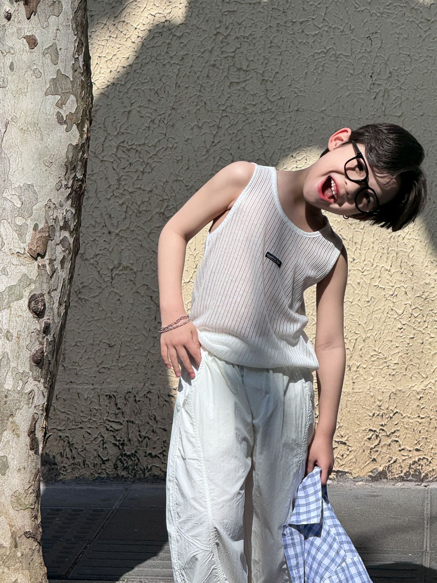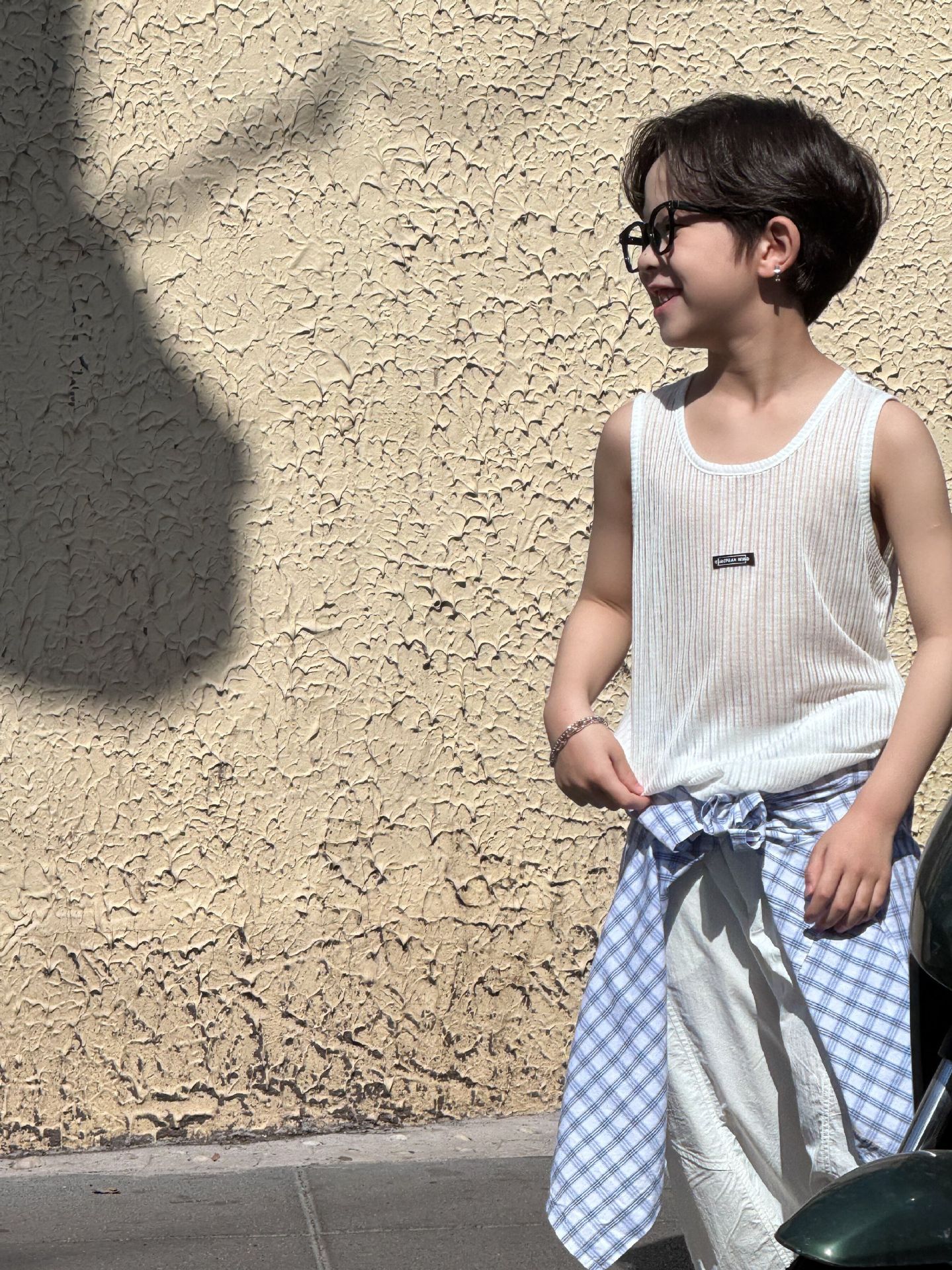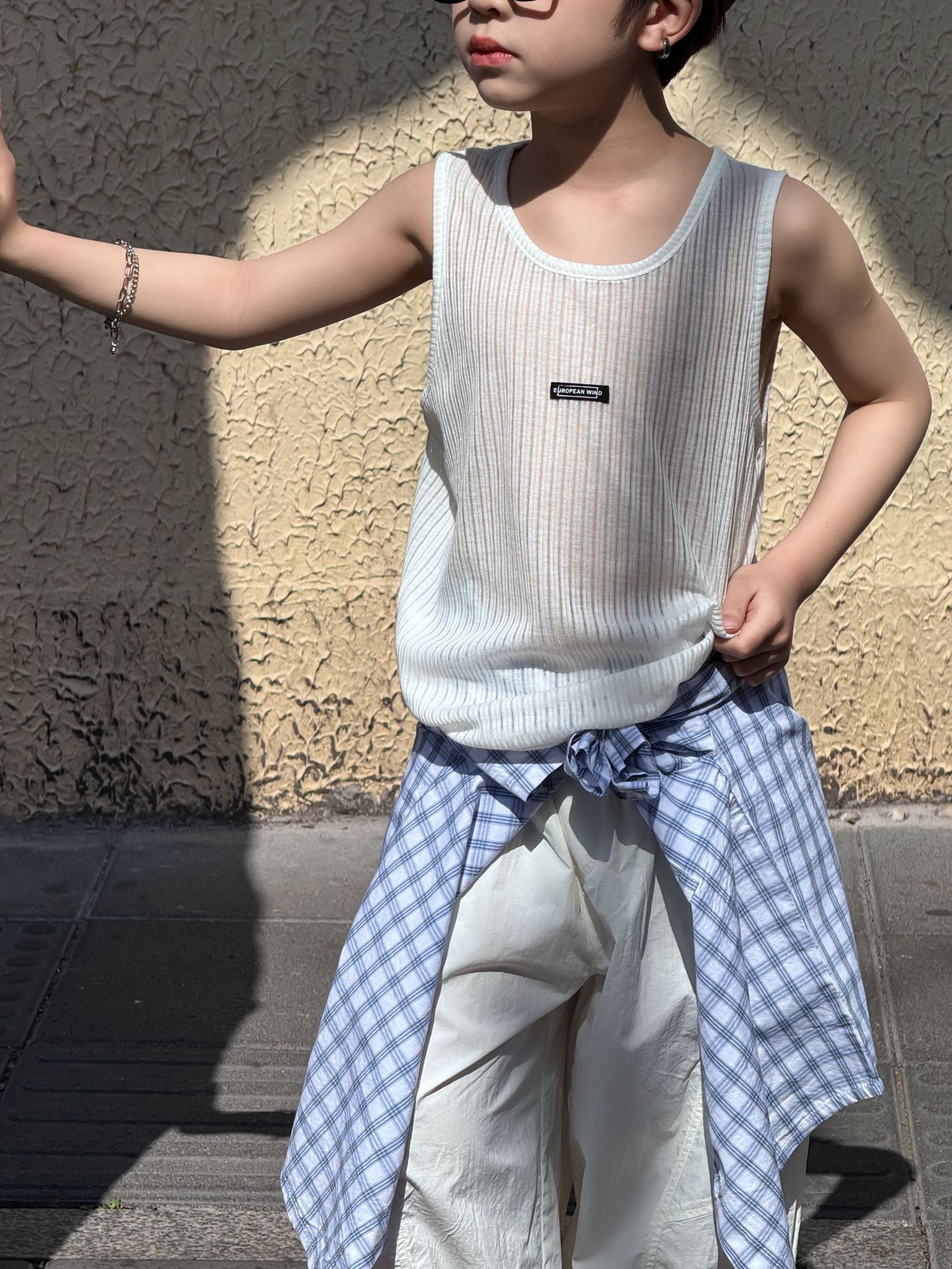 25 중소형 어린이 및 소년을위한 여름 한국 아동복 중공 구덩이 스트립 라벨링 경량 통기성 민소매 조끼 탑