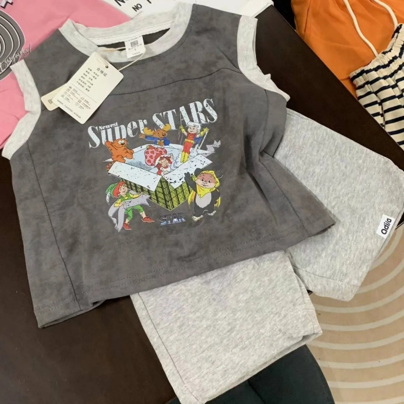 코튼 걸스 민소매 조끼 2025 여름 새 한국 스타일 어린이 캐주얼 탑 반바지 투피스 세트스토어 가기