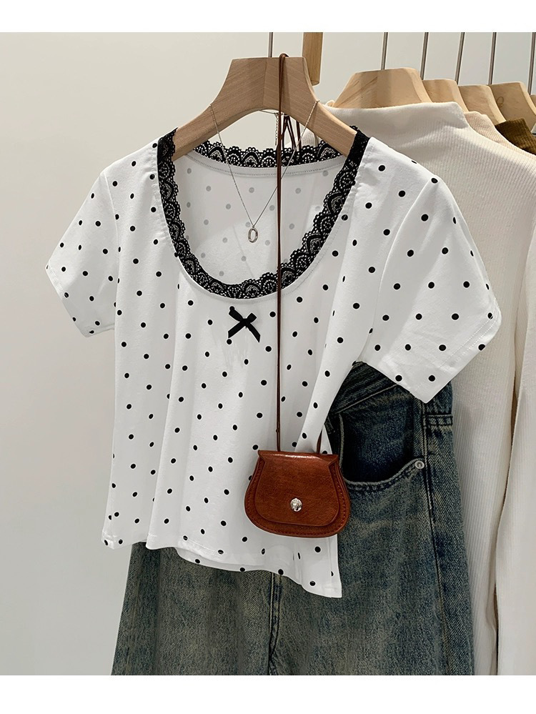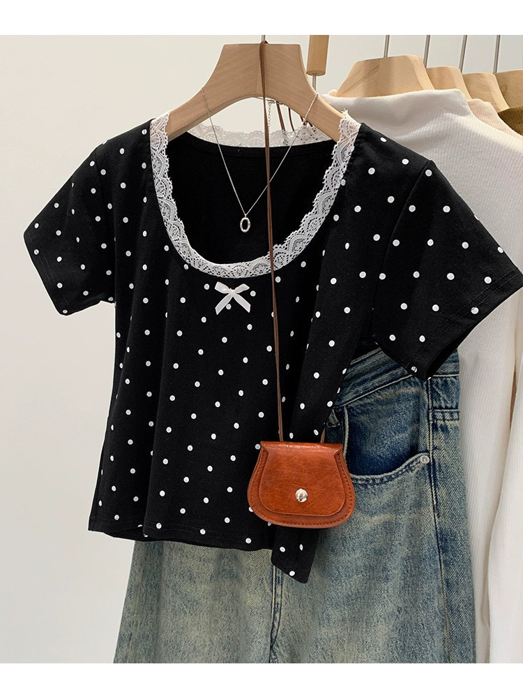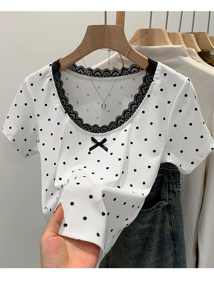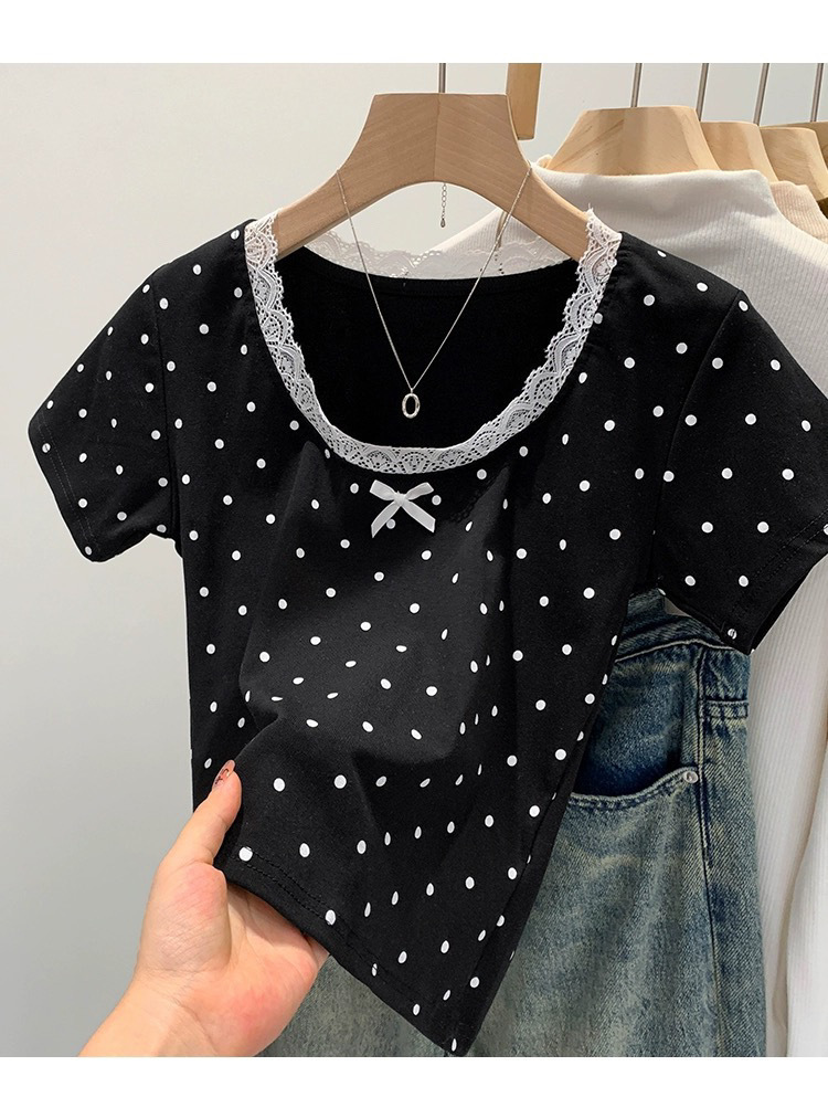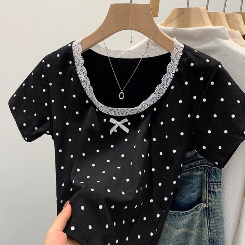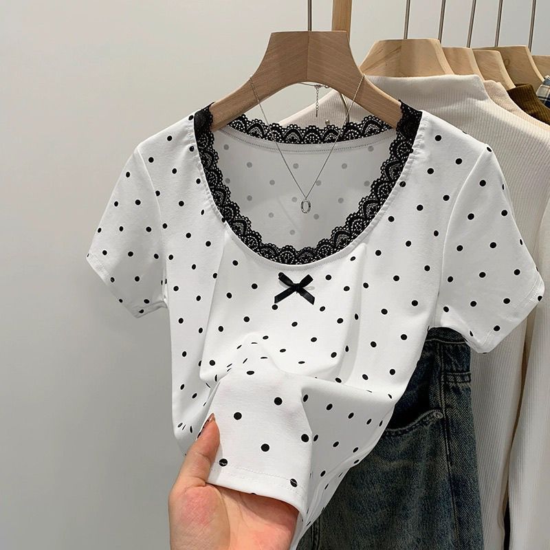 면 달콤한 우아한 웨이브 도트 반팔 셔츠 여성의 여름 2025 새로운 스타일 레이스 레이스 칼라 작은 탑