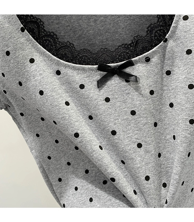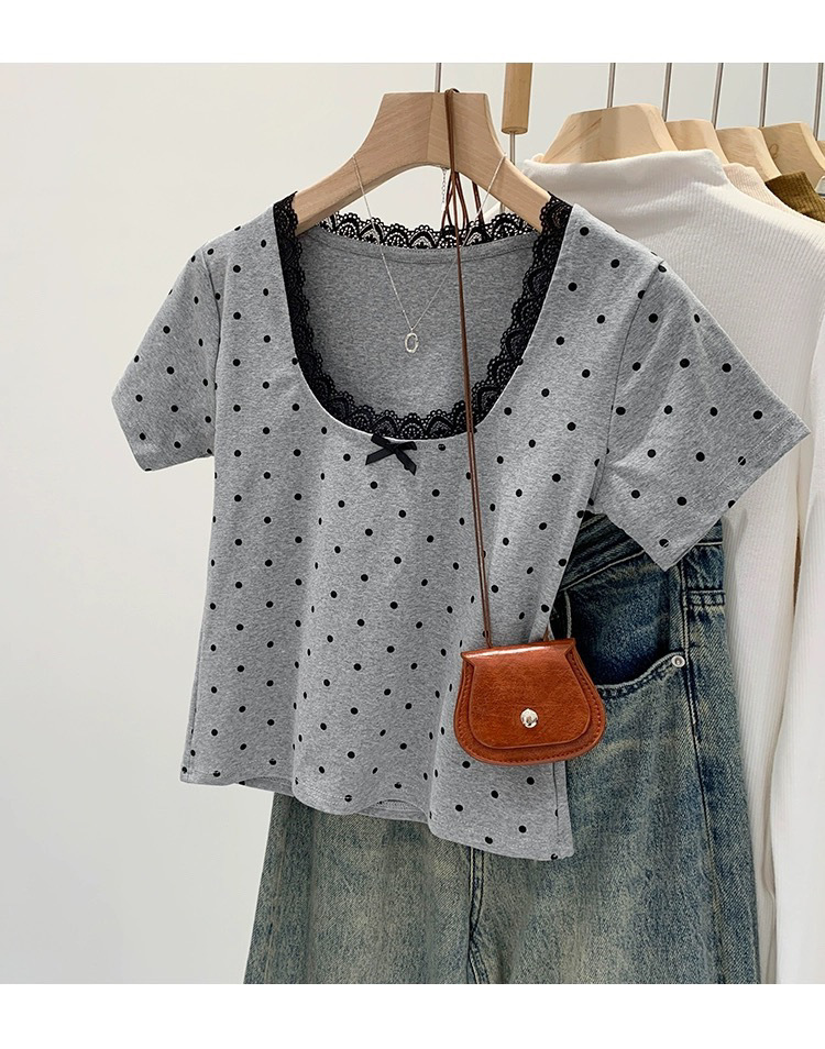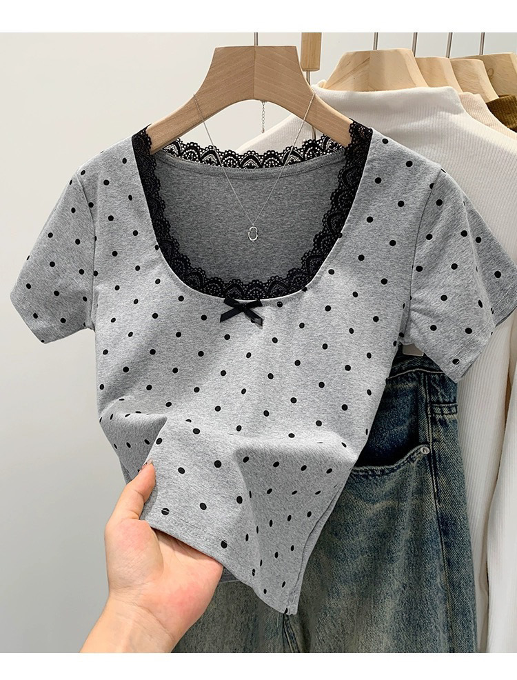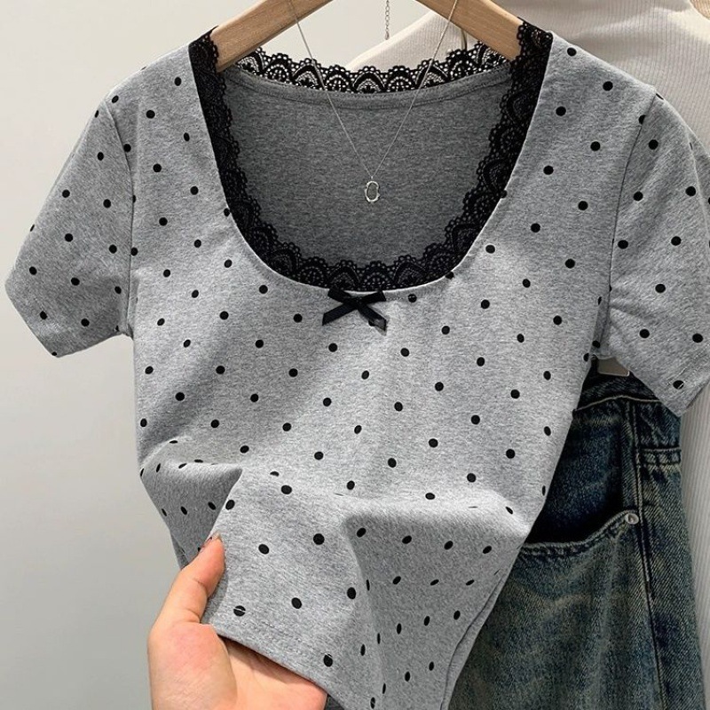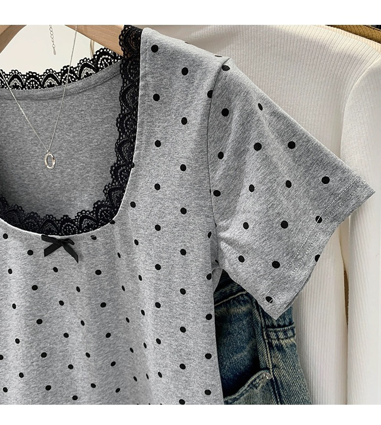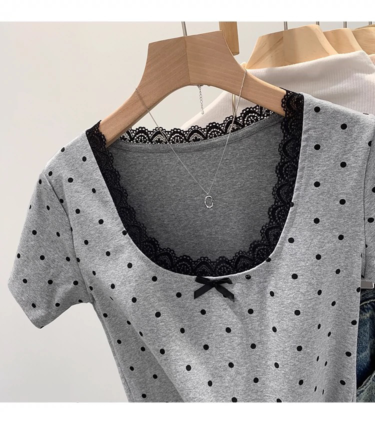 면 달콤한 우아한 웨이브 도트 반팔 셔츠 여성의 여름 2025 새로운 스타일 레이스 레이스 칼라 작은 탑