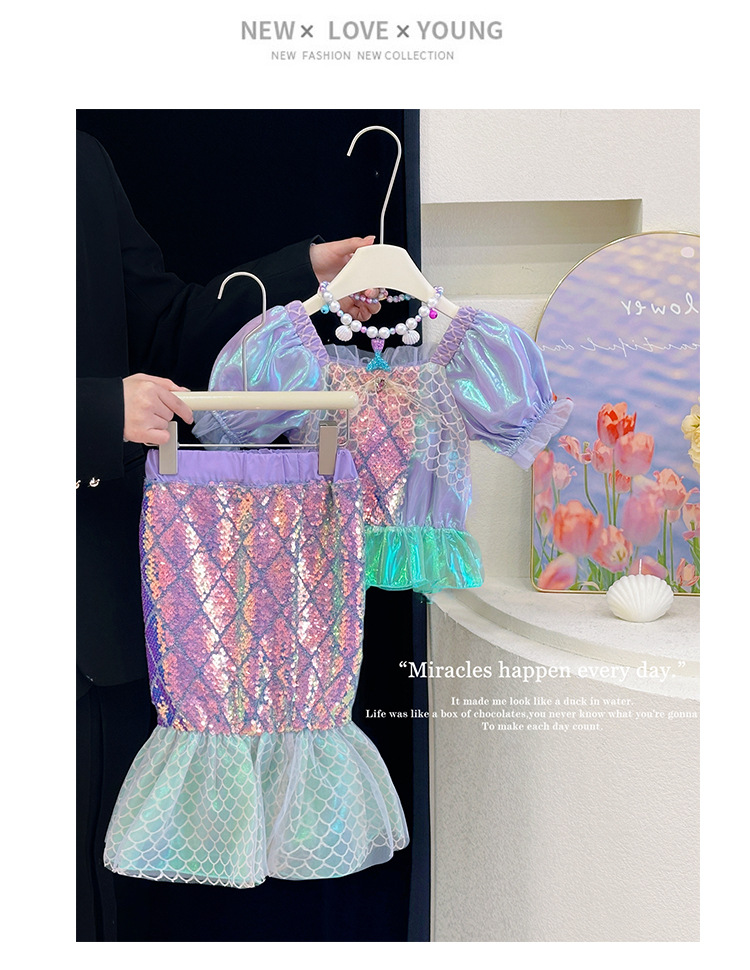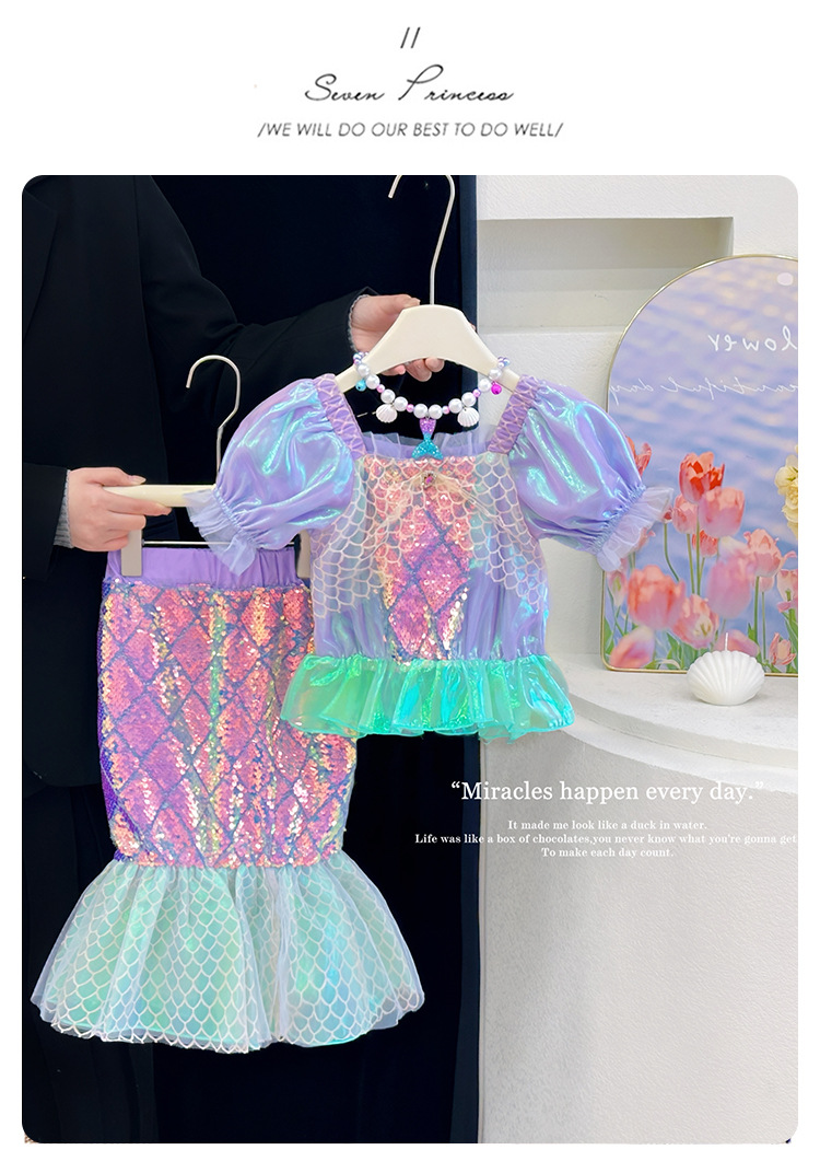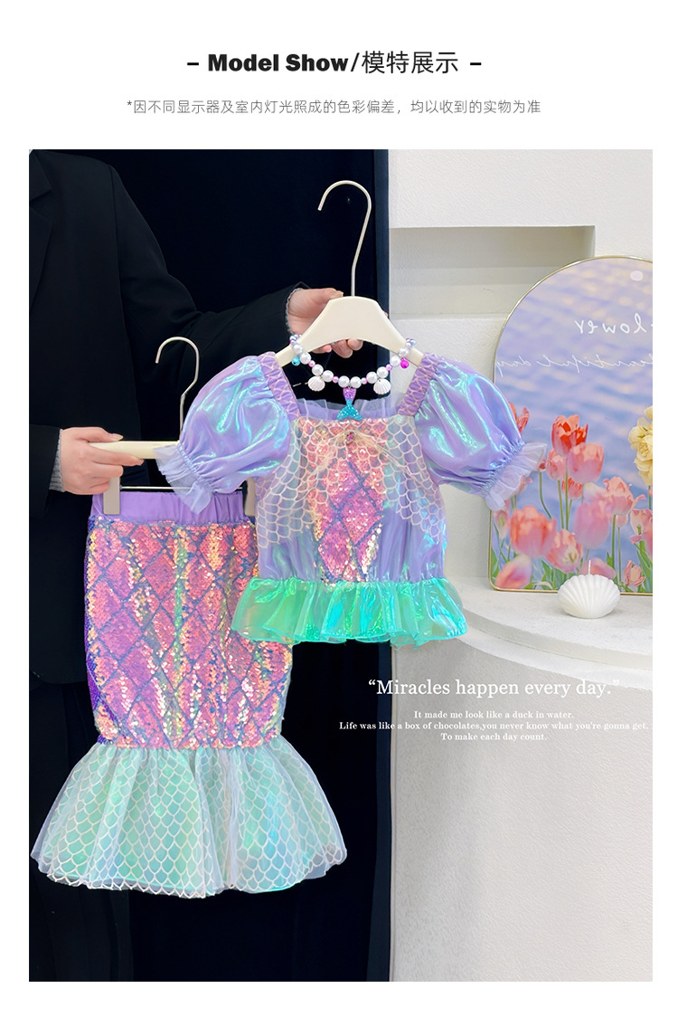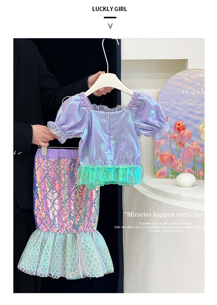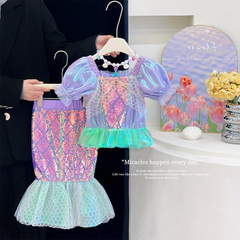 여자 반팔 세트 2025 년 여름 새 어린이 퍼프 소매 탑 스커트 인어 6 일 공연 원피스스토어 가기